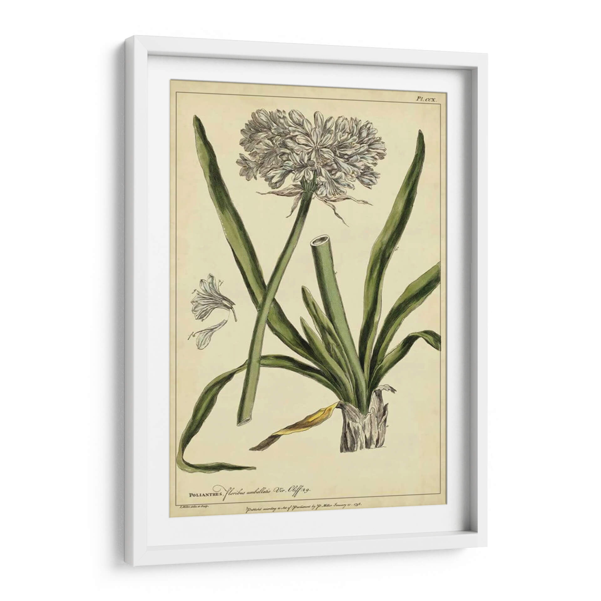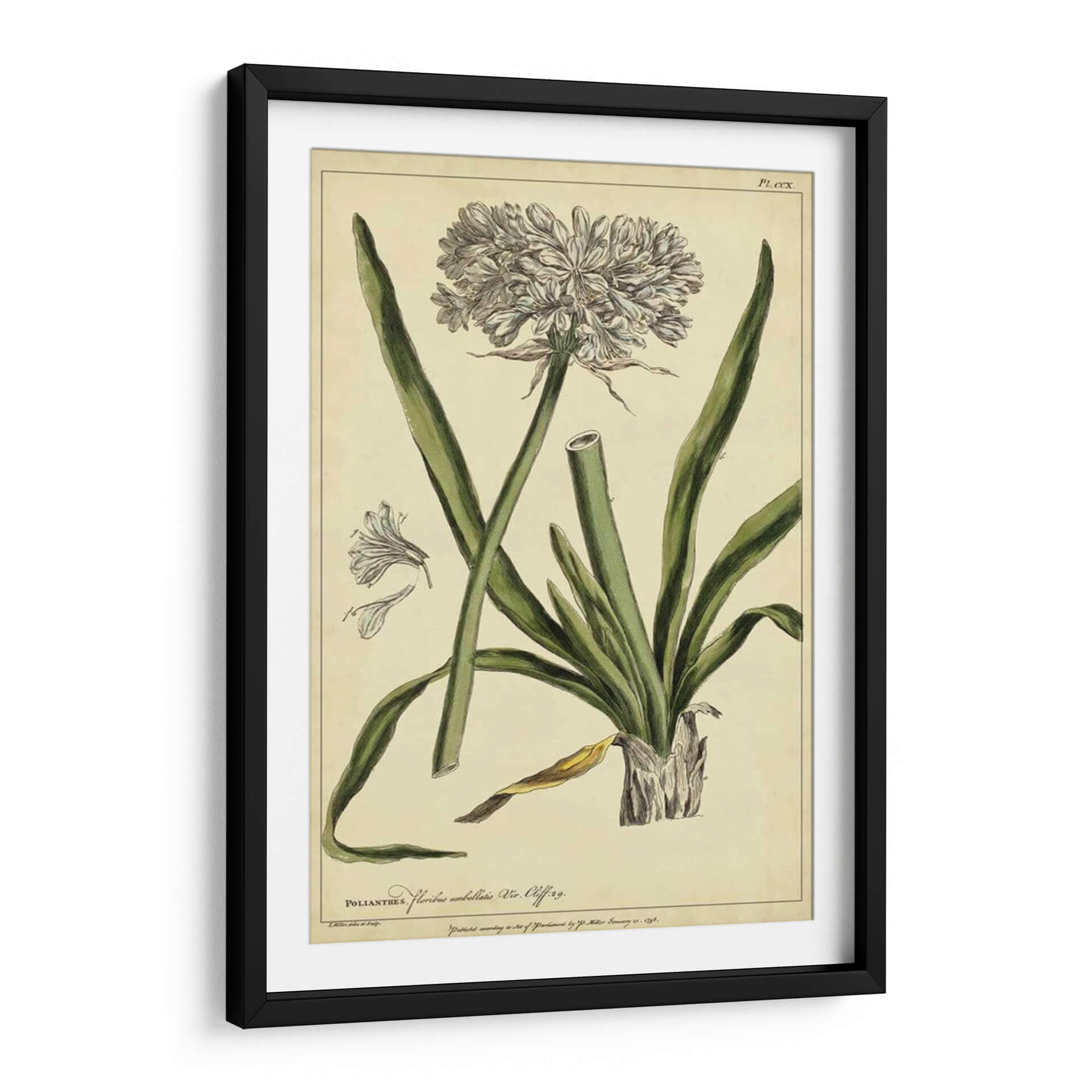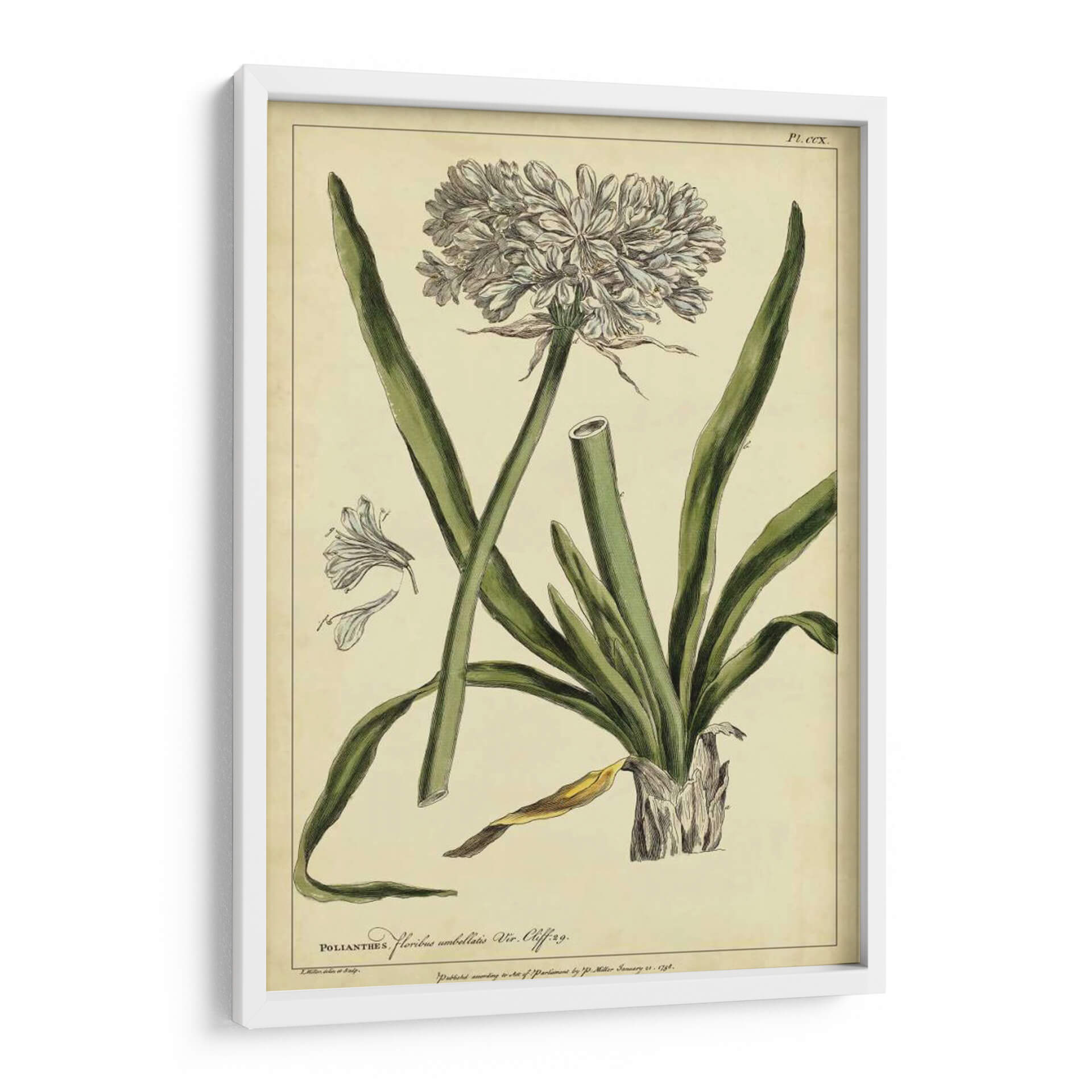 Embellece tu hogar con este exquisito cuadro decorativo botánico, una reproducción fiel de la obra "Poliantes, Pl. Ccx" del artista Philip Miller. Esta pieza evoca la belleza clásica de la ilustración científica, presentando una detallada representación de una flor con sus pétalos intrincados y hojas alargadas, todo sobre un fondo de tono pergamino que le otorga un aire atemporal. La paleta de colores, dominada por verdes suaves y blancos delicados, crea una atmósfera de serenidad y elegancia natural, perfecta para cualquier espacio que busque un toque de sofisticación botánica. Ideal para salas de estar, estudios o incluso oficinas, este cuadro decorativo de estilo vintage aportará un aire de refinamiento y conexión con la naturaleza. Su composición equilibrada y el detalle artístico lo convierten en un punto focal encantador, invitando a la contemplación y añadiendo una dimensión de historia natural a tu decoración. Una elección perfecta para amantes del arte botánico y aquellos que aprecian la belleza de la flora representada con maestría y precisión.