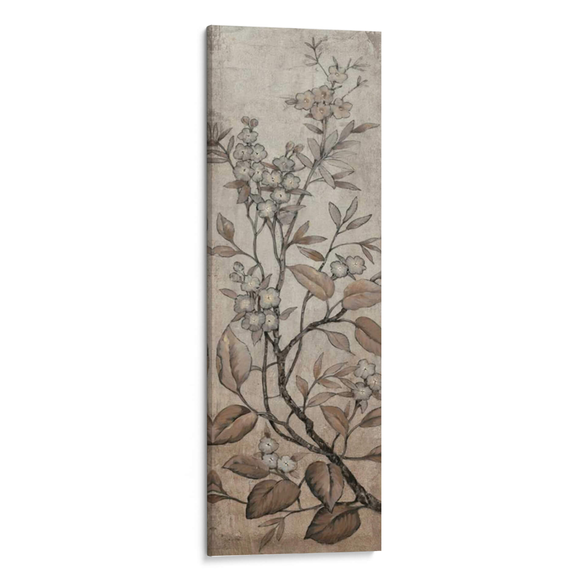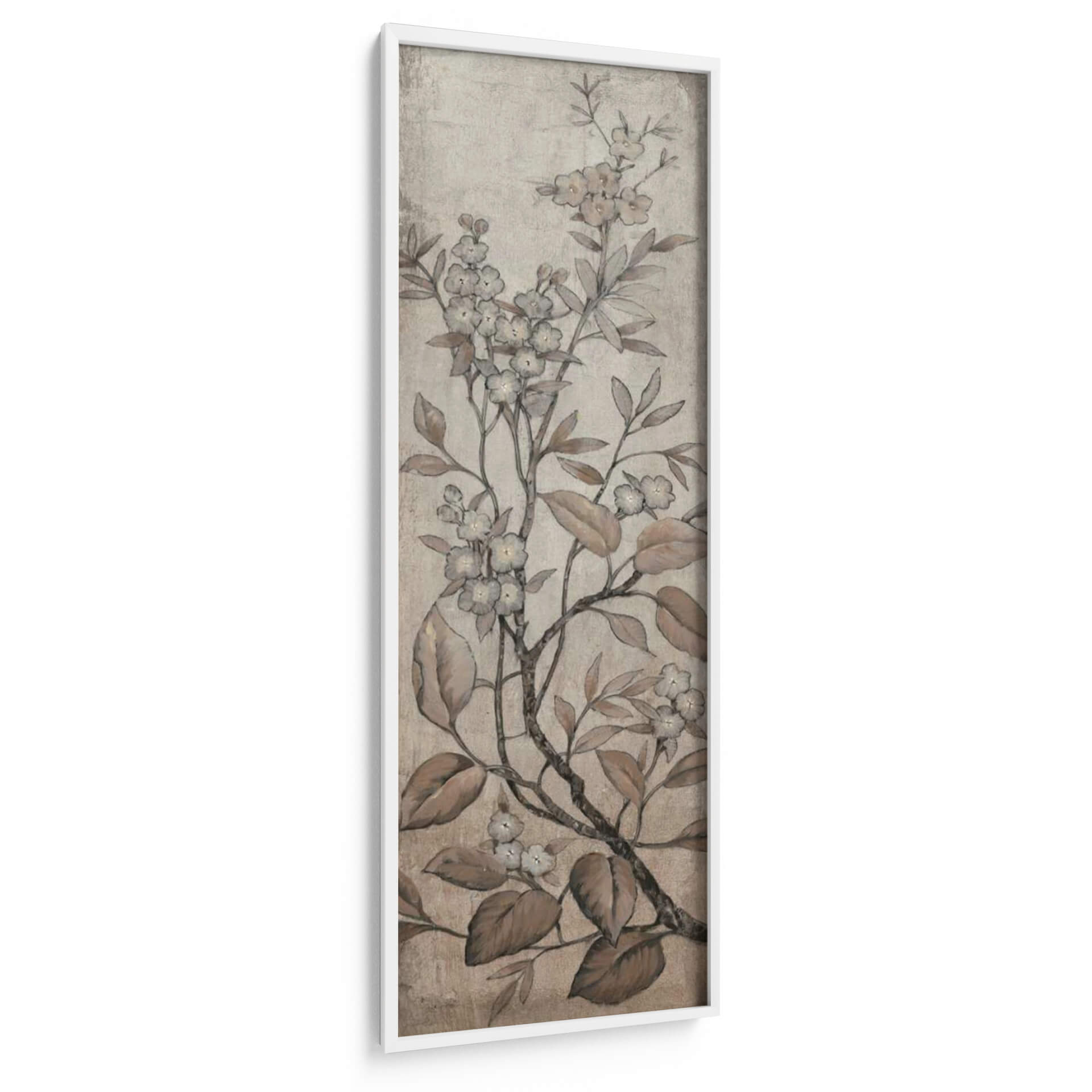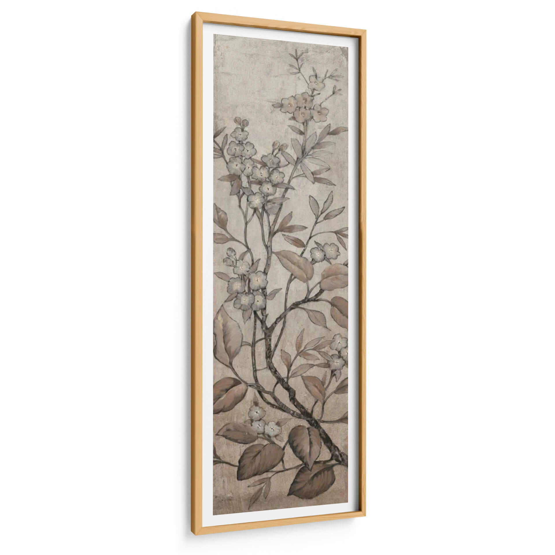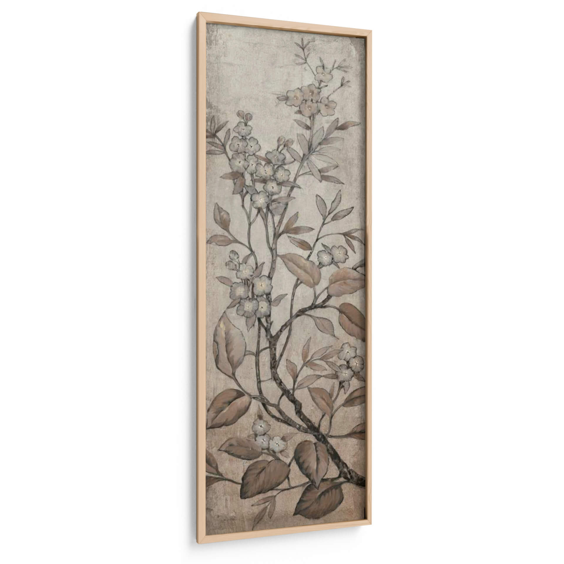 Embellece tu hogar con la delicadeza y el encanto atemporal de "Rama Y Flores I", una obra de arte original del reconocido artista Tim OToole. Este cuadro decorativo captura la esencia serena de la naturaleza a través de una paleta de colores suaves en tonos tierra y ocres, evocando una atmósfera de tranquilidad y sofisticación. La composición vertical, centrada en el delicado crecimiento de una rama floral, presenta pequeños capullos y hojas que se despliegan con gracia sobre un fondo texturizado que recuerda a un lienzo antiguo. El estilo, que fusiona elementos del arte botánico con un toque sutilmente abstracto, lo convierte en una pieza versátil, ideal para complementar una amplia gama de estilos decorativos, desde el clásico hasta el contemporáneo. Imagina este cuadro aportando un aire de calma y elegancia a tu sala de estar, dormitorio o incluso a un espacio de oficina, creando un rincón de inspiración y serenidad. La maestría de OToole en capturar la belleza efímera de las flores en floración te invita a contemplar la armonía del mundo natural. Añade un toque de refinamiento artístico a tu decoración con esta pieza única.