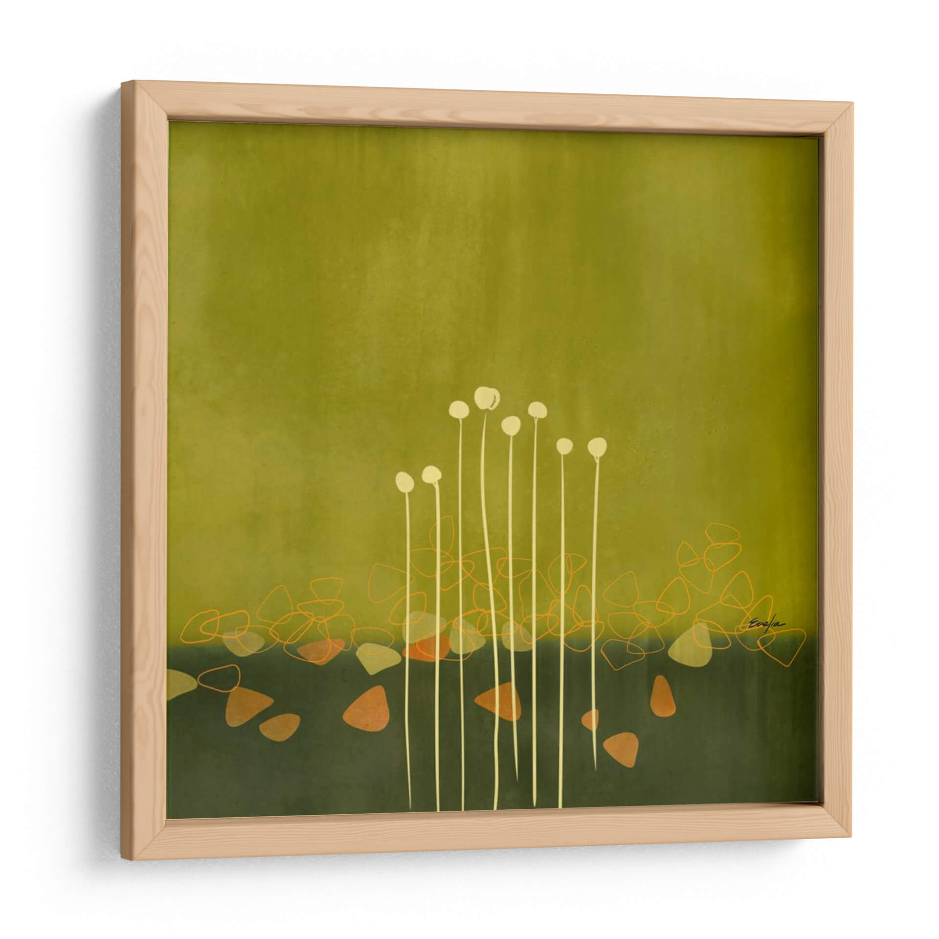 Sumérgete en la serenidad de "Rover Rocas II", una cautivadora obra de arte que evoca la tranquilidad de un paisaje botánico estilizado. La pieza presenta una delicada composición de tallos delgados y esferas luminosas que emergen de un vibrante tapiz de tonos tierra. La paleta de colores, dominada por verdes profundos y ocres cálidos, crea una atmósfera orgánica y acogedora, perfecta para cualquier espacio que busque un toque de naturaleza y sofisticación. El estilo abstracto, con sutiles influencias orgánicas, invita a la contemplación, mientras que las formas geométricas dispersas añaden un dinamismo sutil. Ideal para salas de estar, dormitorios o estudios, este cuadro decorativo transformará tu hogar en un oasis de calma y estilo contemporáneo. La ejecución artística de Evelia Designs captura la esencia de la belleza natural con una elegancia moderna, ofreciendo una pieza que no solo embellece, sino que también inspira paz y reflexión. Añade esta obra maestra a tu colección y experimenta la armonía que aporta a tu entorno.