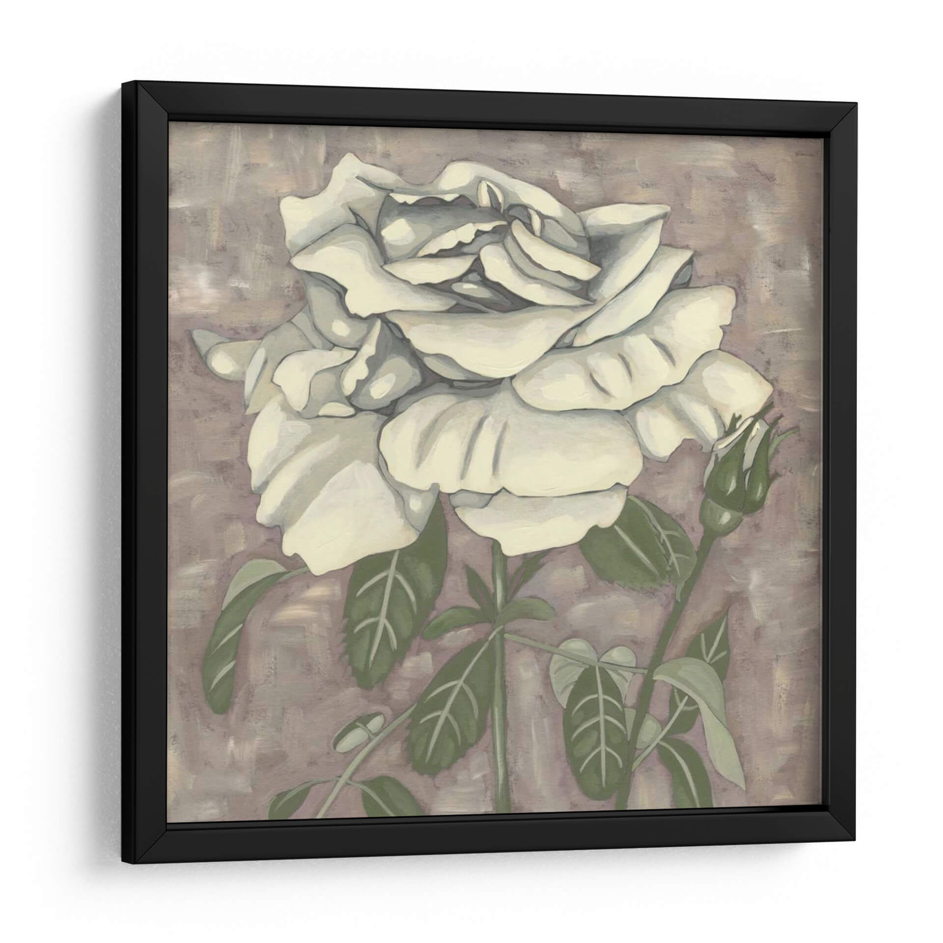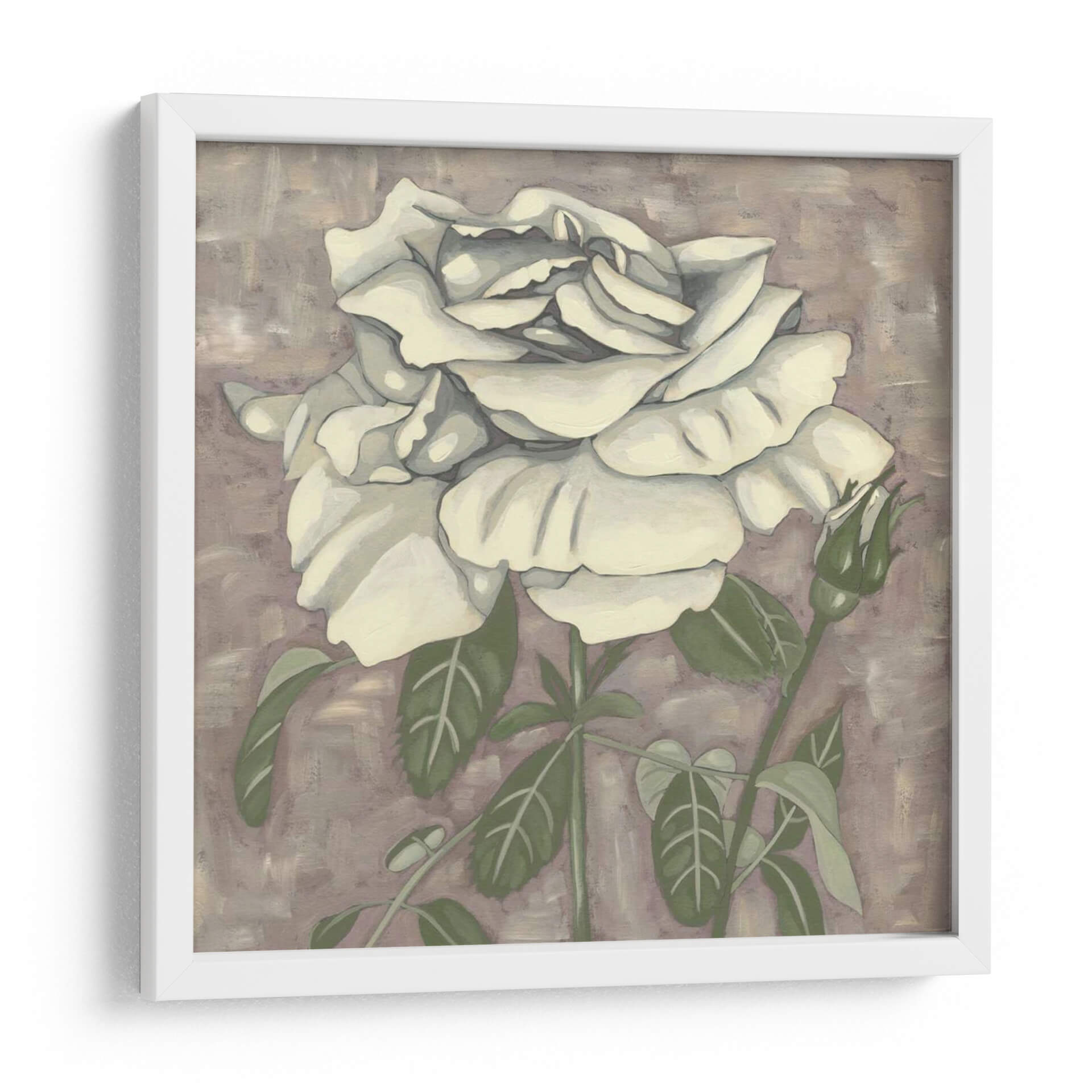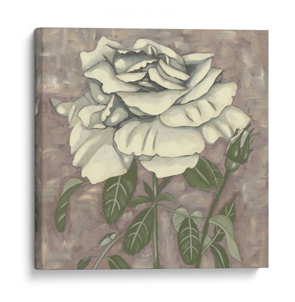 Embellece tu espacio con la delicadeza atemporal de 'Silver Rose I', una obra de arte cautivadora de Chariklia Zarris. Este cuadro decorativo presenta una rosa blanca de pétalos exuberantes y detallados, emergiendo sobre un fondo texturizado en tonos lavanda y tierra. La paleta de colores suave y sofisticada, dominada por blancos cremosos, verdes apacibles y un matiz neutral en el fondo, crea una atmósfera de serenidad y elegancia. La composición, centrada en la flor principal y un capullo en ciernes, evoca la belleza efímera de la naturaleza y el potencial de crecimiento. El estilo artístico, con pinceladas visibles pero controladas, aporta una sensación de arte contemporáneo con un toque clásico. 'Silver Rose I' es una pieza versátil, ideal para añadir un toque de refinamiento a cualquier dormitorio, sala de estar o estudio, transformando tu hogar en un santuario de paz y estilo. Descubre la armonía y la belleza sutil que esta obra puede aportar a tu decoración.