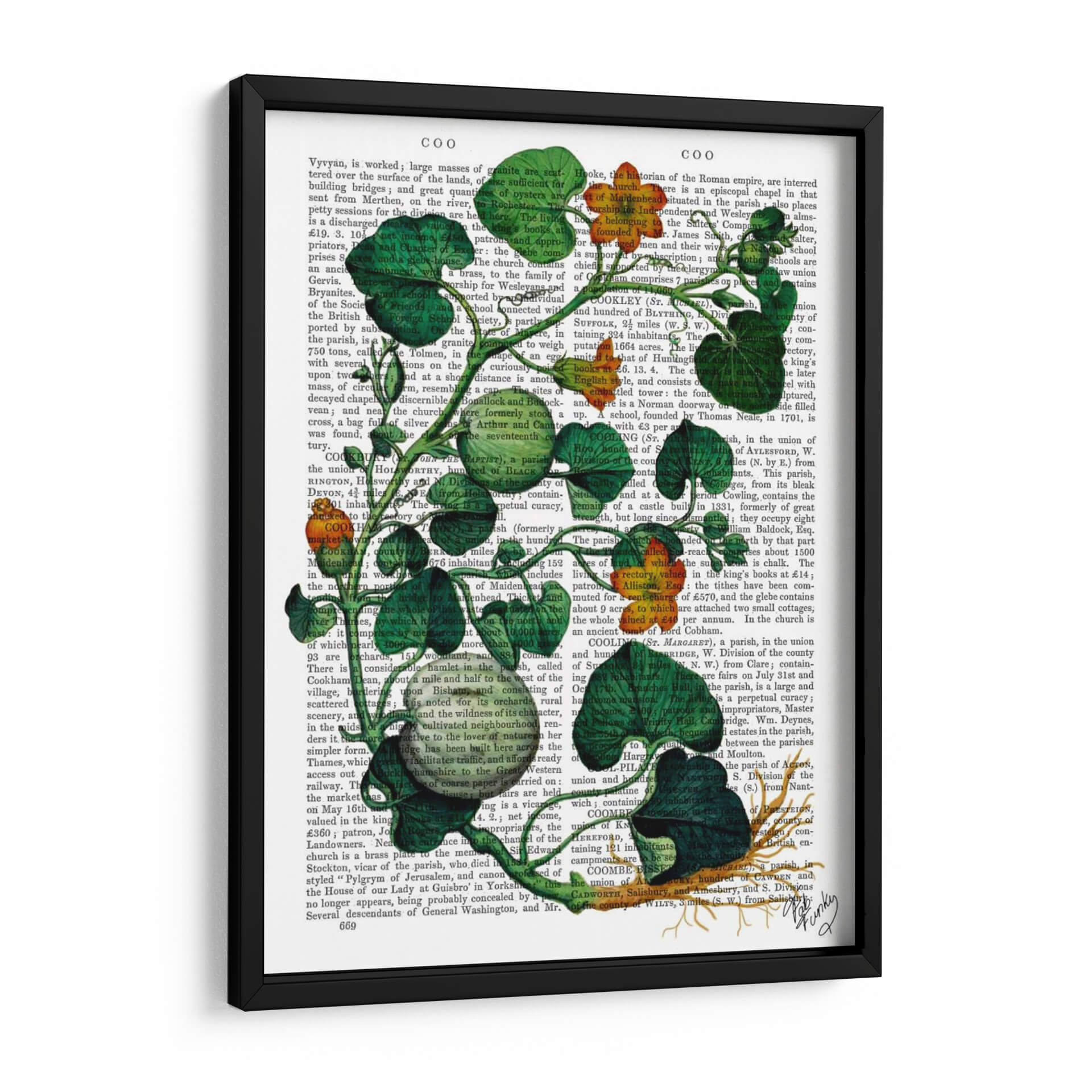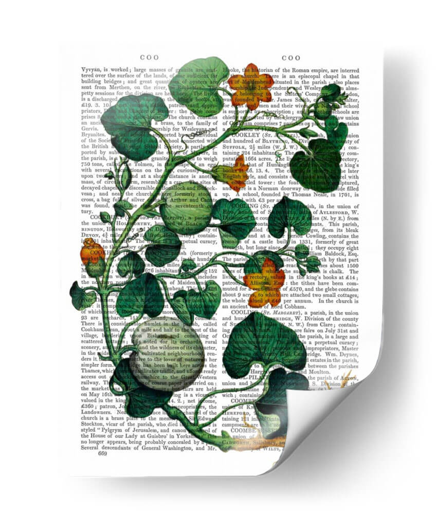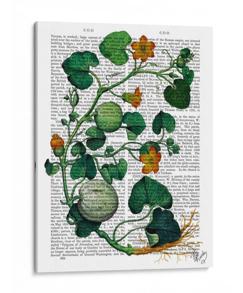 Transforma tu espacio con el vibrante cuadro decorativo 'Squash Vid 2' del artista Fab Funky. Esta obra de arte contemporánea presenta una detallada ilustración botánica de una vid de calabaza, con exuberantes hojas verdes y vibrantes flores anaranjadas que parecen brotar de un fondo de texto antiguo. La composición juega magistralmente con el contraste entre lo orgánico y lo escrito, creando una pieza visualmente intrigante que añade profundidad y carácter a cualquier habitación. Los tonos verdes intensos y los toques de naranja cálido infunden energía y un aire de naturaleza a tu decoración, haciendo de este cuadro una elección perfecta para salas de estar modernas, estudios creativos u oficinas que buscan un toque de originalidad. Su estilo único fusiona lo natural con lo académico, evocando una sensación de descubrimiento y belleza en los detalles. Ideal para quienes aprecian el arte botánico con un giro contemporáneo, 'Squash Vid 2' es más que una simple decoración; es una ventana a la fascinación por el mundo natural y la historia de la ilustración.