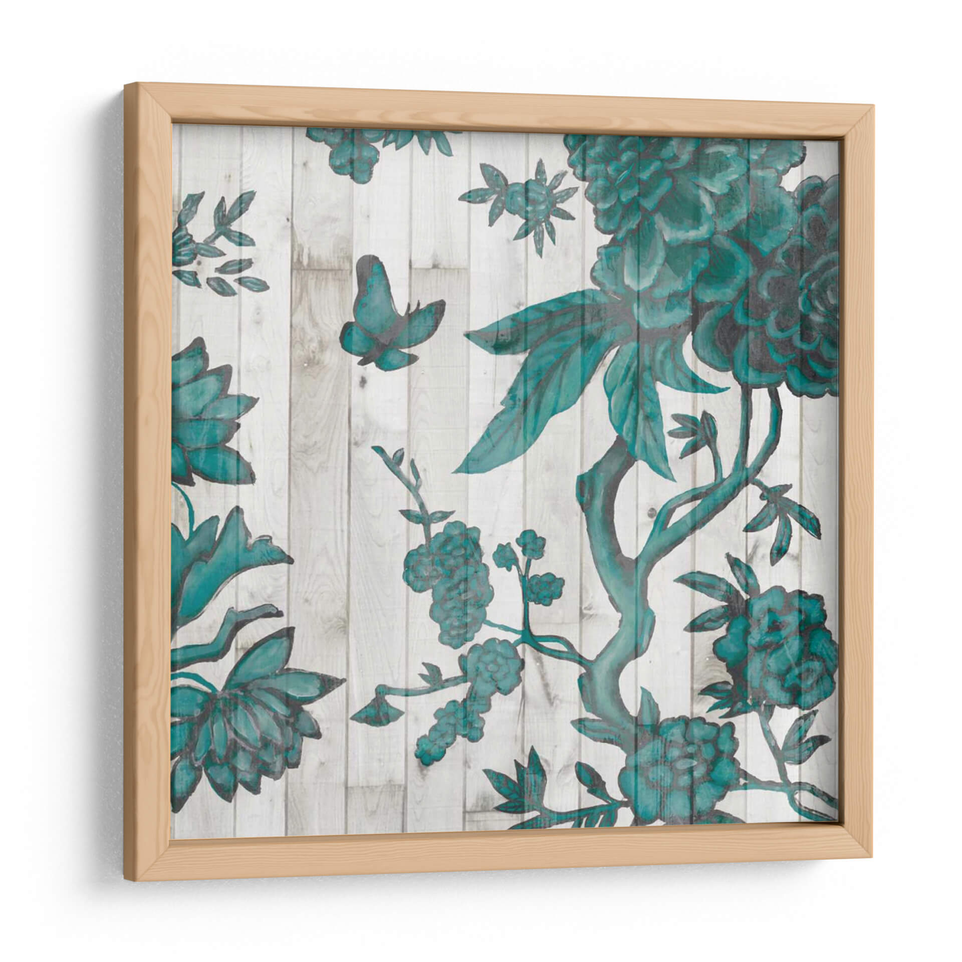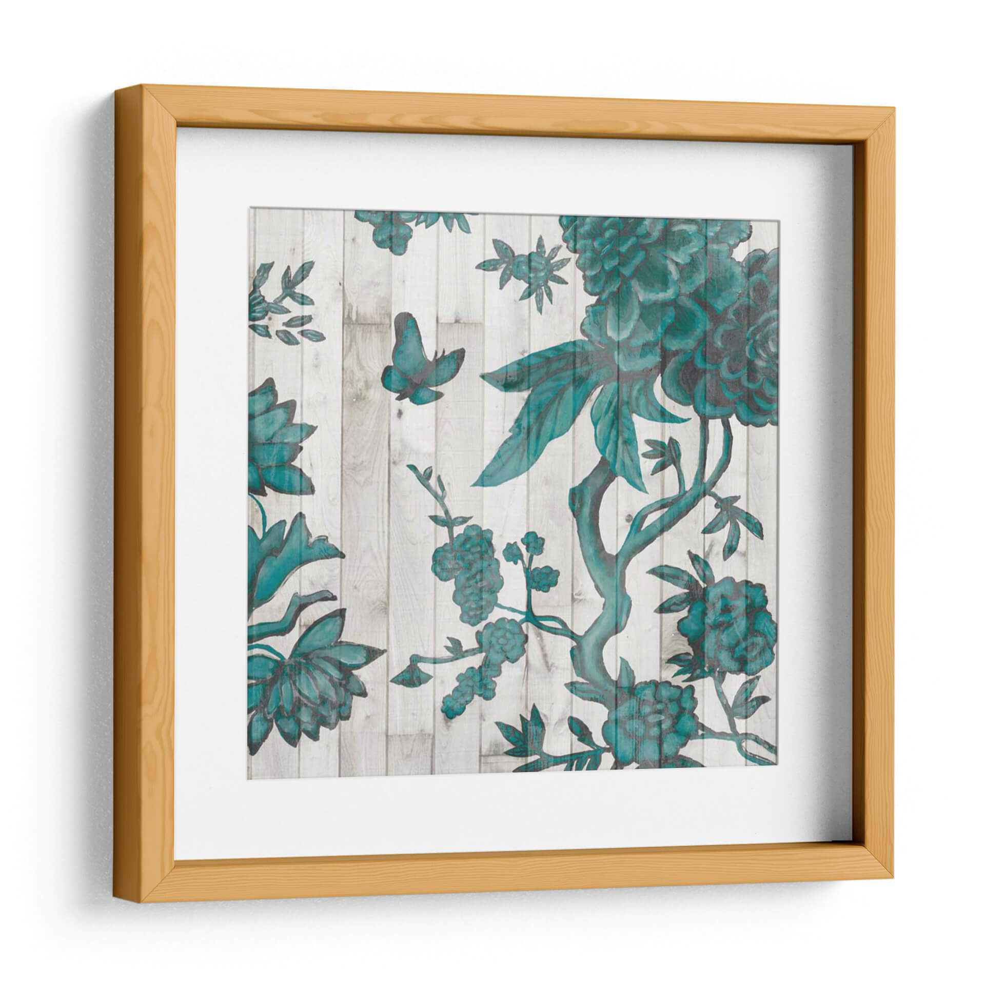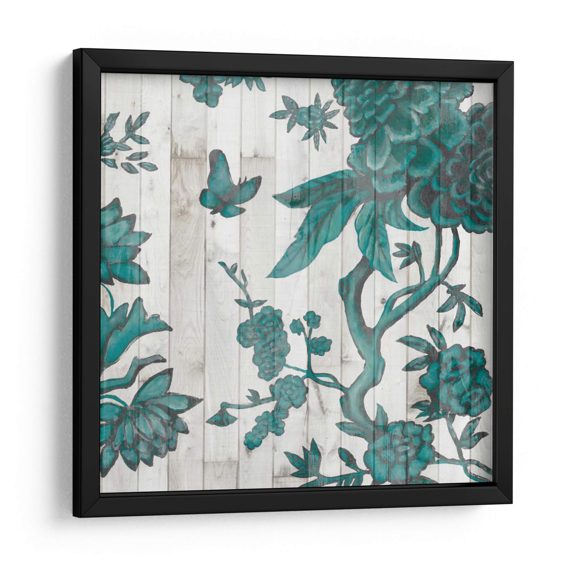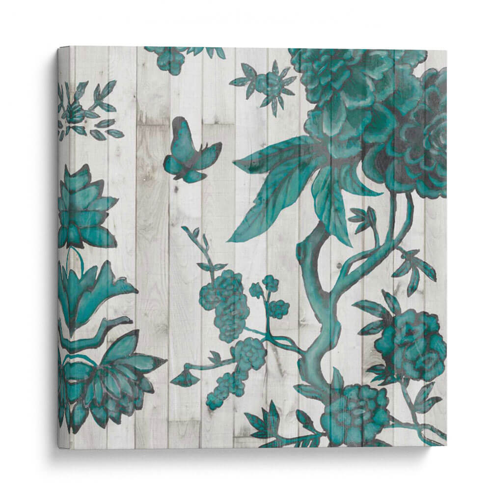 Embellece tu hogar con el cautivador cuadro decorativo 'Terra Verde Chinoiserie I', una obra maestra de Naomi McCavitt que evoca la elegancia atemporal de los diseños orientales. Esta pieza presenta un intrincado patrón floral en un vibrante tono verde azulado sobre un fondo que simula tablones de madera desgastada, creando un contraste visual impactante y sofisticado. La composición se adorna con delicadas mariposas y exuberantes flores, sugiriendo un jardín sereno y enigmático. El estilo, inspirado en la tradición Chinoiserie, aporta un aire de exotismo y refinamiento, perfecto para aquellos que buscan infundir a sus espacios un toque de distinción y tranquilidad. Ideal para salones, dormitorios o pasillos, este cuadro decorativo se integra armoniosamente en diversas decoraciones, desde las más clásicas hasta las contemporáneas, añadiendo profundidad y carácter a cualquier ambiente. Su paleta de colores y su detallada ejecución invitan a la contemplación, transformando tu pared en un portal hacia un mundo de belleza natural y arte exquisito. Descubre la magia de 'Terra Verde Chinoiserie I' y permite que su encanto floral llene de vida y estilo tu refugio personal.