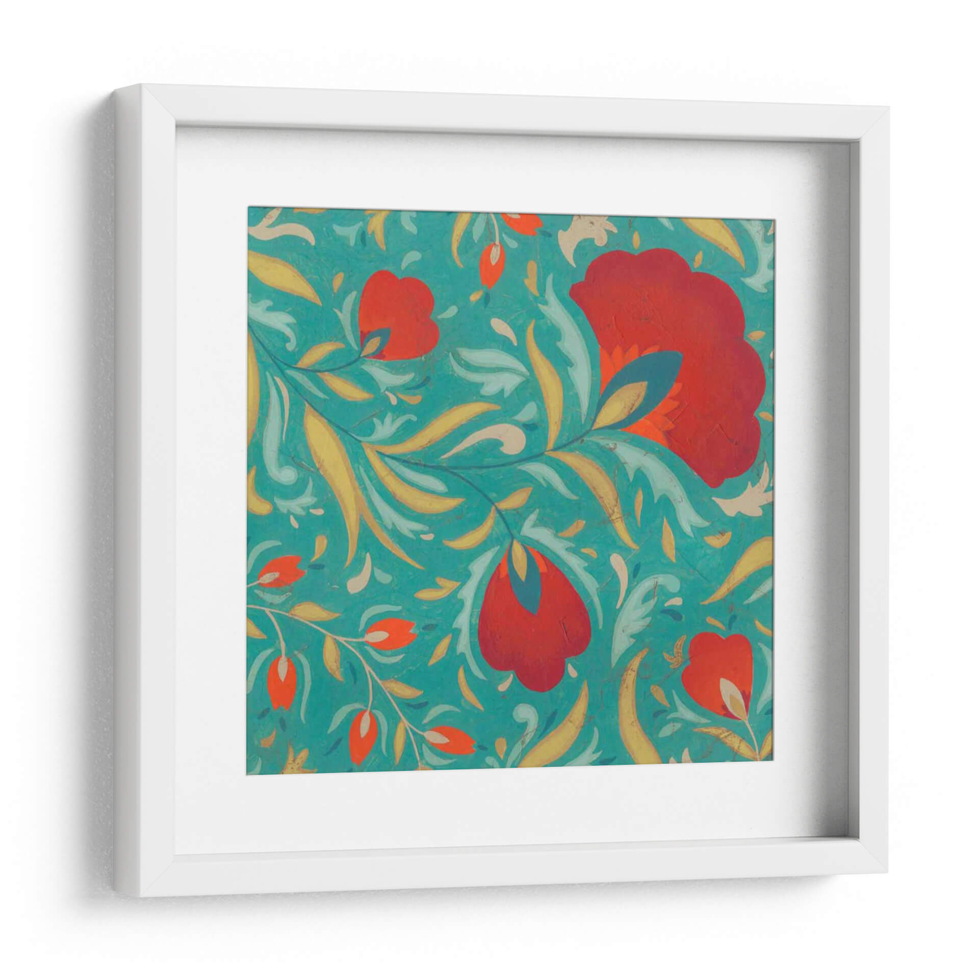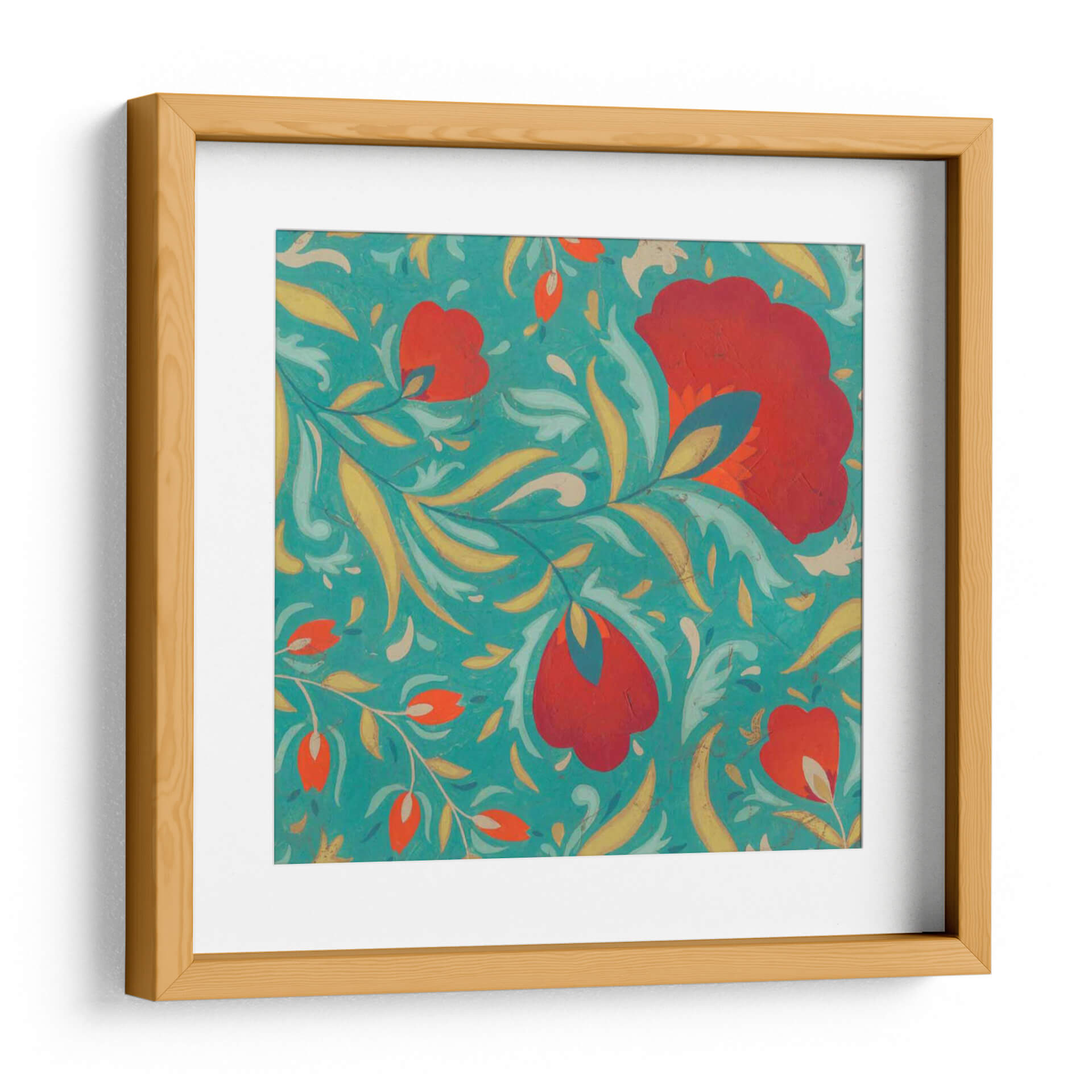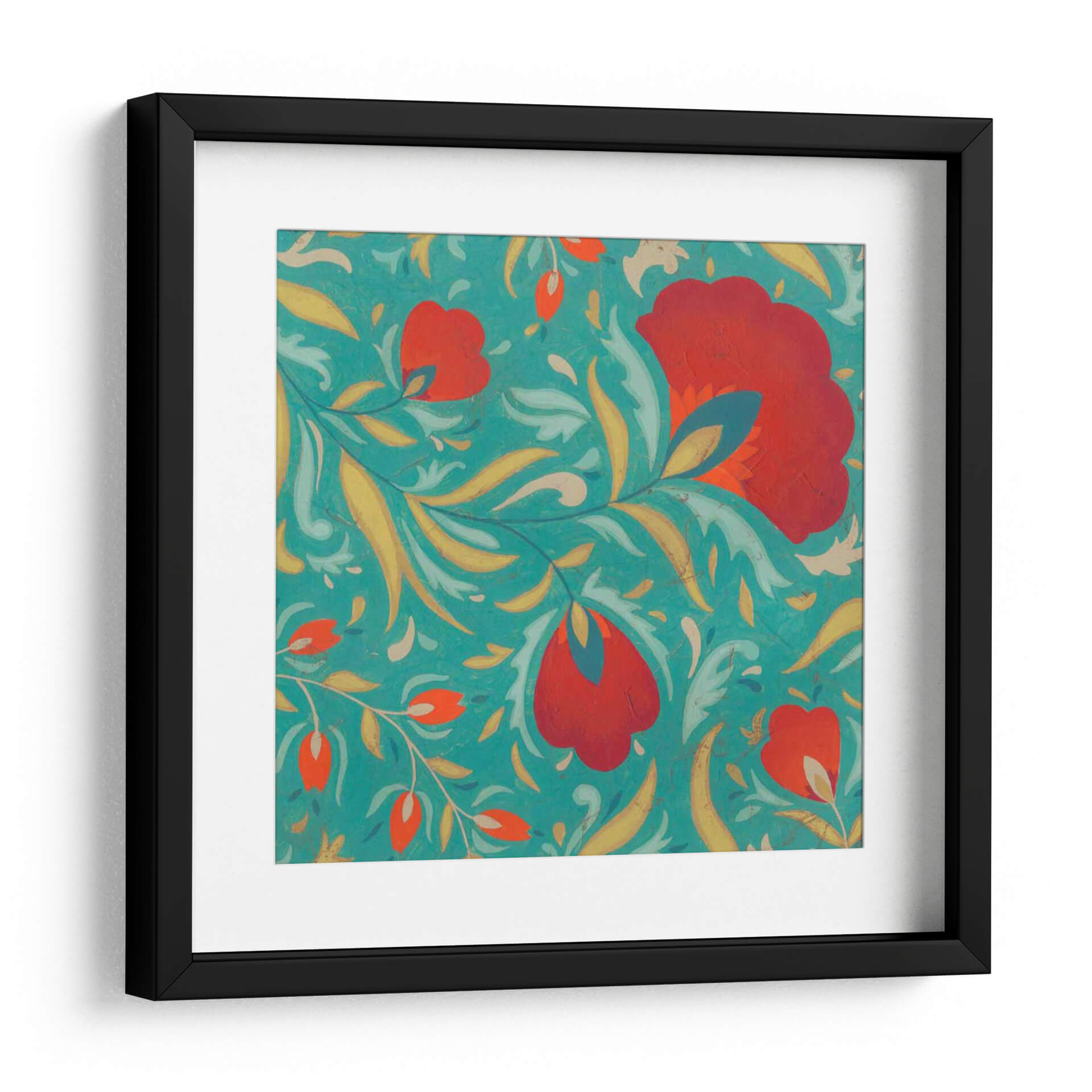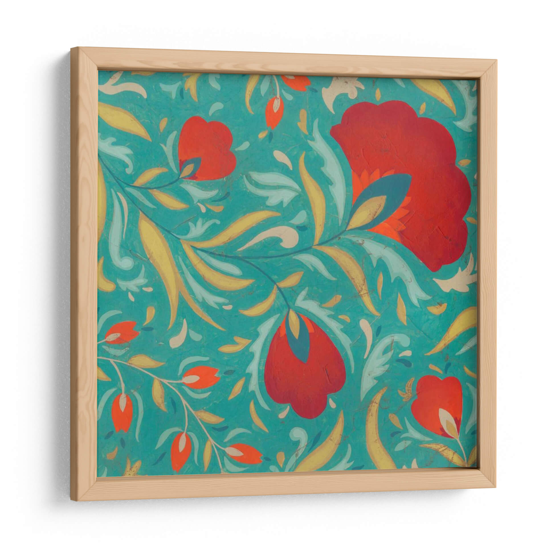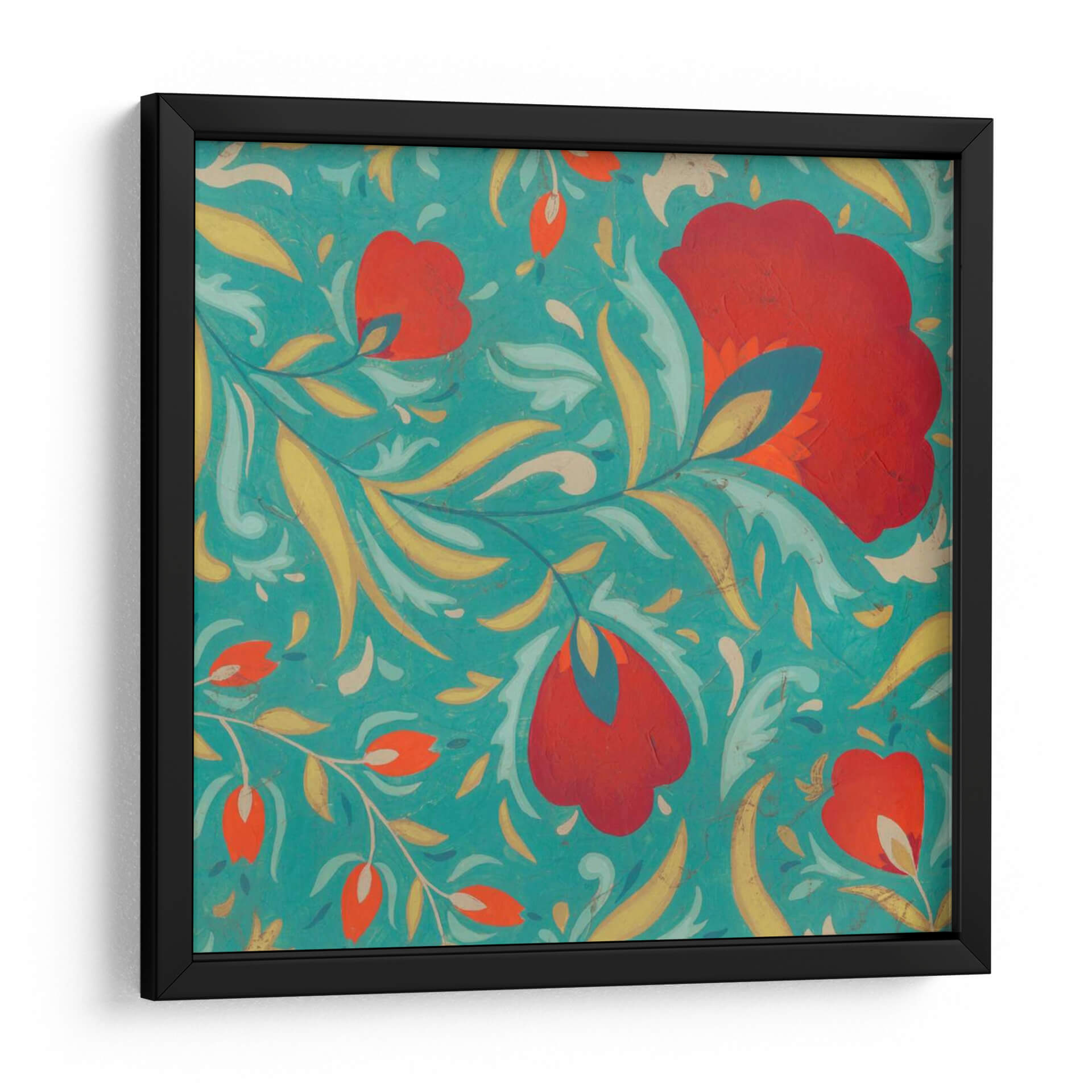 Embárcate en un viaje visual con "Textil Vibrante II", una obra de arte que irradia energía y sofisticación. Esta pieza cautivadora presenta un patrón intrincado de flores estilizadas y follaje en vibrantes tonos rojos y anaranjados, contrastando maravillosamente con un fondo azul turquesa profundo. La composición, inspirada en motivos textiles tradicionales, crea una sensación de movimiento y fluidez, como si las formas danzaran sobre la superficie. Los toques de amarillo dorado y azul petróleo añaden profundidad y riqueza a la paleta, generando un equilibrio visual dinámico. El estilo, que evoca el arte popular con un toque contemporáneo, lo convierte en una adición excepcional para cualquier espacio que busque un acento de color y textura. Ideal para salas de estar modernas, comedores o incluso un estudio, este cuadro decorativo aportará un aire de vitalidad y un toque artístico único. Su diseño detallado invita a la contemplación, mientras que su audacia cromática asegura que sea un punto focal memorable en tu decoración.