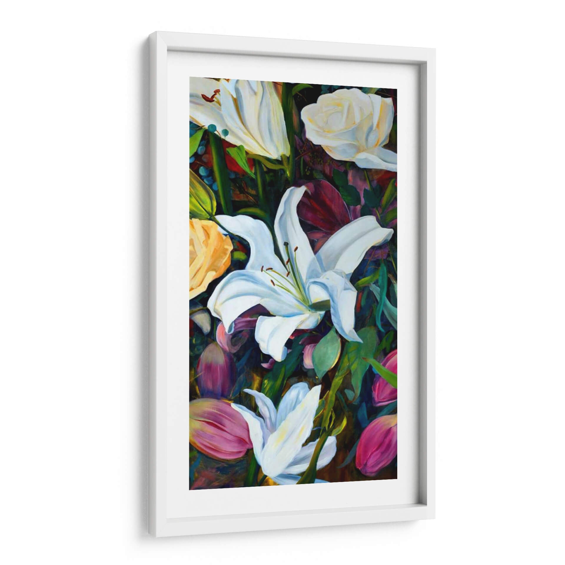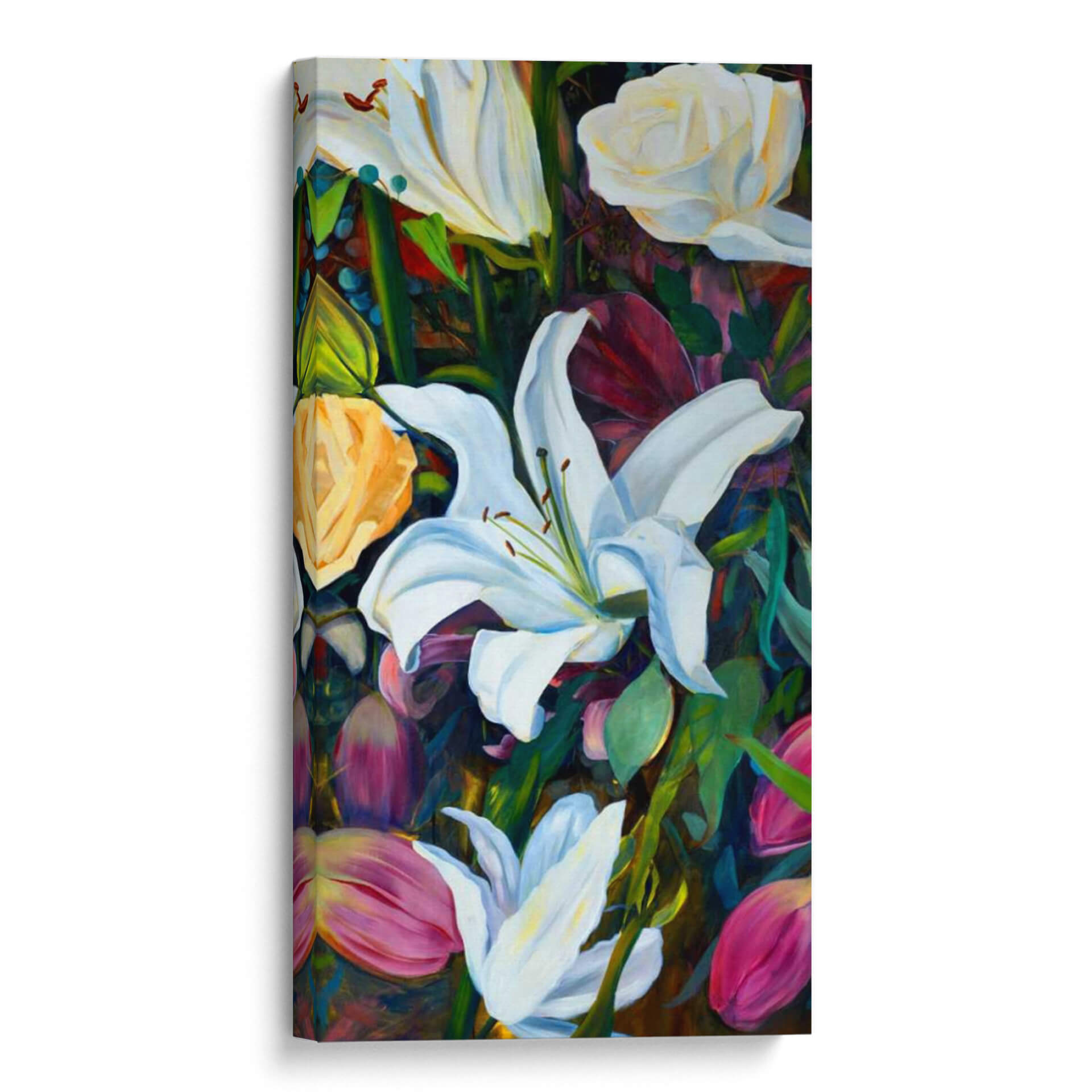 Sumérgete en la opulencia floral con 'Tríptico De Flores Barroco I', una obra de arte que captura la esencia de la naturaleza en su máximo esplendor. Sandra Iafrate nos transporta a un jardín exuberante, donde lirios blancos puros y rosas amarillas y blancas se entrelazan con delicadeza. Los vibrantes tonos de fucsia y morado en los tulipanes y hojas añaden profundidad y un toque barroco que evoca riqueza y dramatismo. La rica paleta de colores, con profundos verdes, ocres y toques de azul, crea una atmósfera de serenidad y elegancia atemporal. Esta composición, que parece emanar de un bodegón clásico pero con una ejecución contemporánea, es perfecta para quienes buscan añadir un punto focal sofisticado y lleno de vida a sus espacios. Imagina este cuadro decorativo transformando tu sala de estar, comedor u oficina en un santuario de belleza natural. Es una pieza que invita a la contemplación, ideal para salones, recibidores o cualquier lugar donde se desee infundir una sensación de lujo y tranquilidad. Un lienzo que celebra la belleza efímera de las flores con una maestría que perdura.