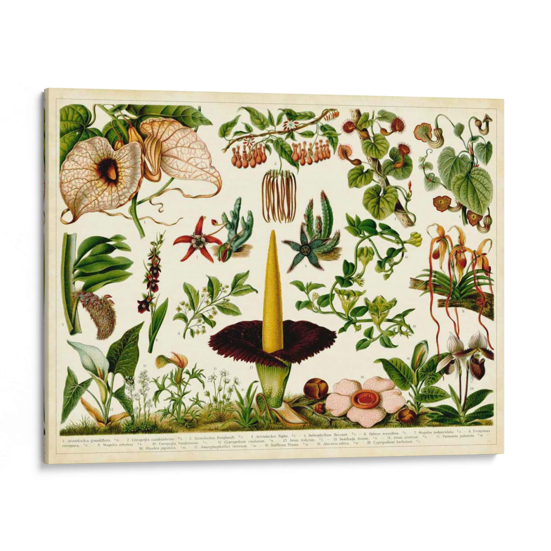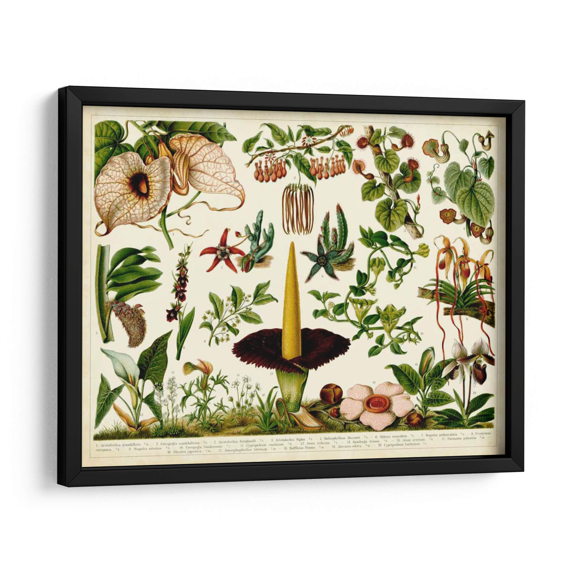 Sumérgete en la belleza detallada de la botánica con "Tropical Botánica Tabla III", una obra de arte que celebra la diversidad y complejidad del reino vegetal. Este cuadro decorativo presenta una meticulosa ilustración de diversas especies botánicas, evocando la era de los exploradores y naturalistas. La composición, que recuerda a las láminas científicas clásicas, despliega una variedad de flores exóticas y follaje frondoso en una paleta de colores que va desde los verdes profundos y terrosos hasta toques vibrantes de rojo, amarillo y crema. Cada planta está representada con una precisión asombrosa, desde los pétalos intrincados de las orquídeas hasta la forma distintiva de las plantas carnívoras y las flores tropicales de gran tamaño. La atmósfera general es una de descubrimiento científico y apreciación de la naturaleza, perfecta para añadir un toque de elegancia educativa y un aire de sofisticación botánica a tu hogar u oficina. Este cuadro es ideal para espacios que buscan un elemento de conversación distintivo, aportando historia, detalle y un profundo respeto por el mundo natural a cualquier ambiente, ya sea una sala de estar moderna, un estudio o una biblioteca.