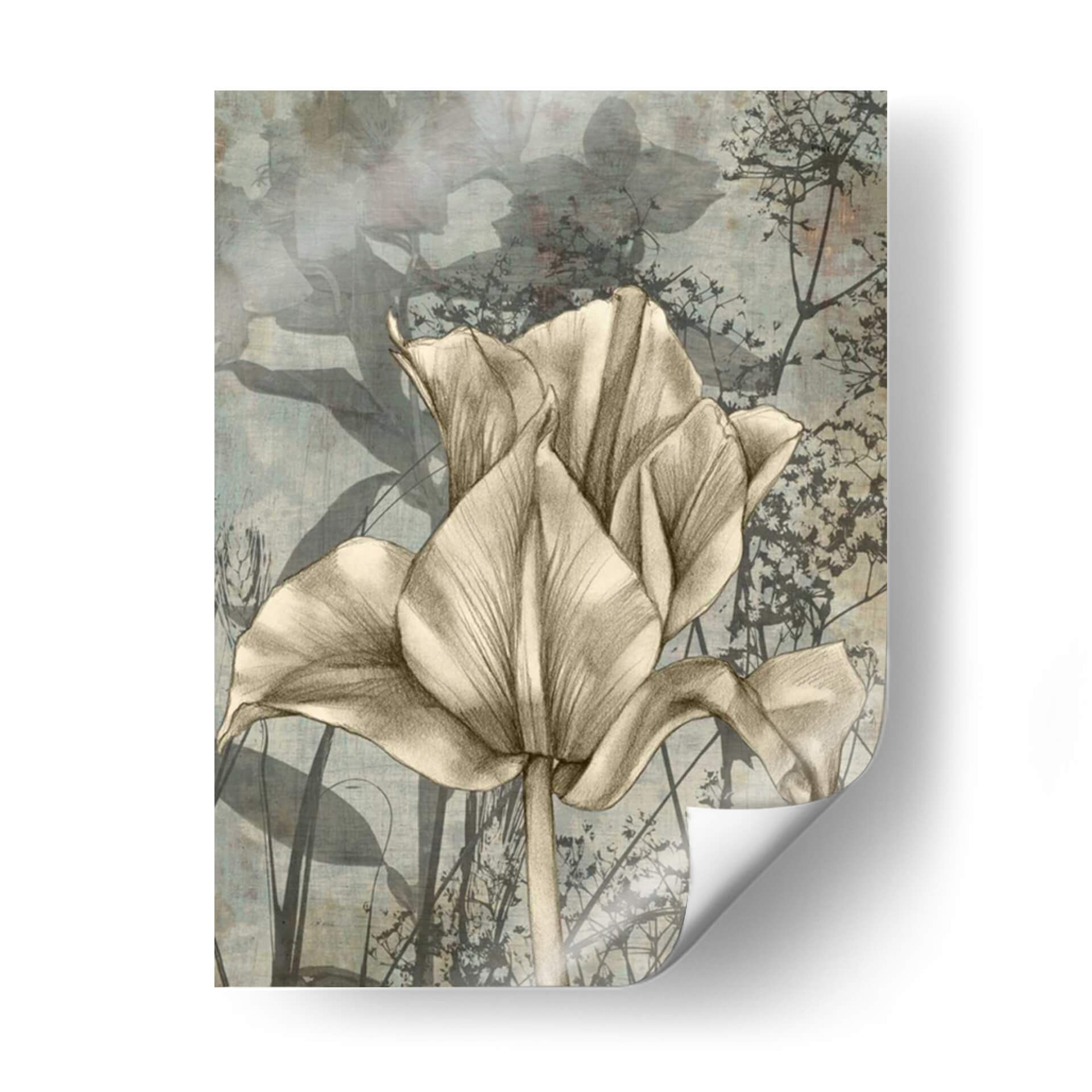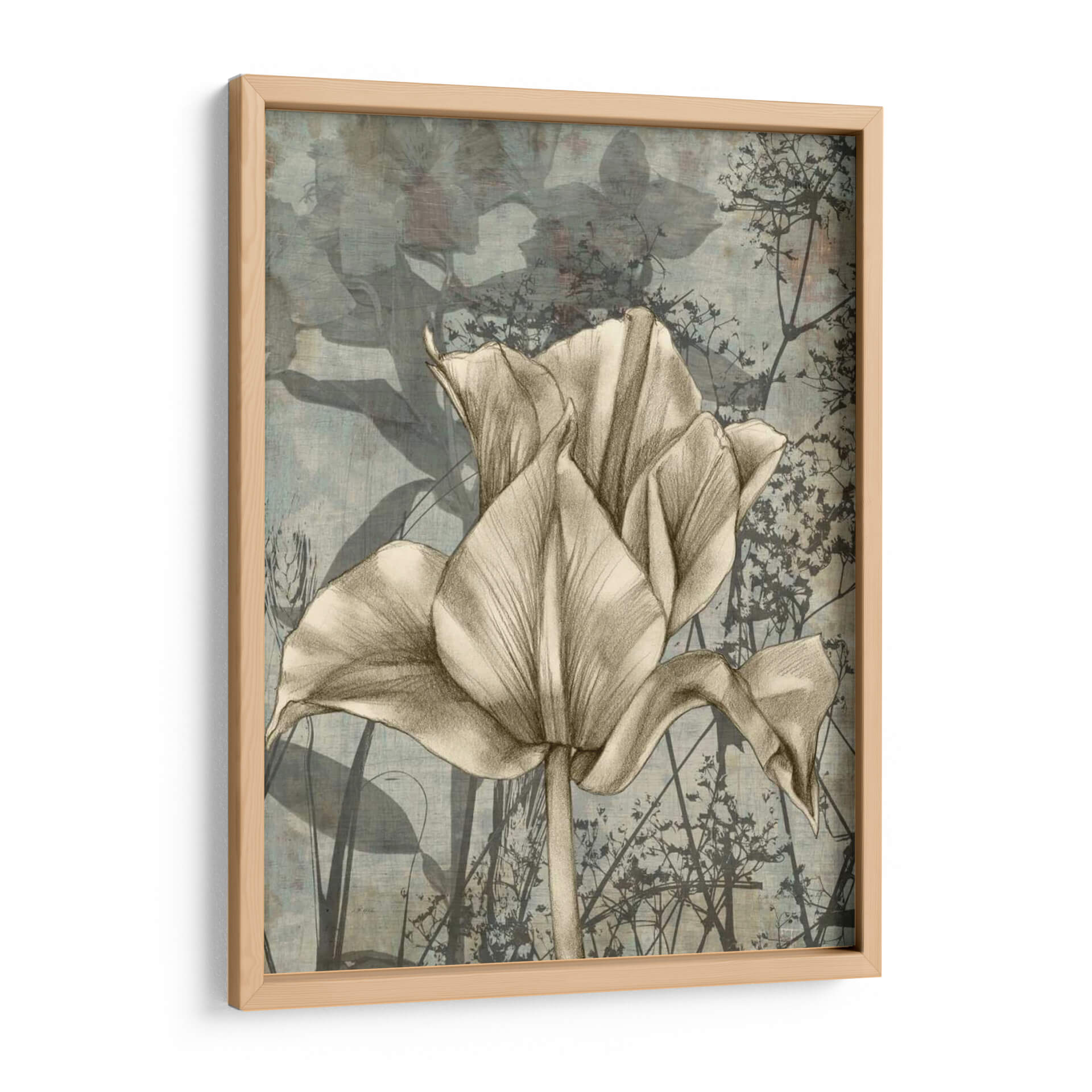Adéntrate en la delicadeza botánica con 'Tulipán y Flores Silvestres IV', una obra de arte que captura la esencia de la naturaleza con una elegancia atemporal. Este cuadro decorativo presenta un tulipán central, renderizado con trazos suaves y detallados que evocan la técnica del lápiz, contrastando armónicamente con un fondo texturizado y etéreo. Las sutiles siluetas de flores silvestres y hojas, en tonos grises y azules apagados, crean una atmósfera de serenidad y profundidad, añadiendo un toque de misterio natural. La paleta de colores, predominantemente sepia y azul grisáceo, confiere a la pieza una sofisticación sutil, ideal para espacios que buscan calma y refinamiento. Es una pieza perfecta para añadir un punto focal natural y artístico a tu sala de estar, dormitorio o estudio. Su estilo, que fusiona lo realista del retrato floral con lo abstracto del fondo, la convierte en una adición versátil para decoraciones contemporáneas, rústicas o bohemias, aportando un toque de naturaleza y arte a tu hogar. Descubre la belleza del detalle floral en esta composición evocadora.