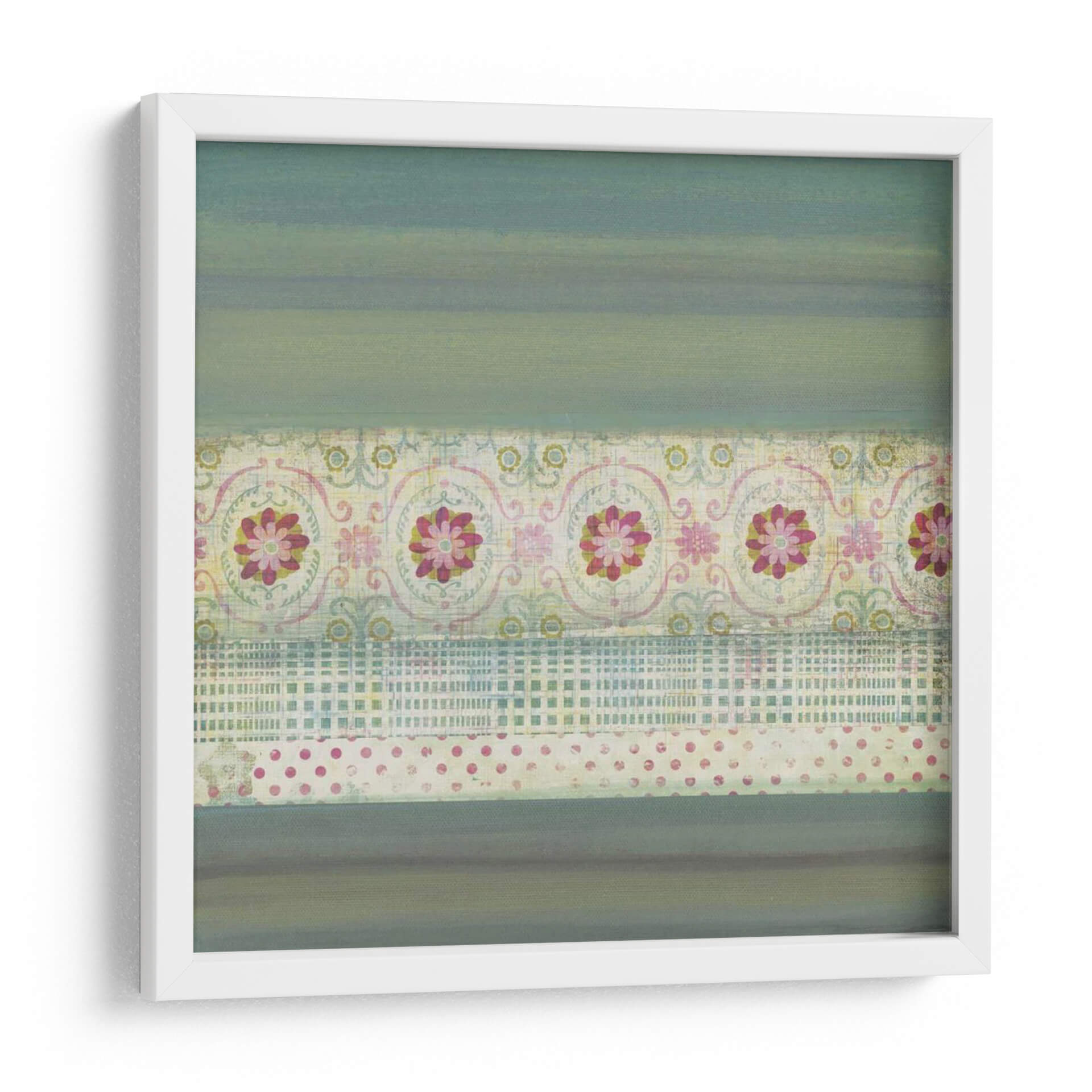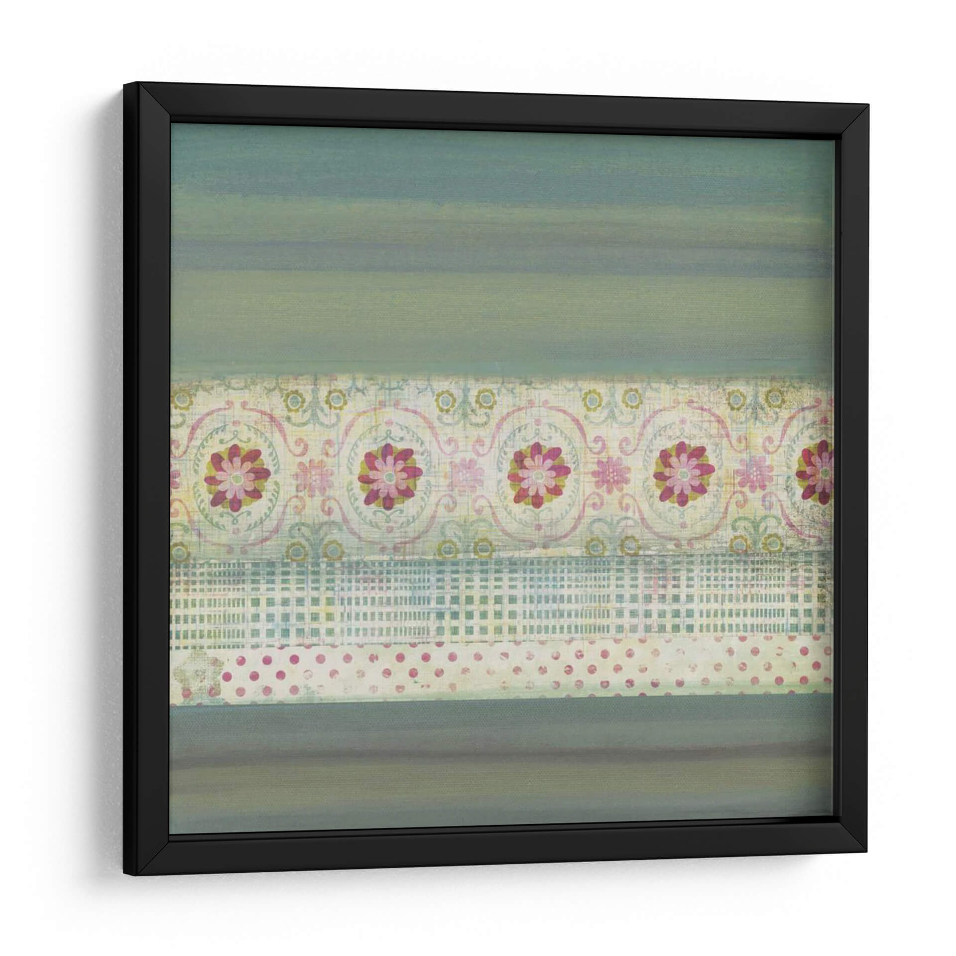 Transforma tu espacio con el cautivador cuadro decorativo "Un Regalo De Blooms Ii" de W. Green-Aldridge. Esta obra de arte textil abstracta presenta una composición en capas que evoca una sensación de serenidad y sofisticación. Las sutiles bandas de color verde azulado se entrelazan con patrones intrincados de flores estilizadas en tonos rosados y amarillos, junto con delicados diseños de cuadrícula y lunares. La paleta de colores, predominantemente en tonos fríos con toques cálidos, crea una atmósfera tranquila y acogedora, perfecta para añadir un toque de elegancia a cualquier habitación. Su diseño abstracto y texturizado lo convierte en una pieza versátil, ideal para salones modernos, dormitorios serenos u oficinas que buscan inspiración. "Un Regalo De Blooms Ii" no es solo una decoración, sino una invitación a la contemplación y al disfrute estético, un detalle que aportará carácter y estilo único a tu hogar. Descubre la belleza atemporal de este cuadro decorativo y haz de tu pared un lienzo de expresión personal.