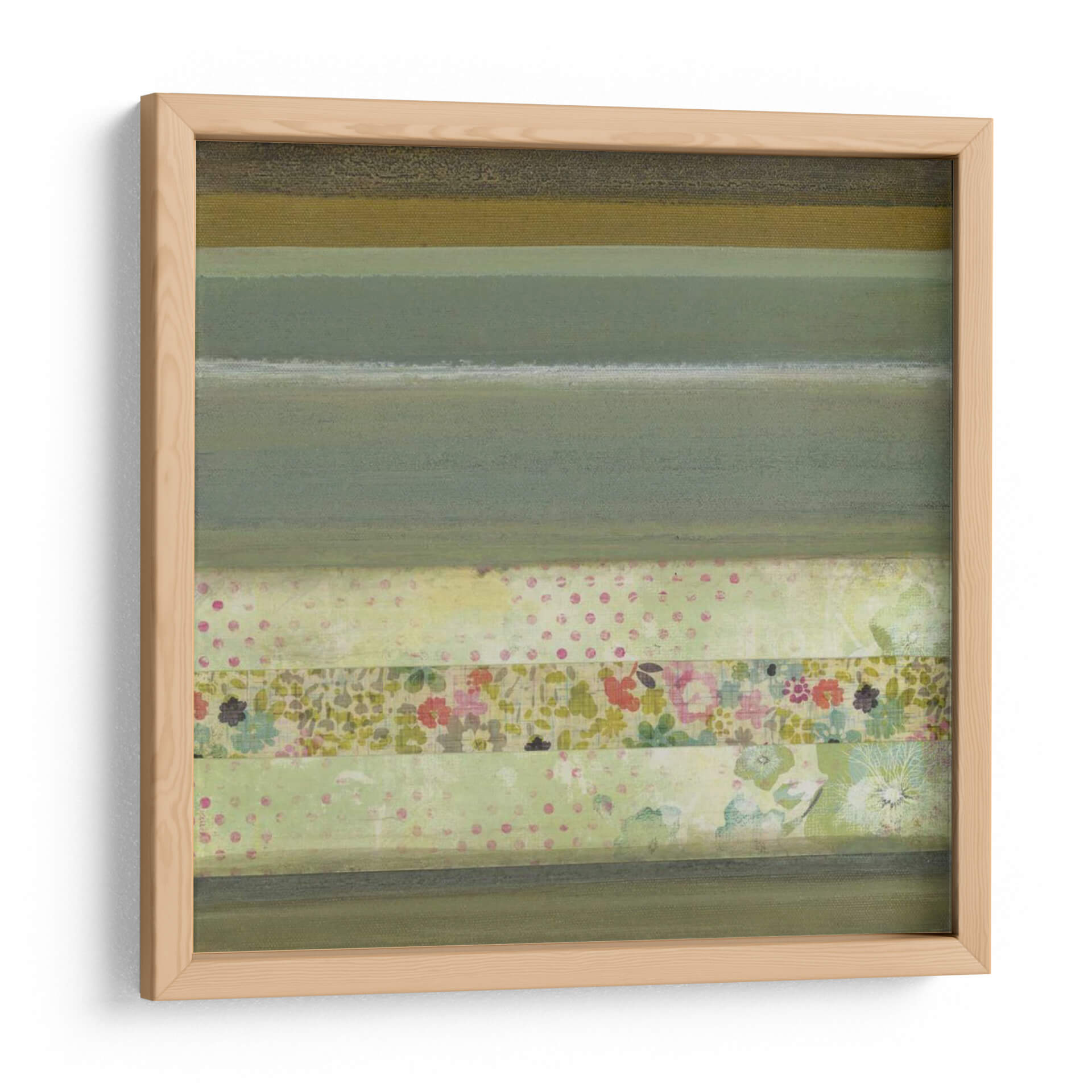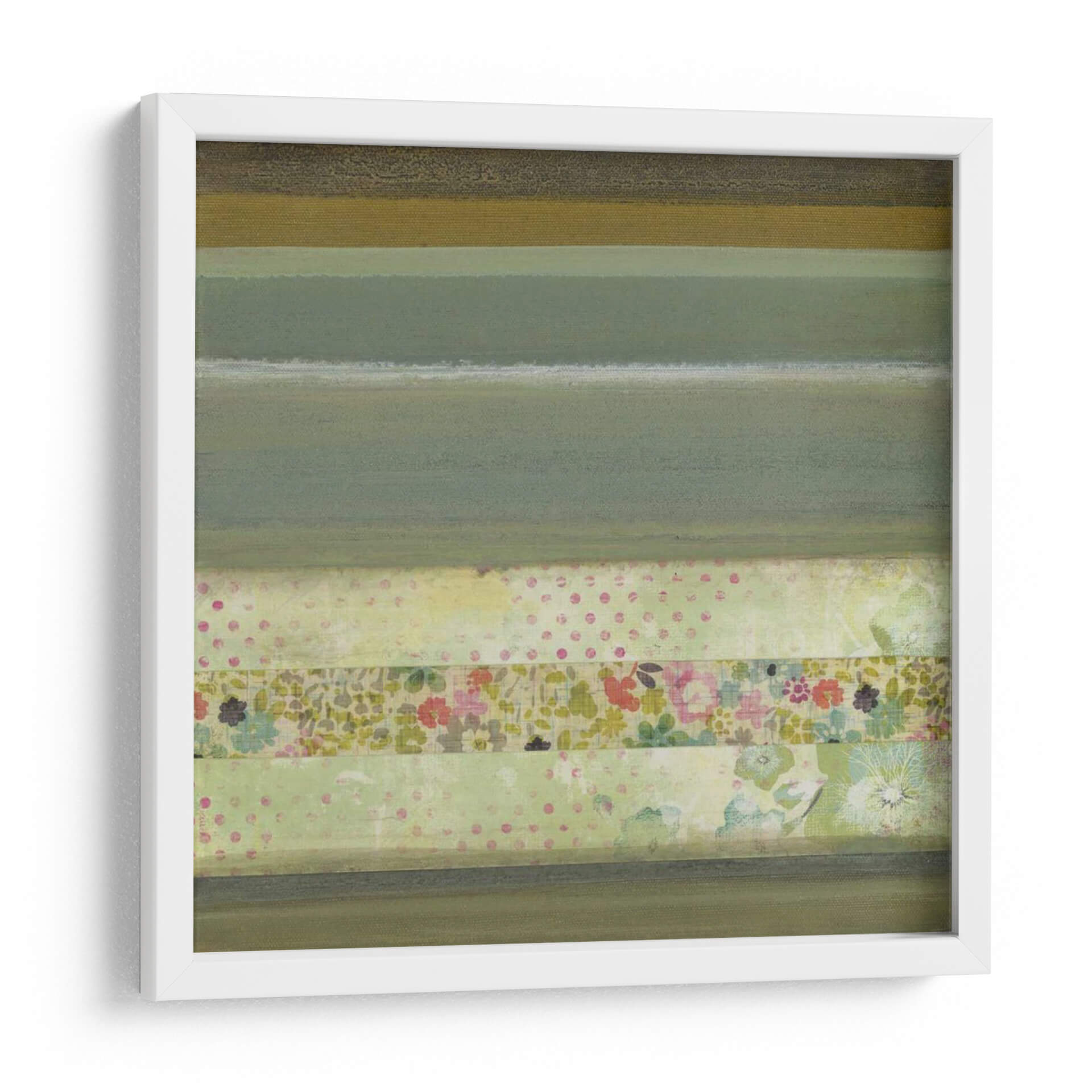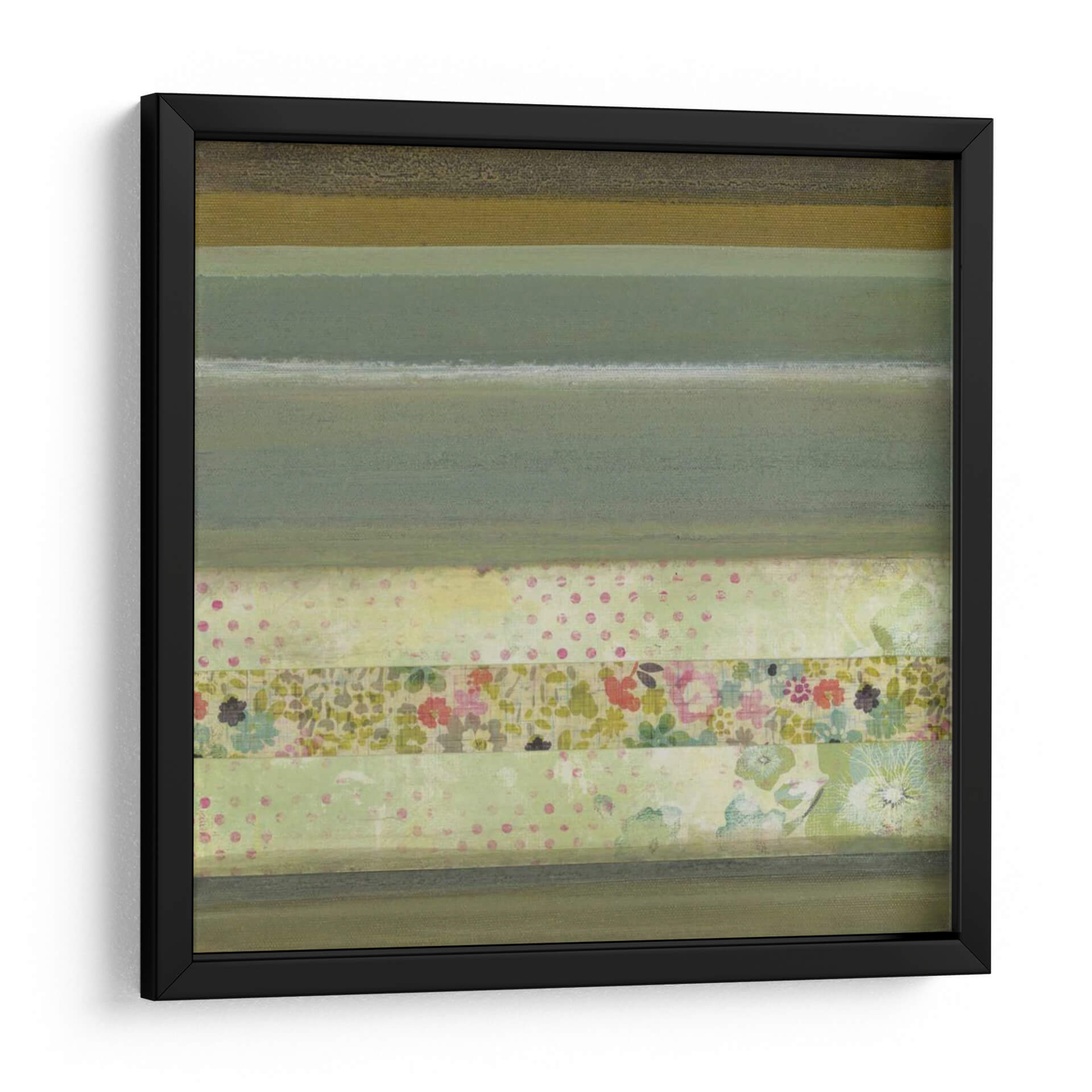 Sumérgete en la serenidad de "Un Regalo De Blooms Iii", una obra de arte contemporáneo que evoca la delicadeza de la naturaleza a través de una composición abstracta y texturizada. Las suaves bandas de color, que van desde verdes musgo y oliva hasta un pálido amarillo verdoso, crean una atmósfera de calma y equilibrio. La pieza se enriquece con sutiles patrones de lunares y un panel central que florece con delicadas flores en tonos pastel, recordando a un jardín secreto o a retazos de tela antigua. Esta combinación de elementos abstractos y motivos florales crea una estética única, perfecta para añadir un toque de sofisticación y tranquilidad a cualquier espacio. Ideal para salones, dormitorios o estudios, este cuadro decorativo contemporáneo es una invitación a la contemplación y al disfrute de la belleza sutil. Su estilo abstracto moderno con toques orgánicos lo convierte en una pieza versátil que complementará una variedad de decoraciones interiores, desde las más minimalistas hasta las más acogedoras, aportando una sensación de frescura y renovada inspiración.