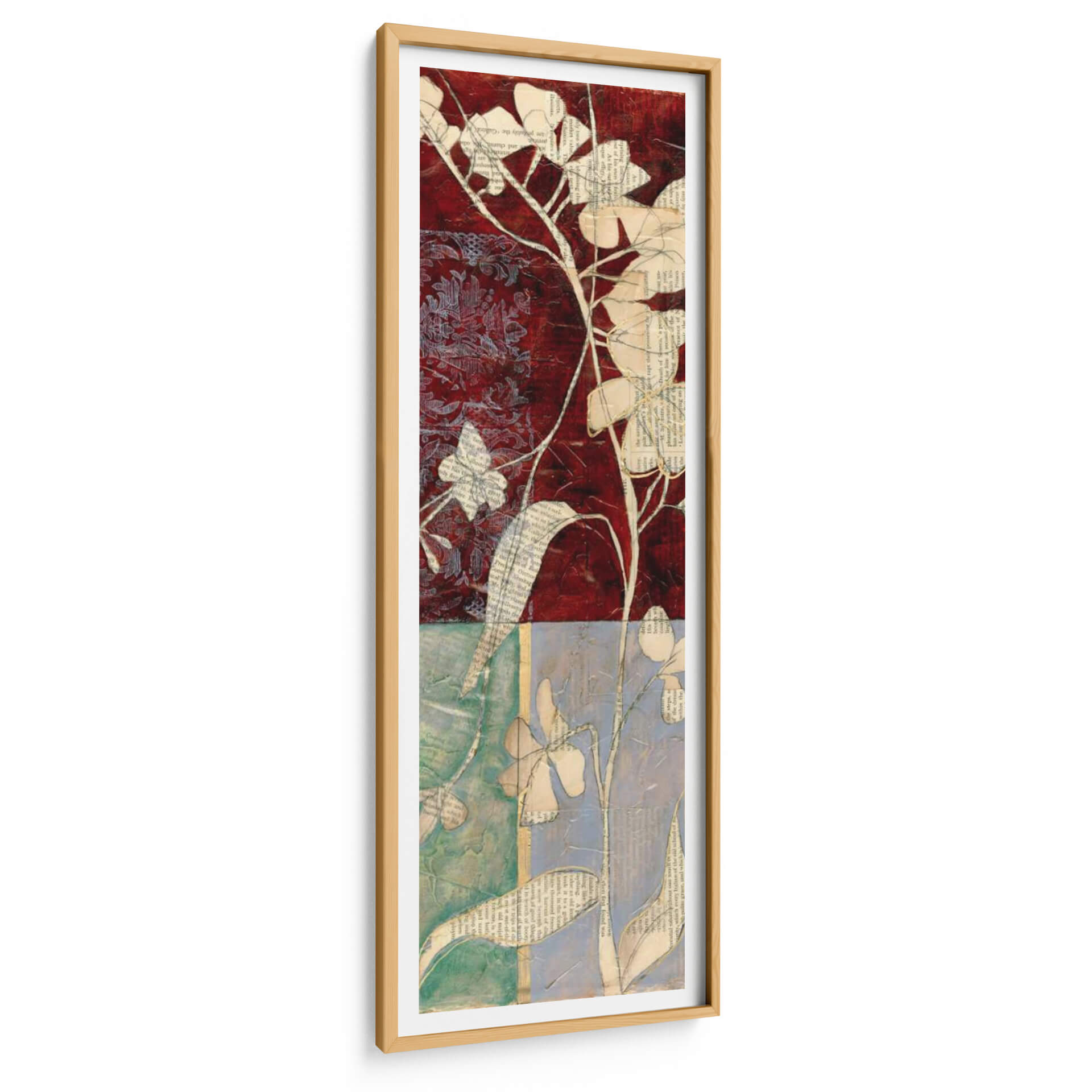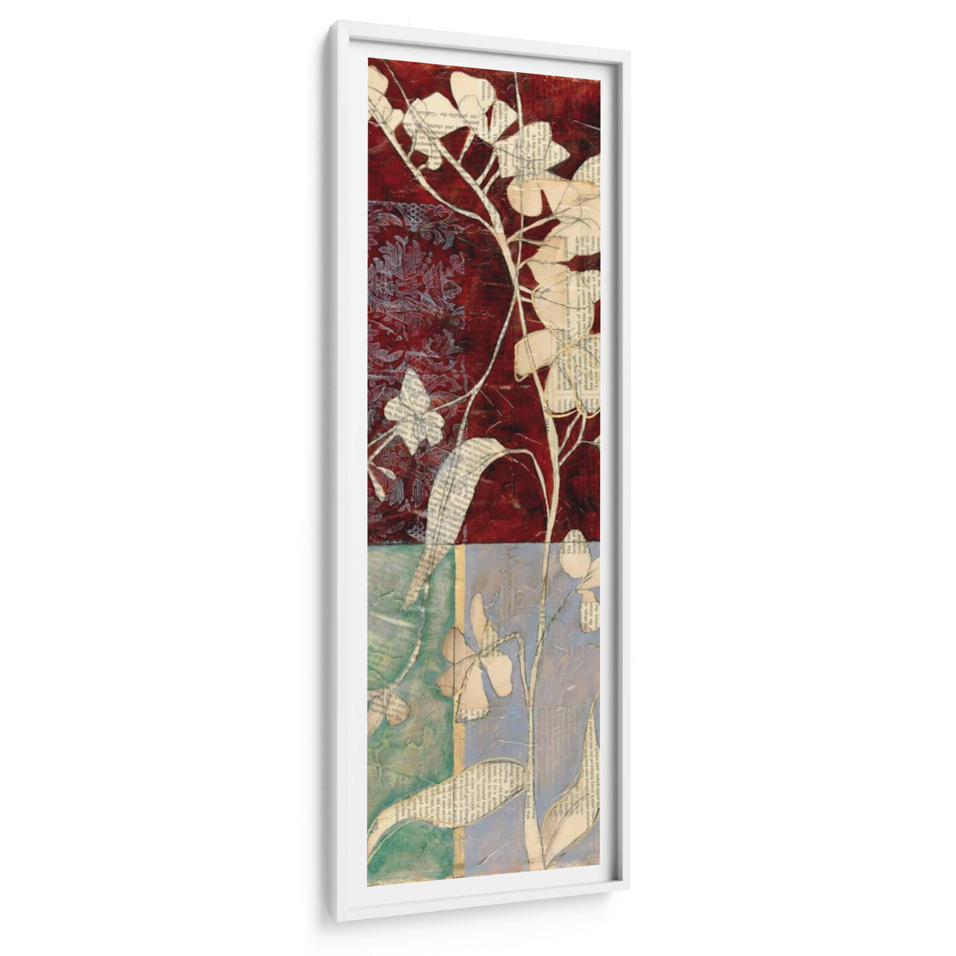 Sumérgete en la delicadeza botánica de "Whimsy V", una obra de arte contemporáneo de Jennifer Goldberger que fusiona la naturaleza con la textura literaria. Este cuadro decorativo vertical presenta una composición dividida, donde la parte superior, dominada por un vibrante rojo, se entrelaza con un sutil damasco y ramas de flores etéreas en tonos marfil, como si emergieran de un texto antiguo. La parte inferior transita hacia una paleta más suave de tonos aguamarina y lavanda, manteniendo la presencia de las siluetas florales y elementos de libro, creando una sensación de calma y reflexión. La técnica mixta, que evoca el collage y la superposición de capas, aporta profundidad y un carácter artesanal único a la pieza. "Whimsy V" es ideal para añadir un toque de sofisticación orgánica a cualquier espacio, desde un rincón acogedor en tu hogar hasta un elegante despacho. Su diseño alargado y su armoniosa combinación de colores la convierten en una elección versátil para interiores modernos, clásicos o eclécticos, invitando a la contemplación y aportando una narrativa visual sutil pero cautivadora. Descubre la belleza de la naturaleza reimaginada en este cautivador cuadro decorativo.