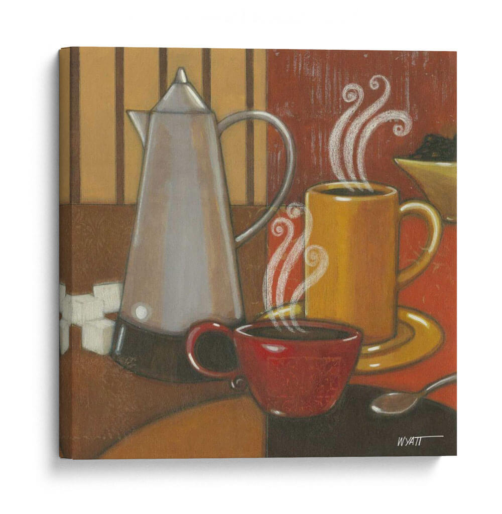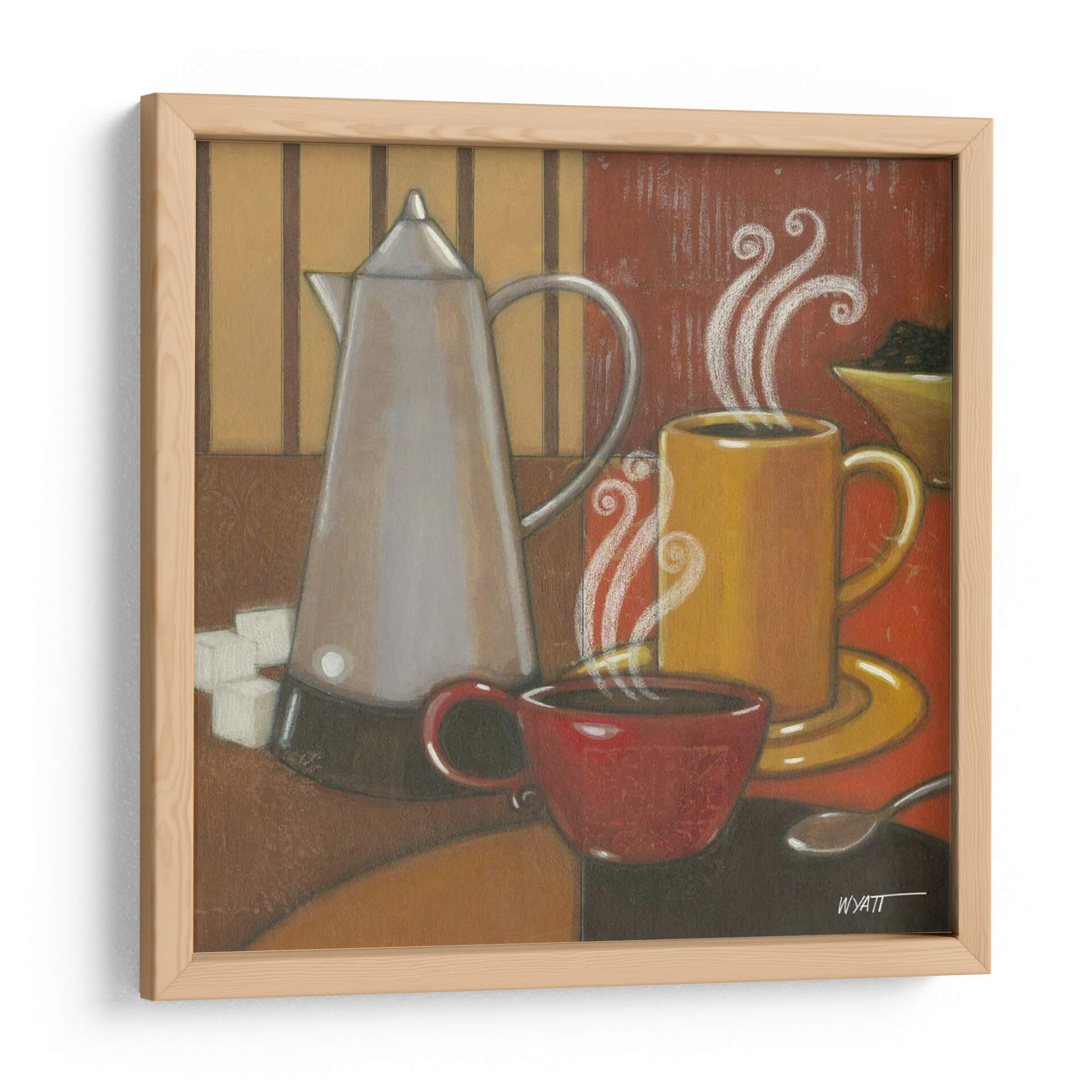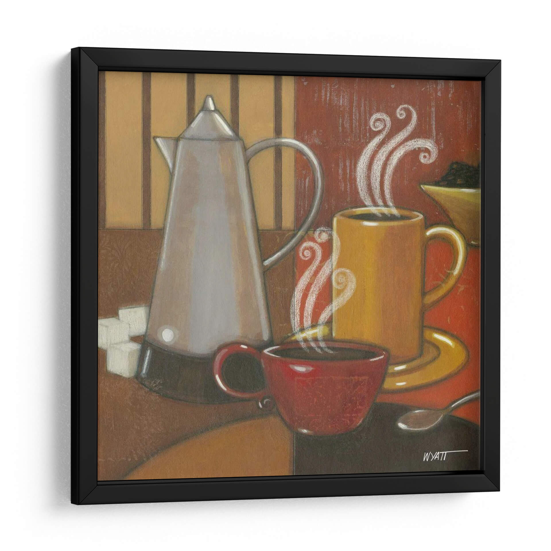 Sumérgete en la calidez y el aroma de un café recién hecho con "Otra Copa II", una cautivadora obra de arte del artista Norman Wyatt Jr. Esta pieza evoca la tranquilidad de una mañana o una tarde acogedora, capturando la esencia reconfortante de una pausa para el café. La composición presenta una elegante cafetera plateada junto a dos tazas humeantes: una vibrante roja y otra de un cálido tono mostaza, acompañadas de terrones de azúcar y una cuchara lista para usar. La paleta de colores, dominada por tonos tierra cálidos, ocres, rojos y toques de gris, crea una atmósfera rústica y a la vez sofisticada. Las líneas suaves y el juego de luces y sombras añaden profundidad y un toque realista a la escena, que parece sacada de un bodegón contemporáneo. "Otra Copa II" es ideal para añadir un punto de calidez y personalidad a tu cocina, comedor u oficina. Este cuadro decorativo invita a la contemplación y al disfrute de los pequeños placeres de la vida, convirtiéndose en el complemento perfecto para espacios que buscan confort y estilo.