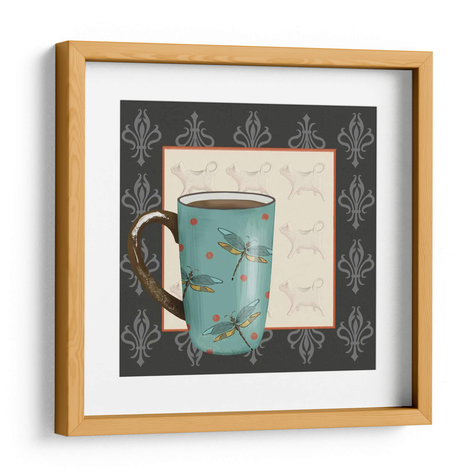 Sumérgete en la tranquilidad y el encanto de "Vacaciones De Café I", una obra de arte original del artista Jade Reynolds. Este cuadro decorativo te transporta a un momento de pausa y disfrute, capturando la esencia de un café matutino con un toque whimsical. La pieza presenta una taza de cerámica estilizada, de un vibrante color turquesa, adornada con delicadas libélulas en vuelo y salpicada de puntos rojos, que añaden un contraste juguetón. Detrás, se vislumbra un patrón sutil de figuras felinas blancas, evocando una sensación de hogar y compañía, todo ello enmarcado por un diseño ornamental oscuro y elegante en los bordes. La paleta de colores, que combina tonos tierra, turquesas serenos y acentos rojos, crea una atmósfera acogedora y sofisticada. Ideal para dar vida a tu cocina, comedor o cualquier rincón que necesite un toque de originalidad y calma. "Vacaciones De Café I" no es solo una pieza decorativa, sino una invitación a disfrutar de los pequeños placeres de la vida. Su estilo único y su temática reconfortante la convierten en la elección perfecta para quienes buscan infundir sus espacios con personalidad y serenidad. Añade este cuadro a tu colección y transforma tu hogar en un refugio de arte y bienestar.