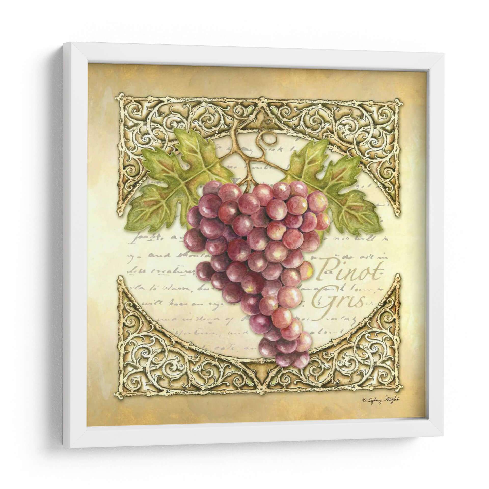 Sumérgete en la rica tradición vinícola con "Uvas de Vino I", una exquisita obra de arte de Sydney Wright. Este cuadro decorativo captura la esencia de un racimo de uvas tintas vibrantes, suspendido elegantemente dentro de un marco ornamentado de inspiración clásica. Los tonos cálidos y terrosos del fondo, junto con la delicada caligrafía antigua, evocan una sensación de historia y sofisticación, mientras que las uvas rojas y jugosas añaden un toque de color y vitalidad. La detallada ilustración de las uvas, con sus sutiles brillos y sombras, transmite una calidad casi táctil, invitando a apreciar la belleza natural y el arte de la vinificación. El estilo pictórico, que recuerda a las ilustraciones botánicas clásicas pero con un toque contemporáneo, hace que esta pieza sea versátil para una variedad de decoraciones. Ideal para añadir un acento de elegancia rústica a tu cocina, comedor o bodega, "Uvas de Vino I" es una elección perfecta para los amantes del vino y del arte que buscan infundir a sus espacios un aire de refinamiento y calidez. Deja que este cuadro decorativo sea el punto focal que celebre la buena vida y los placeres sencillos, creando un ambiente acogedor y distinguido en tu hogar u oficina.