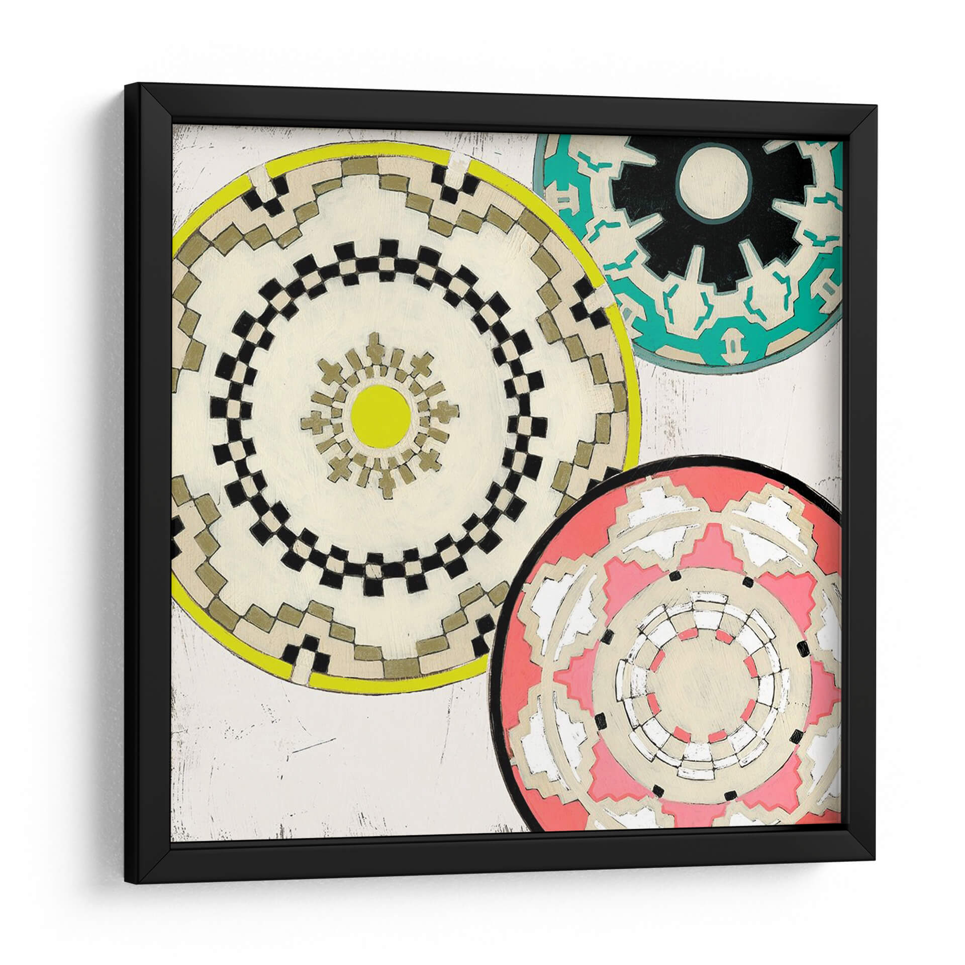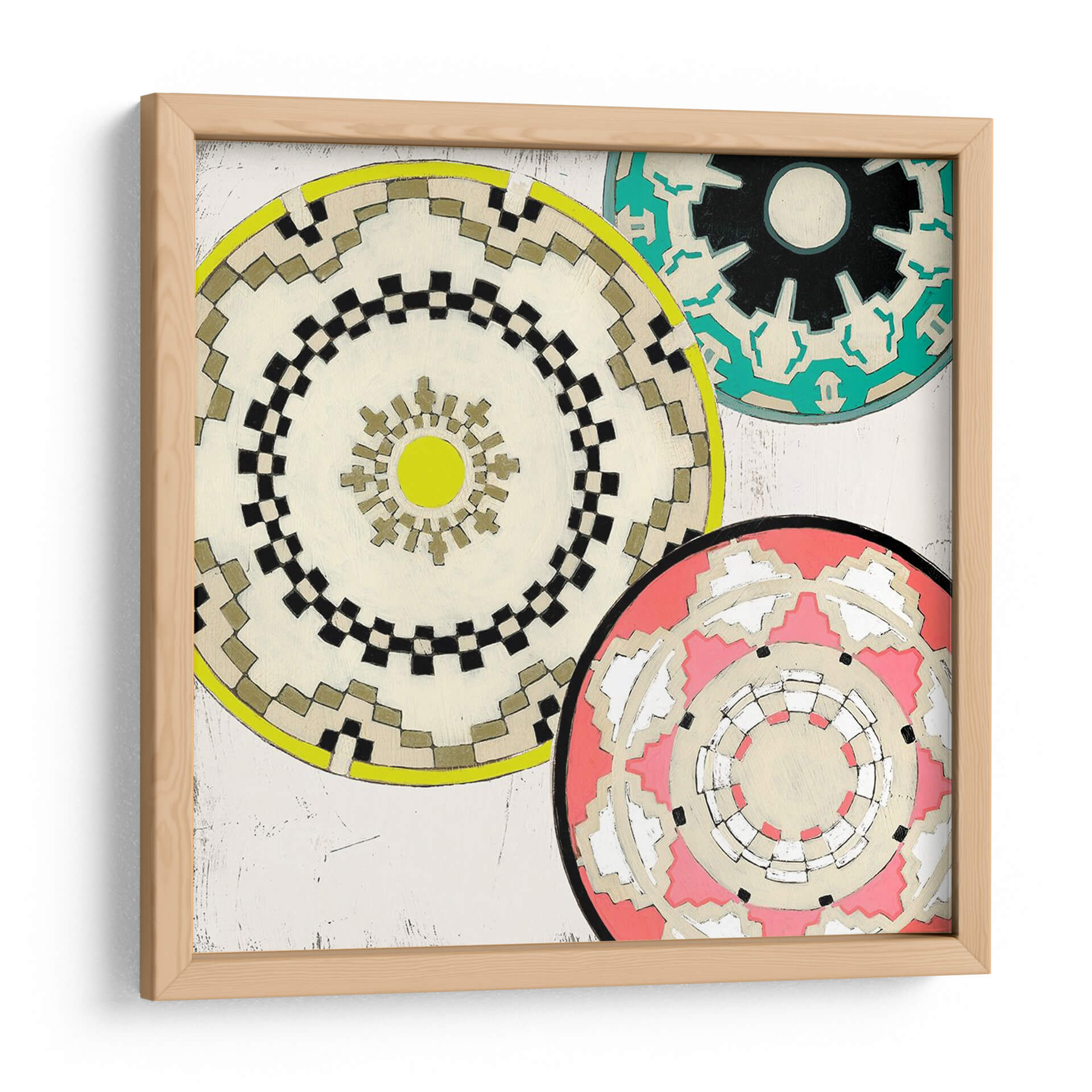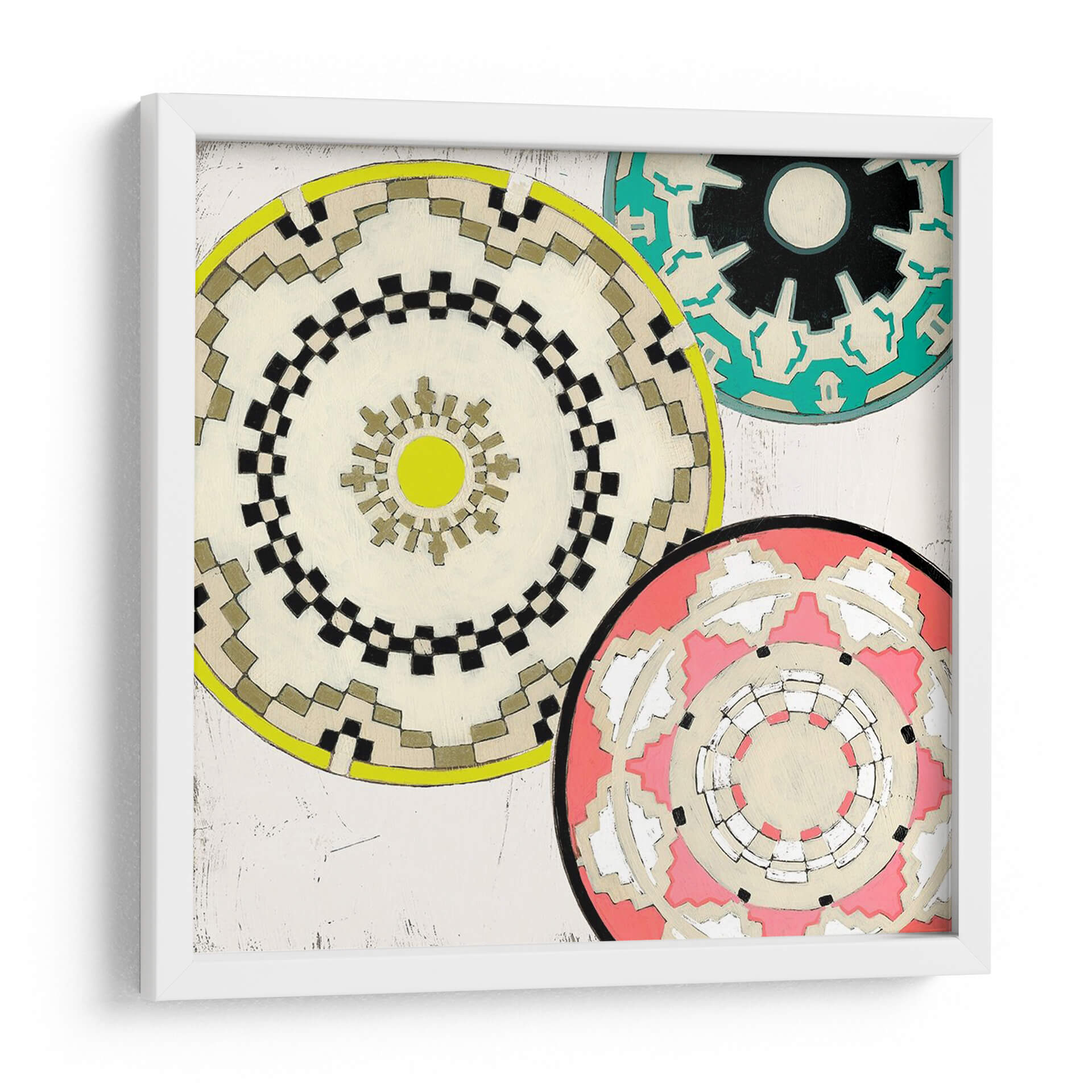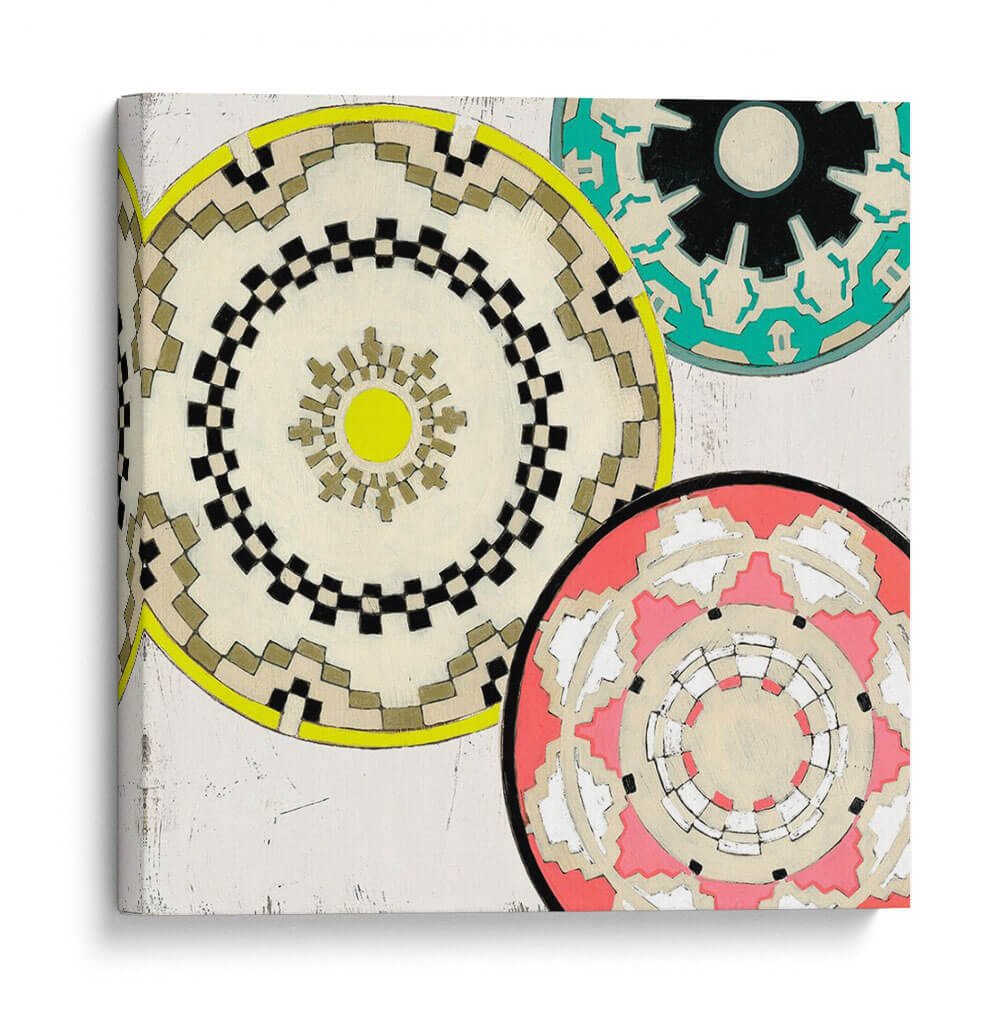 Embellece tu hogar con el cautivador cuadro decorativo "Cestas Modernas II" de June Erica Vess. Esta obra de arte contemporáneo presenta un vibrante tapiz de mandalas circulares, cada uno con intrincados patrones geométricos que evocan artesanía y diseño moderno. La paleta de colores, que fusiona tonos neutros como el beige y el blanco con audaces acentos de amarillo, verde azulado y coral, crea una composición visualmente atractiva y equilibrada. Los detalles texturizados y las sutiles imperfecciones en el fondo añaden profundidad y carácter, invitando a una contemplación pausada. "Cestas Modernas II" es ideal para añadir un toque de sofisticación étnica y energía positiva a cualquier sala de estar, comedor o estudio. Su diseño versátil lo convierte en un punto focal perfecto para interiores modernos, bohemios o eclécticos, complementando una variedad de estilos decorativos. Transforma tus espacios con esta pieza única que celebra la belleza de las formas y los colores.