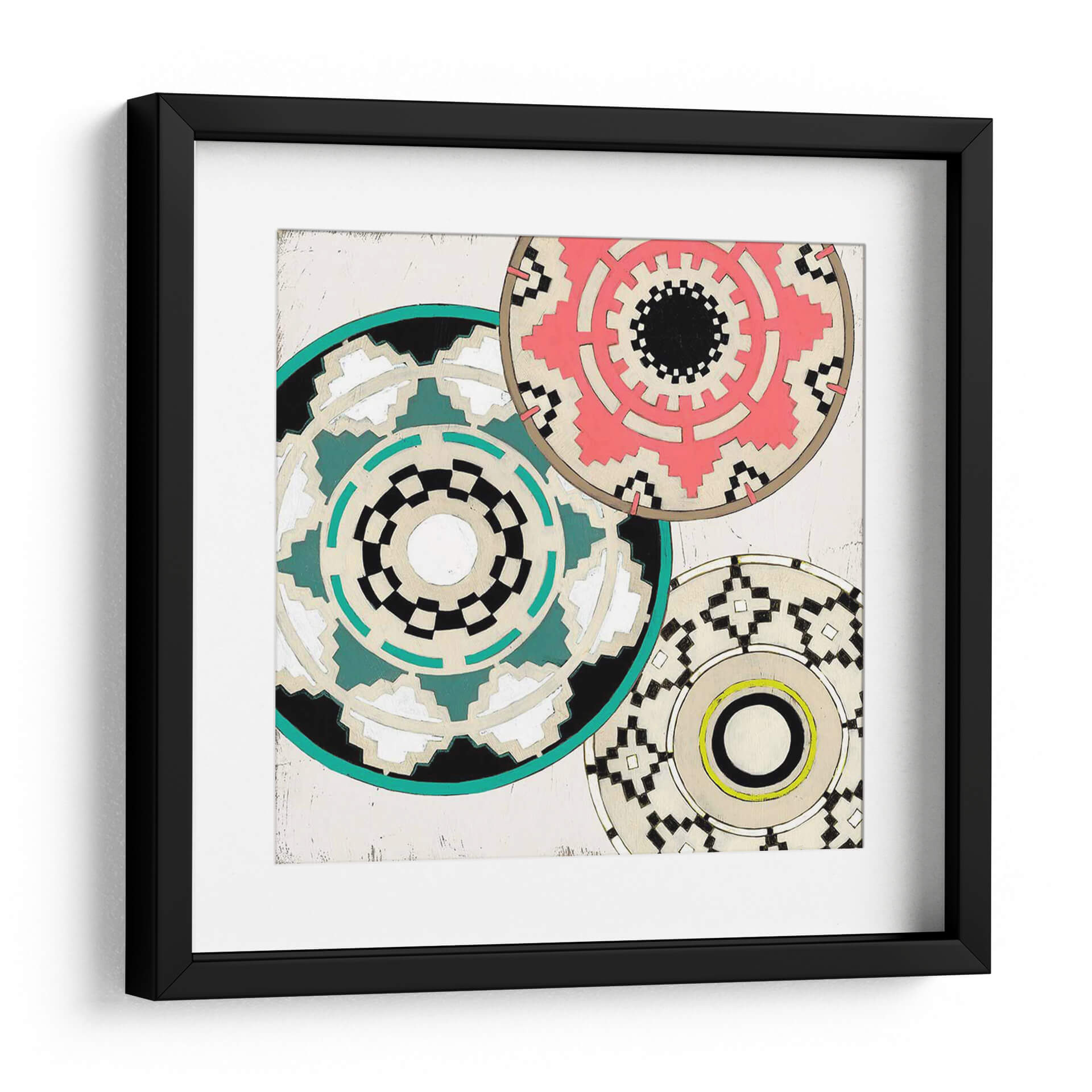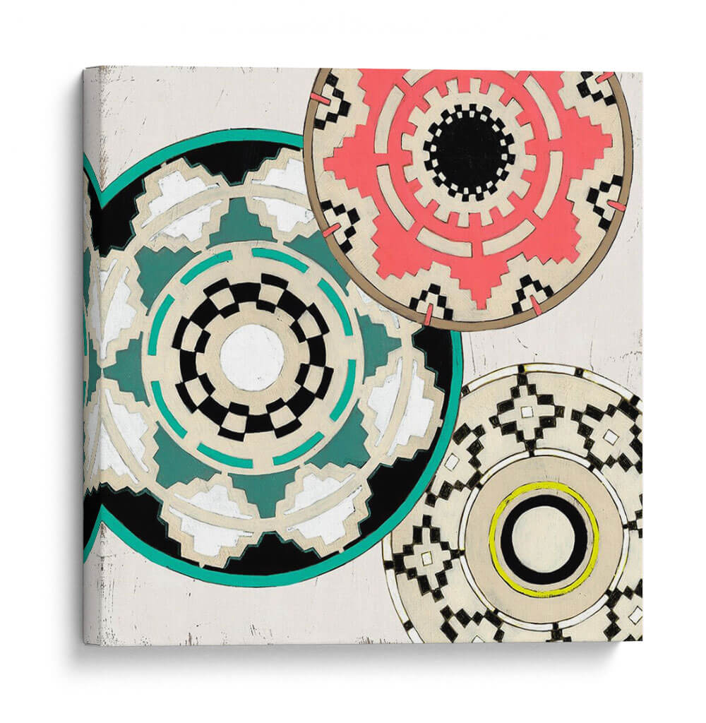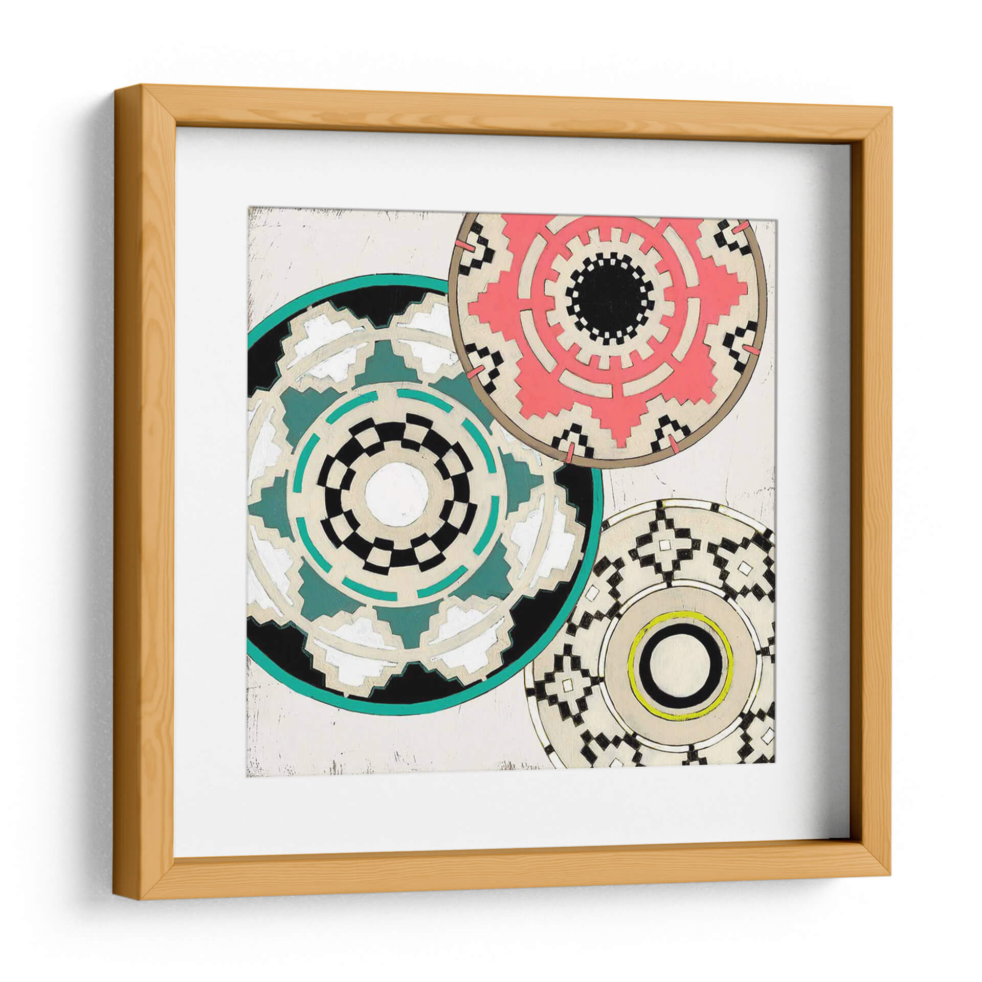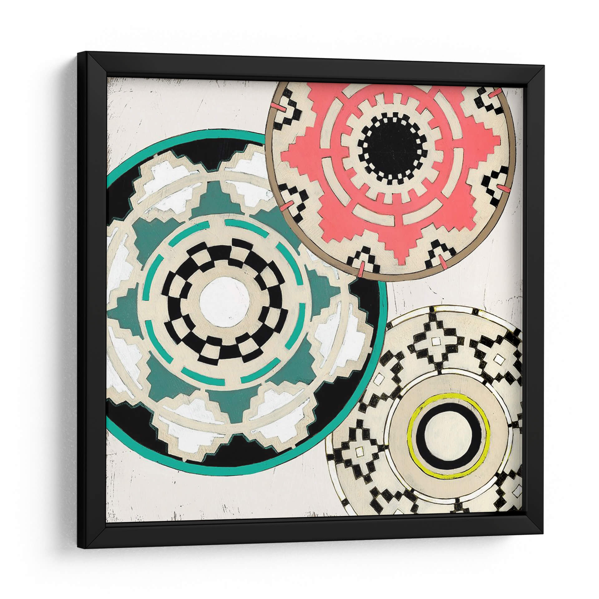 Inyecta un toque de sofisticación geométrica y color a tu hogar con "Cestas Modernas III", una obra de arte cautivadora de June Erica Vess. Este cuadro decorativo presenta un diseño abstracto inspirado en patrones de cestas tradicionales, reinventados con una sensibilidad contemporánea. La composición se centra en tres círculos concéntricos adornados con intrincados detalles y formas geométricas, creando un efecto visual dinámico y atractivo. La paleta de colores, que combina tonos cálidos como el coral y beige con acentos vibrantes de turquesa y negros profundos, aporta una energía equilibrada y un aire de modernidad. La textura sutil del fondo añade profundidad y un toque artesanal, haciendo que esta pieza sea ideal para cualquier espacio que busque un acento de arte abstracto y étnico-moderno. "Cestas Modernas III" es perfecta para salas de estar, comedores, oficinas o cualquier habitación donde desees añadir un elemento de diseño único y con carácter. Su estilo versátil se adapta a decoraciones bohemias, modernas o eclécticas, invitando a la contemplación y añadiendo un punto focal distintivo. Transforma tus paredes con esta pieza que fusiona la tradición con la estética vanguardista.