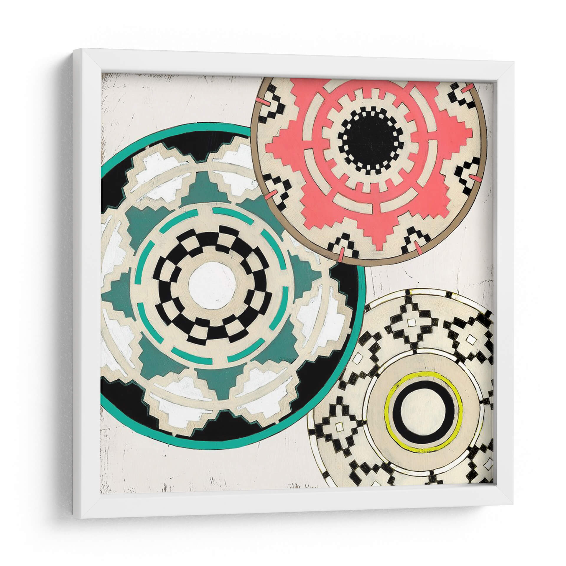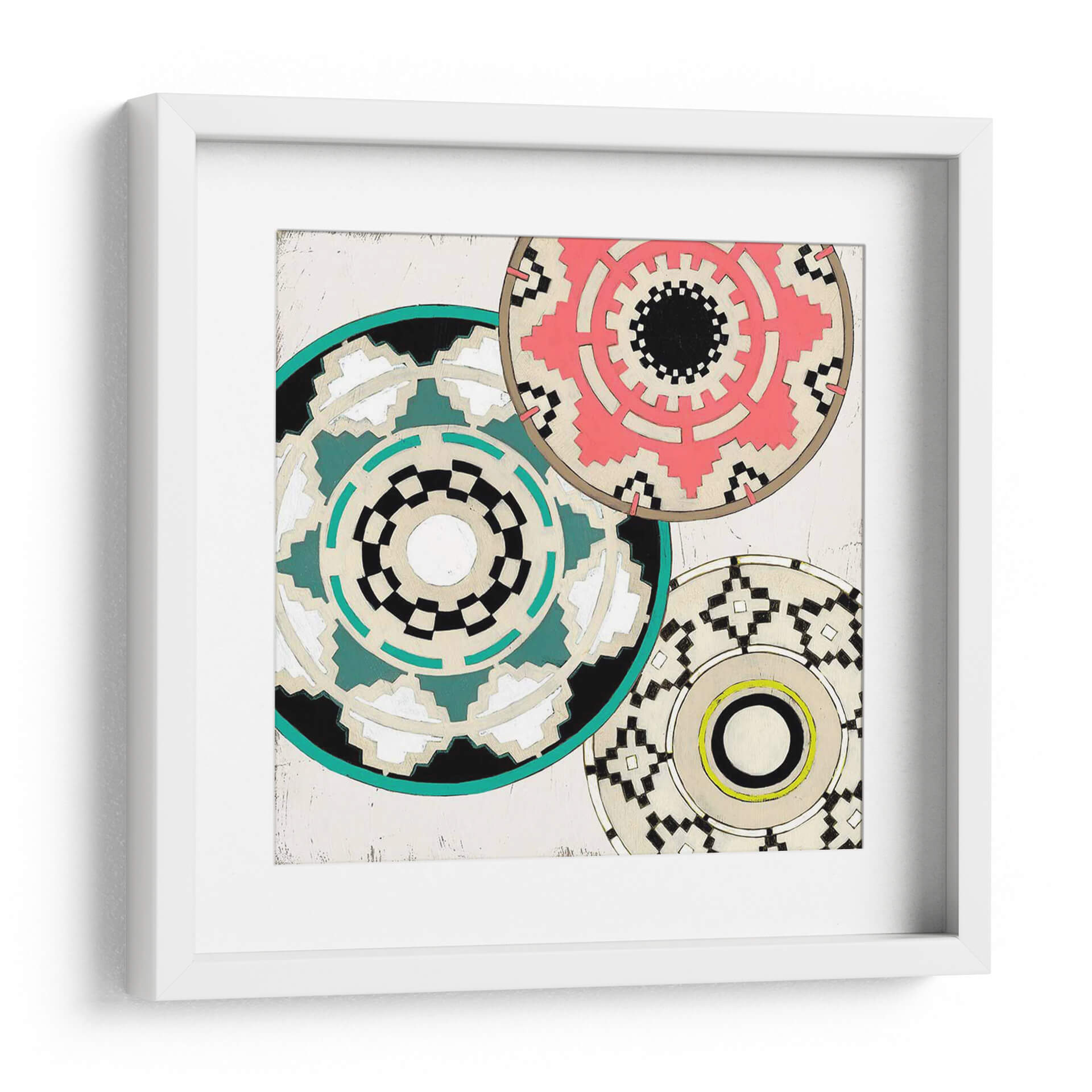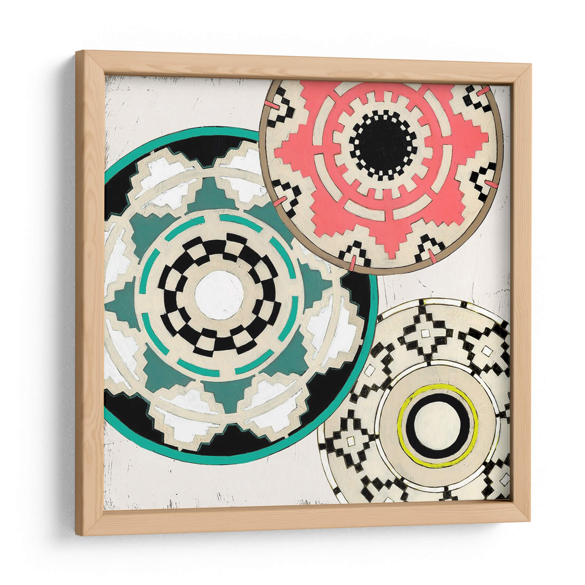 Inyecta un toque de sofisticación geométrica y color a tu hogar con "Cestas Modernas III", una obra de arte cautivadora de June Erica Vess. Este cuadro decorativo presenta un diseño abstracto inspirado en patrones de cestas tradicionales, reinventados con una sensibilidad contemporánea. La composición se centra en tres círculos concéntricos adornados con intrincados detalles y formas geométricas, creando un efecto visual dinámico y atractivo. La paleta de colores, que combina tonos cálidos como el coral y beige con acentos vibrantes de turquesa y negros profundos, aporta una energía equilibrada y un aire de modernidad. La textura sutil del fondo añade profundidad y un toque artesanal, haciendo que esta pieza sea ideal para cualquier espacio que busque un acento de arte abstracto y étnico-moderno. "Cestas Modernas III" es perfecta para salas de estar, comedores, oficinas o cualquier habitación donde desees añadir un elemento de diseño único y con carácter. Su estilo versátil se adapta a decoraciones bohemias, modernas o eclécticas, invitando a la contemplación y añadiendo un punto focal distintivo. Transforma tus paredes con esta pieza que fusiona la tradición con la estética vanguardista.