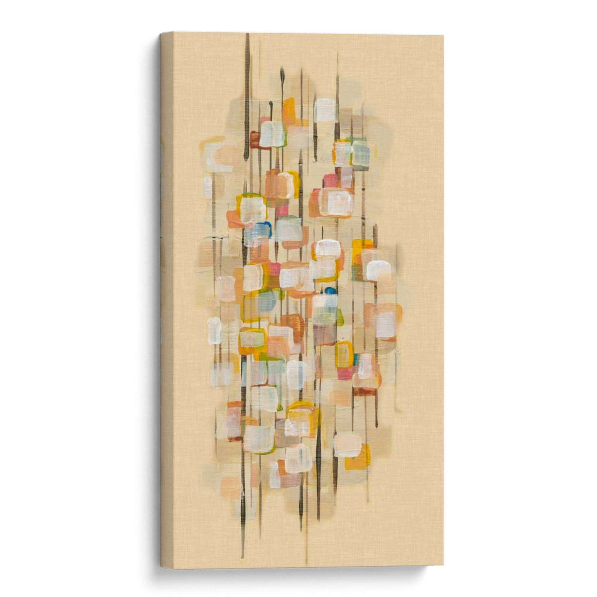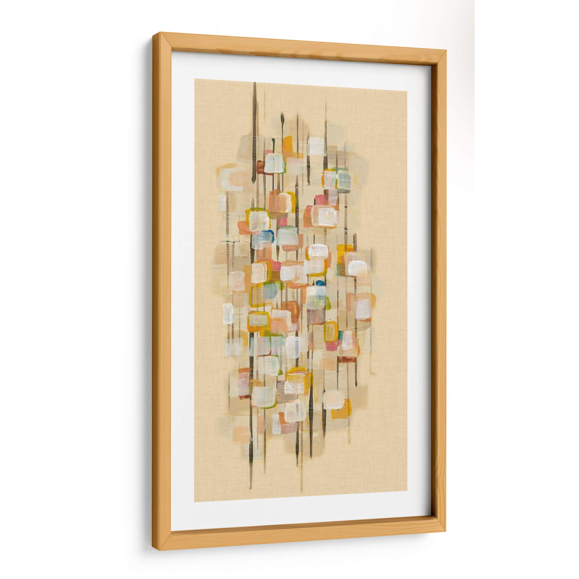 Descubre "Mapa De La Ciudad Ii" de Charles McMullen, una obra de arte abstracto que evoca la energía y la complejidad de un entorno urbano a través de una paleta de colores cálidos y texturas sutiles. Este cuadro decorativo presenta una composición vertical con bloques de color que sugieren edificios o elementos urbanos, suspendidos sobre líneas verticales que simulan calles o rascacielos. Los tonos ocres, blancos, naranjas y toques de azul y verde crean una atmósfera vibrante pero armoniosa, ideal para infundir vida y carácter a cualquier espacio. La técnica pictórica, con pinceladas visibles y un acabado texturizado, añade profundidad y un toque artesanal. "Mapa De La Ciudad Ii" es perfecto para salas de estar modernas, oficinas o cualquier estancia donde se busque añadir un punto focal de interés visual y una conexión con la estética contemporánea. Su diseño abstracto permite una interpretación personal, convirtiéndola en una pieza única que dialoga con tu estilo decorativo y estimula la conversación.