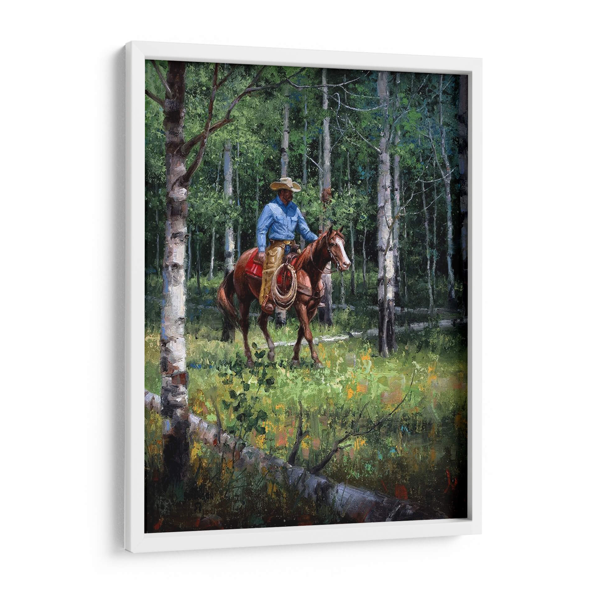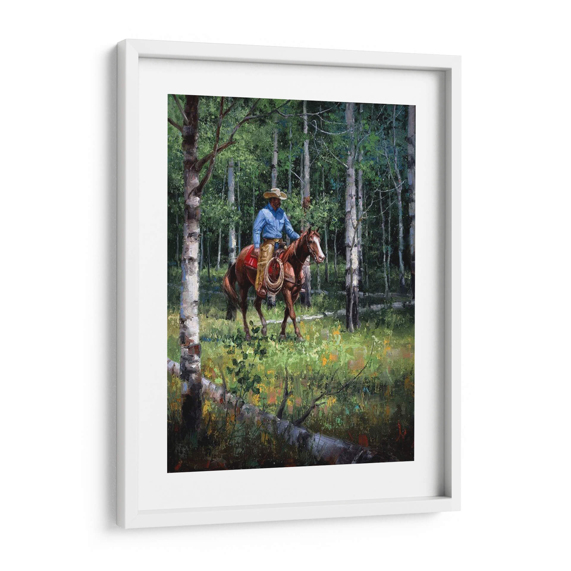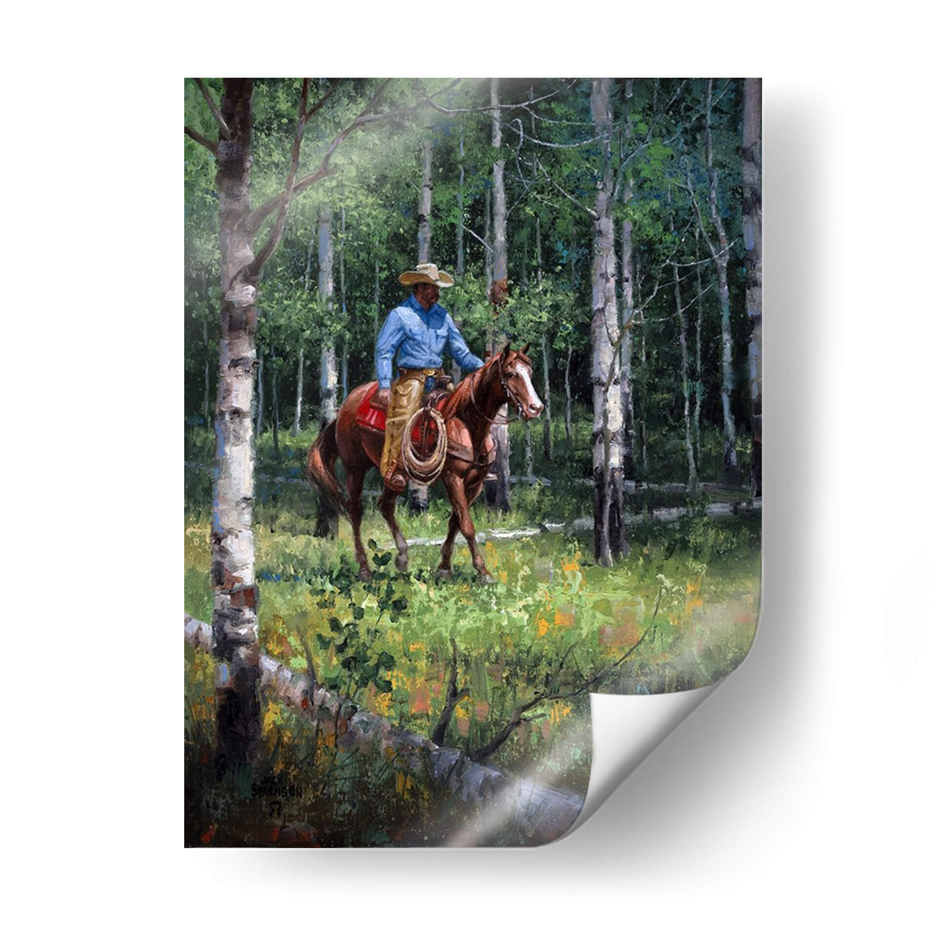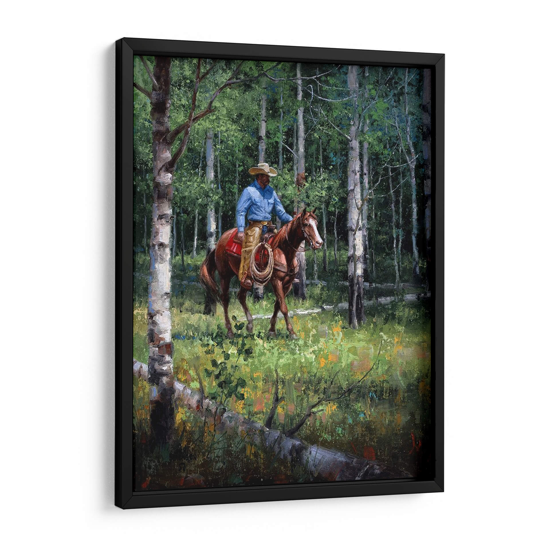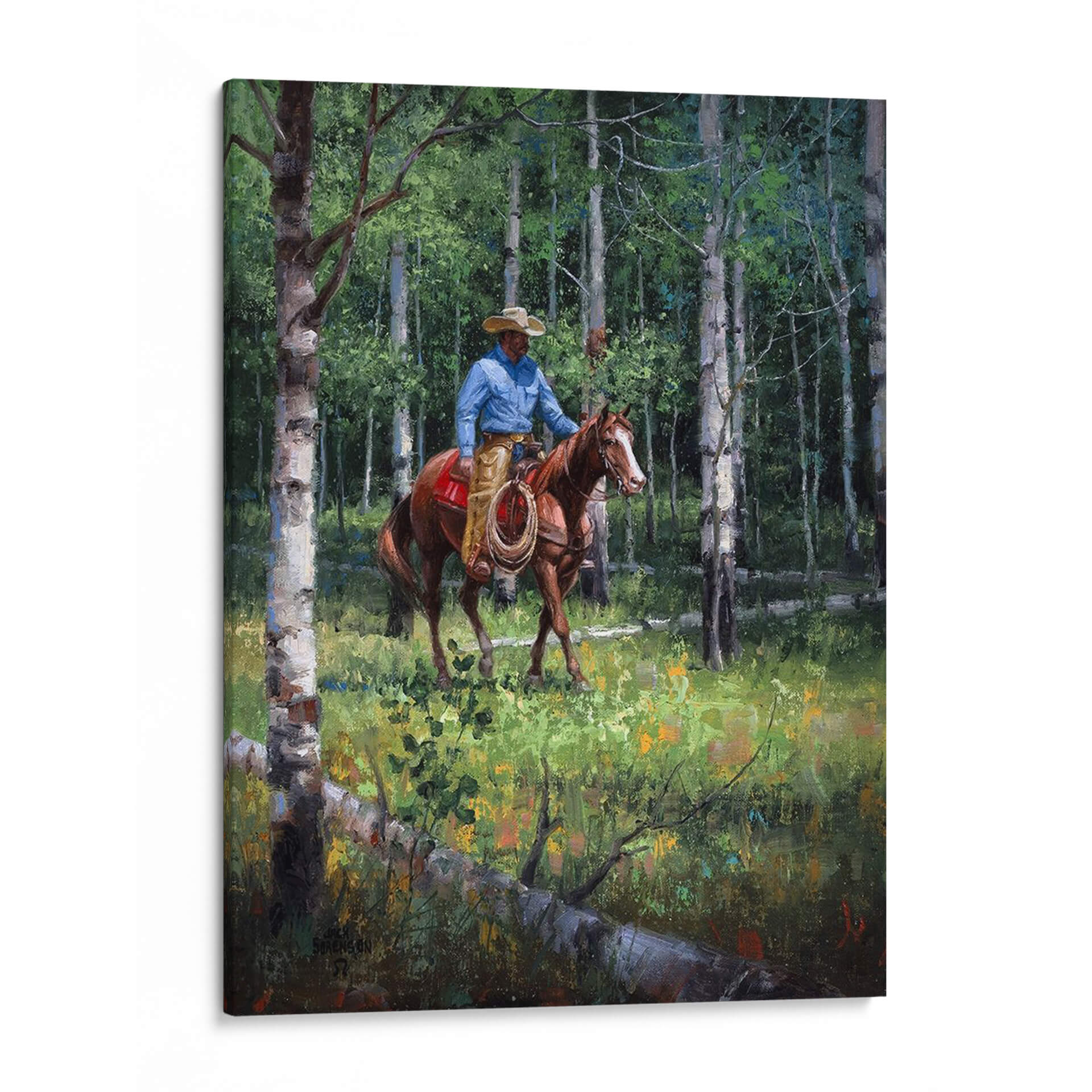 Sumérgete en la serenidad de la naturaleza con "A Través Del Aspen", una obra maestra de Jack Sorenson que captura la esencia de un vaquero solitario cabalgando a través de un bosque de álamos. La pintura presenta una paleta de colores vibrantes y terrosos, dominada por verdes profundos del follaje y los troncos blancos y grises de los álamos, salpicados con toques de amarillo y naranja en la vegetación del suelo. La luz se filtra a través de las hojas, creando un juego de luces y sombras que aporta profundidad y realismo a la escena. El vaquero, ataviado con su sombrero y camisa azul, se mueve con gracia sobre su caballo, evocando una sensación de paz y conexión con el entorno salvaje. Esta pieza es perfecta para quienes buscan añadir un toque de naturaleza, aventura y tranquilidad a su hogar u oficina. Ideal para salones, estudios o dormitorios, este cuadro decorativo invita a la contemplación y transporta al espectador a un momento de quietud en medio de la vastedad del bosque. La habilidad de Sorenson para plasmar la atmósfera y el detalle es evidente, haciendo de "A Través Del Aspen" una adición valiosa a cualquier colección de arte.