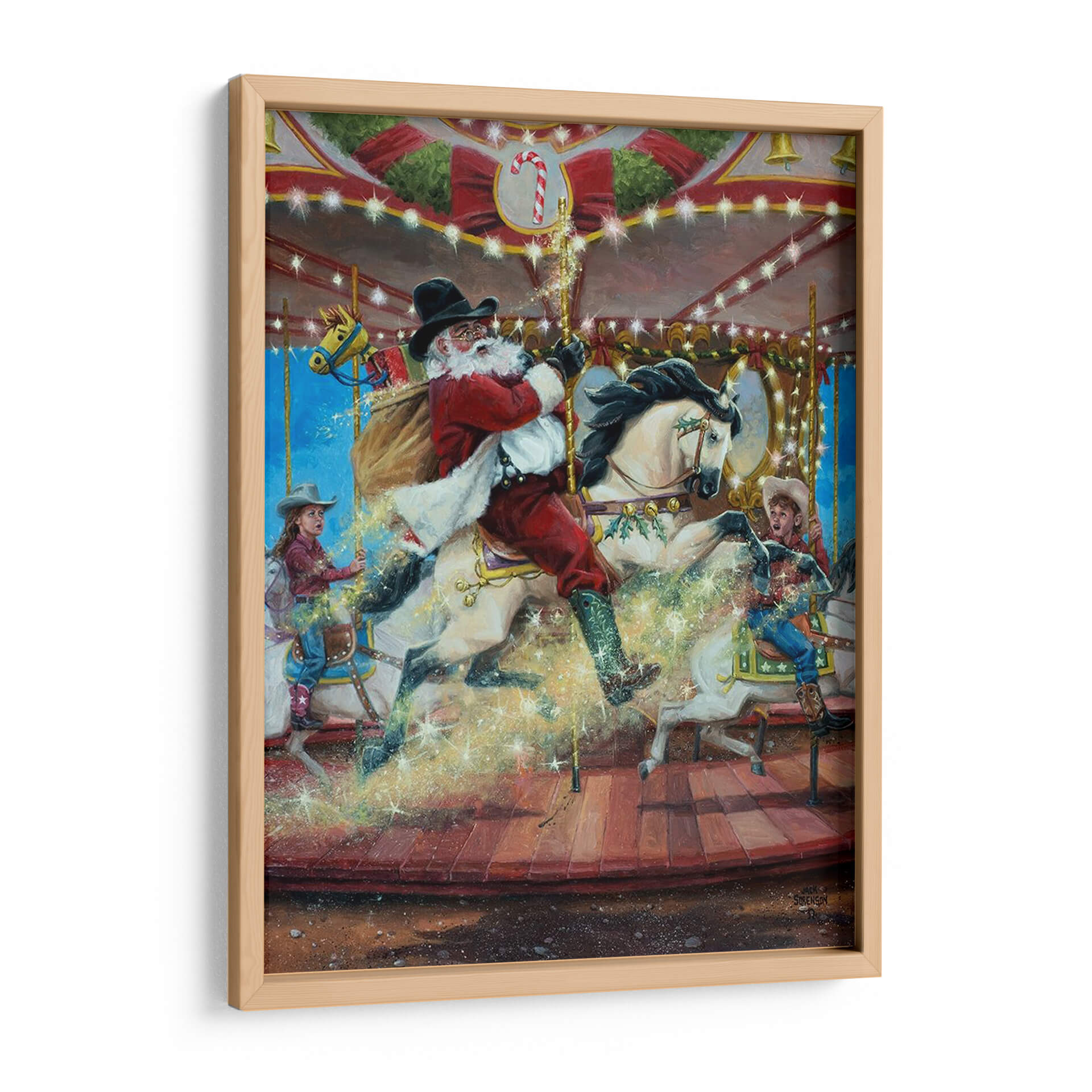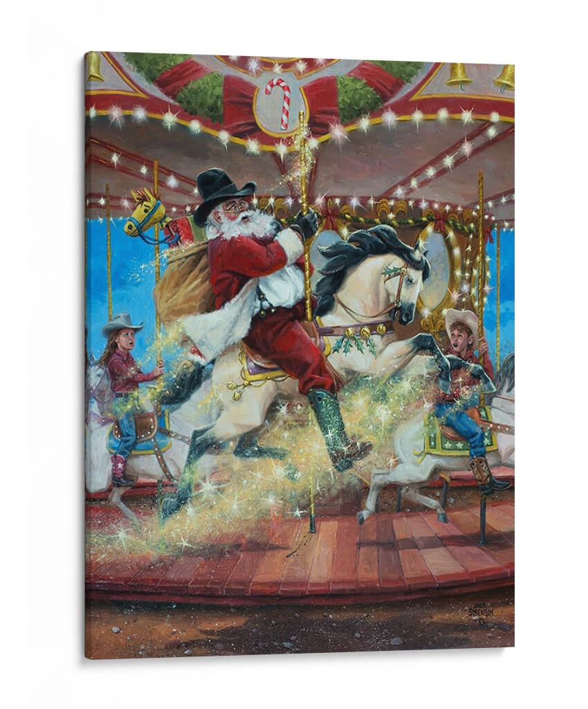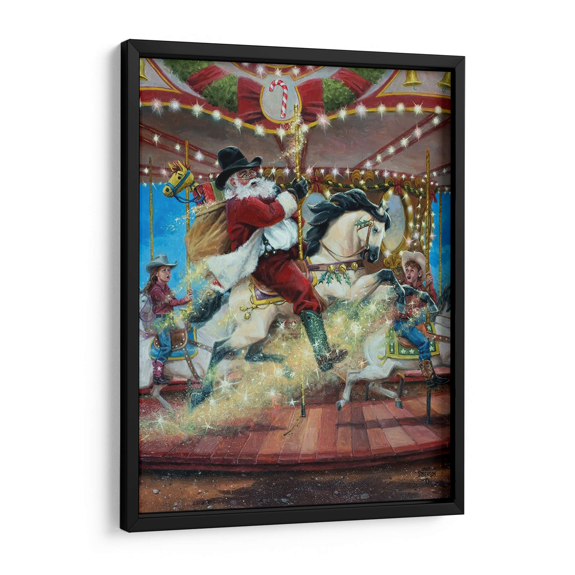 Sumérgete en la magia de la temporada con "Alegrarse", una obra de arte cautivadora del artista Jack Sorenson. Este cuadro decorativo captura la esencia vibrante de un carrusel navideño, donde Santa Claus, con su característica barba blanca y traje rojo, lidera la diversión. La escena se llena de movimiento y alegría, con niños vestidos de vaqueros y figuras de caballos que parecen cobrar vida sobre el fondo de luces festivas y decoraciones rojas y verdes. La paleta de colores es rica y cálida, dominada por rojos intensos, blancos brillantes y toques de azul cielo, creando una atmósfera de pura felicidad y celebración. El estilo pictórico, con pinceladas visibles y una atención al detalle en las expresiones y texturas, aporta una sensación de calidez y nostalgia. "Alegrarse" es la pieza perfecta para añadir un toque de espíritu festivo y encanto a tu hogar u oficina, evocando recuerdos de la infancia y la magia de la Navidad. Ideal para salones, comedores o cualquier espacio que busque un punto focal lleno de vida y optimismo, este cuadro decorativo es una invitación a revivir la alegría de las fiestas. Su composición dinámica y los destellos de purpurina que emanan de los caballos añaden un elemento de fantasía que encantará a grandes y pequeños, convirtiendo cualquier ambiente en un escenario de cuento.