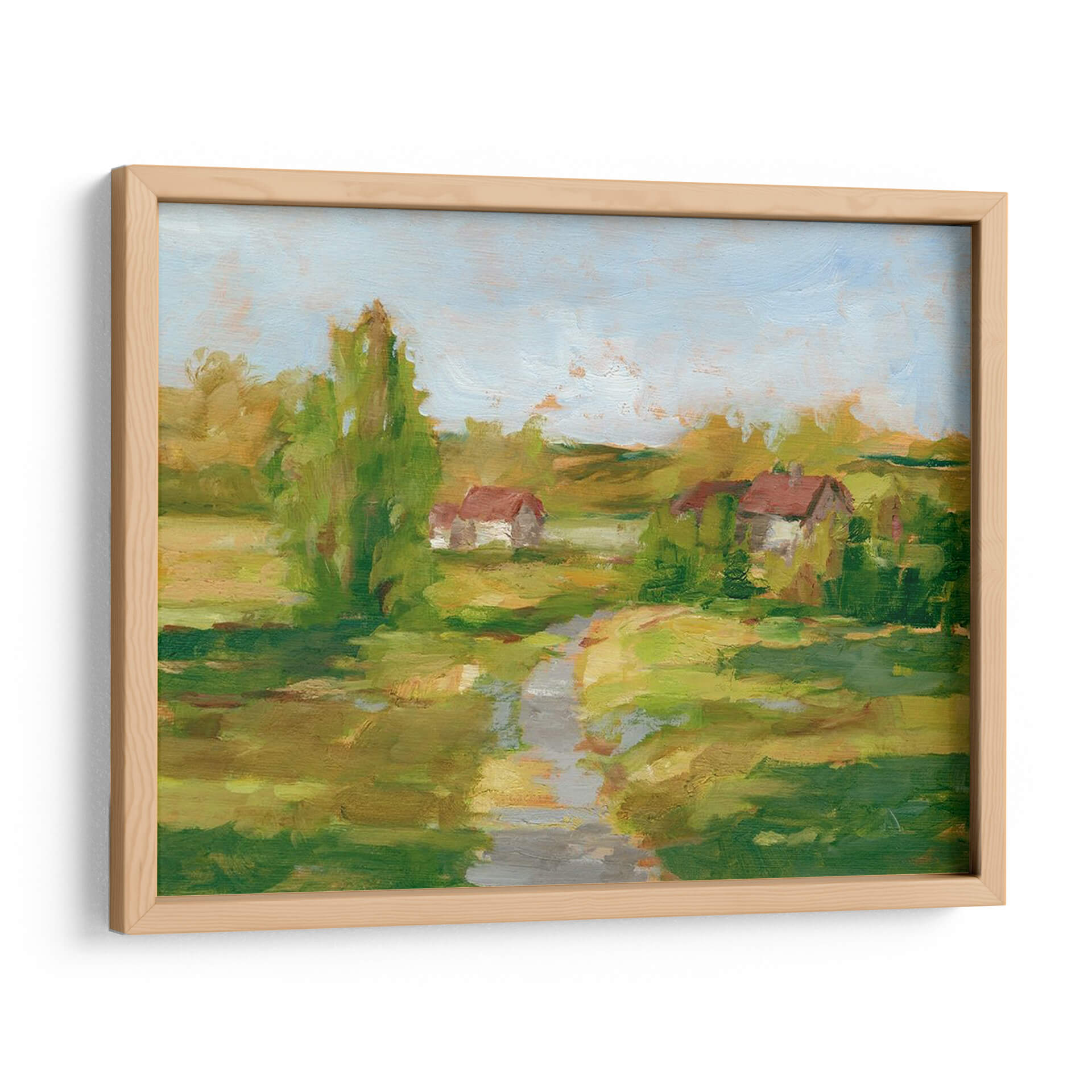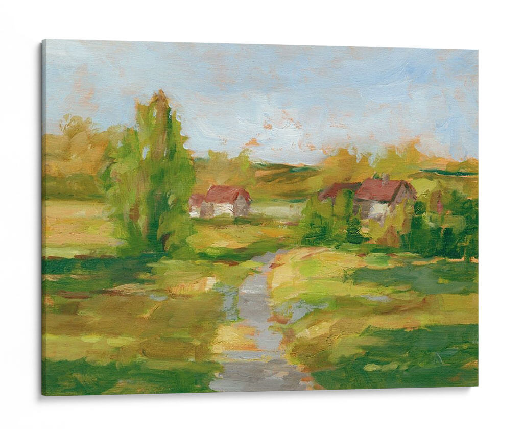 Sumérgete en la tranquilidad del campo con "Casa Rural Inglesa II", una obra de arte que captura la esencia de un idílico paisaje rural. El artista Ethan Harper nos transporta a un entorno sereno, donde pequeñas casas con tejados rojizos se integran armónicamente en un paisaje de verdes vibrantes y ocres dorados. La pincelada suelta y expresiva, reminiscente del impresionismo, dota a la escena de una atmósfera de luz y movimiento, invitando a la contemplación. Los colores, dominados por tonos tierra, verdes y un cielo azul pálido salpicado de nubes sutiles, crean una sensación de paz y calidez. Este cuadro decorativo es perfecto para añadir un toque de naturaleza y serenidad a cualquier estancia, desde una sala de estar acogedora hasta un dormitorio que invite al descanso. Su composición equilibrada y el evocador estilo lo convierten en una pieza versátil que aporta sofisticación y calma. Ideal para amantes del arte paisajista y aquellos que buscan un refugio visual en su hogar.