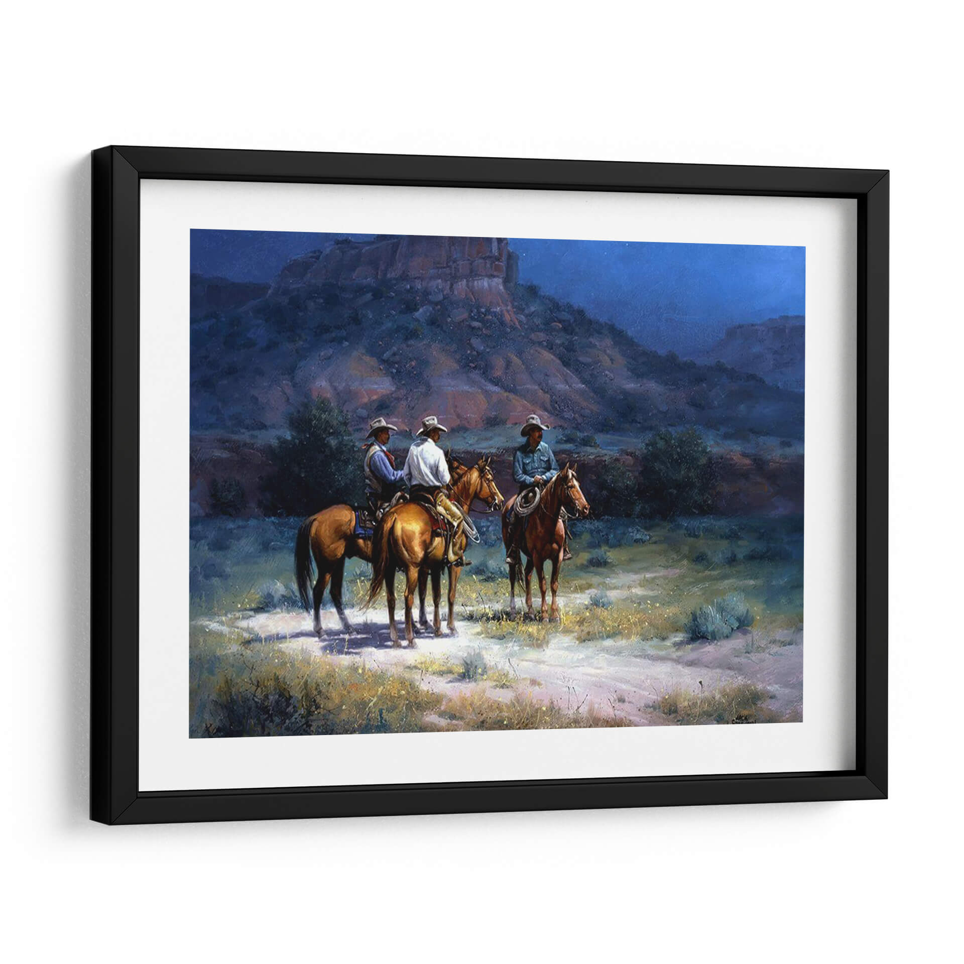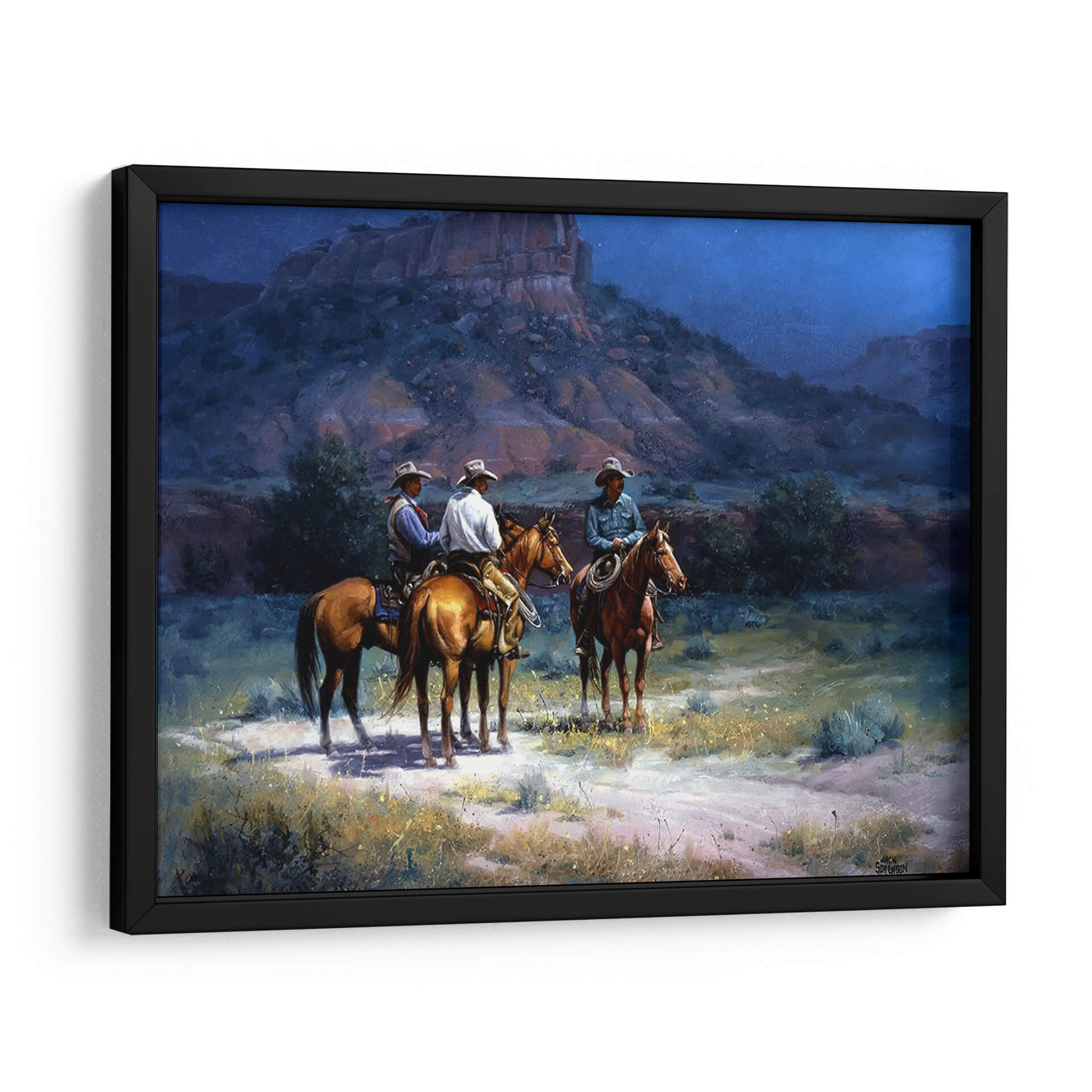 Sumérgete en la atmósfera mística del oeste americano con "Luz De La Luna" de Jack Sorenson. Este cuadro decorativo captura un momento de quietud y camaradería bajo el cielo estrellado, evocando la esencia de los vaqueros y la vastedad del paisaje desértico. Sorenson emplea una paleta de colores profundos y nocturnos, con azules intensos y toques de luz lunar que bañan las formaciones rocosas y la vegetación del desierto. Las figuras de los tres jinetes y sus caballos, representados con un realismo conmovedor, invitan a la reflexión sobre la vida, la aventura y la conexión con la naturaleza. El estilo pictórico, que combina el realismo con una pincelada expresiva, añade una capa de profundidad y emoción a la escena. Este cuadro decorativo es perfecto para añadir un toque de serenidad y narrativa a cualquier espacio, desde una sala de estar rústica hasta un estudio personal o una oficina que busque inspiración en la historia y la belleza indómita de la frontera. "Luz De La Luna" no es solo una obra de arte, es una ventana a un mundo de historias no contadas y la tranquilidad de una noche en la naturaleza salvaje, ideal para quienes aprecian el arte figurativo y las escenas que narran una historia.