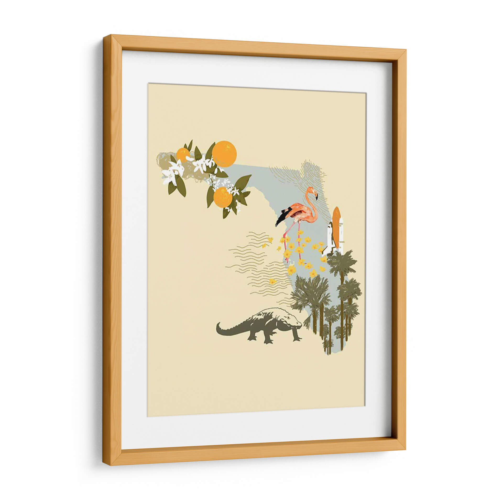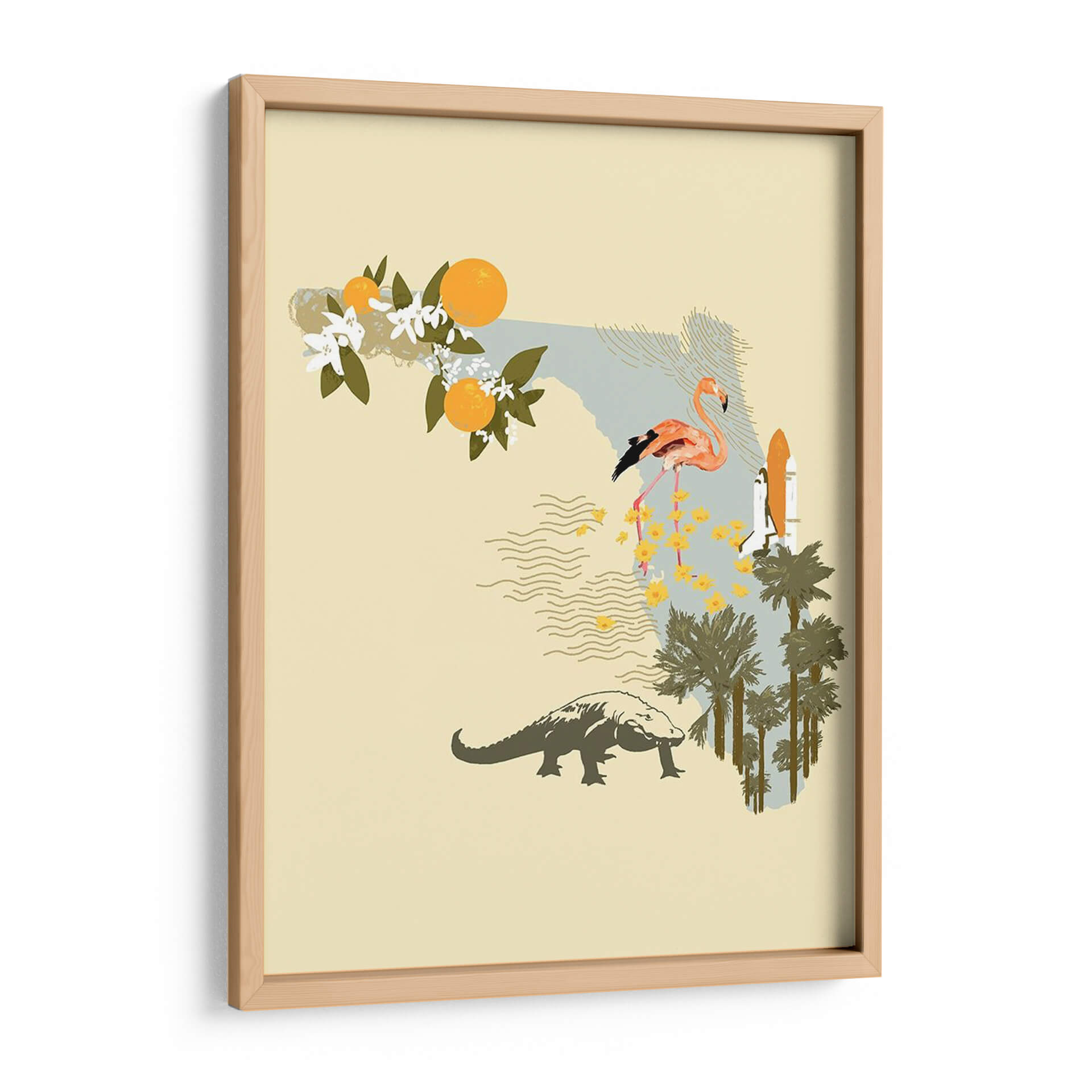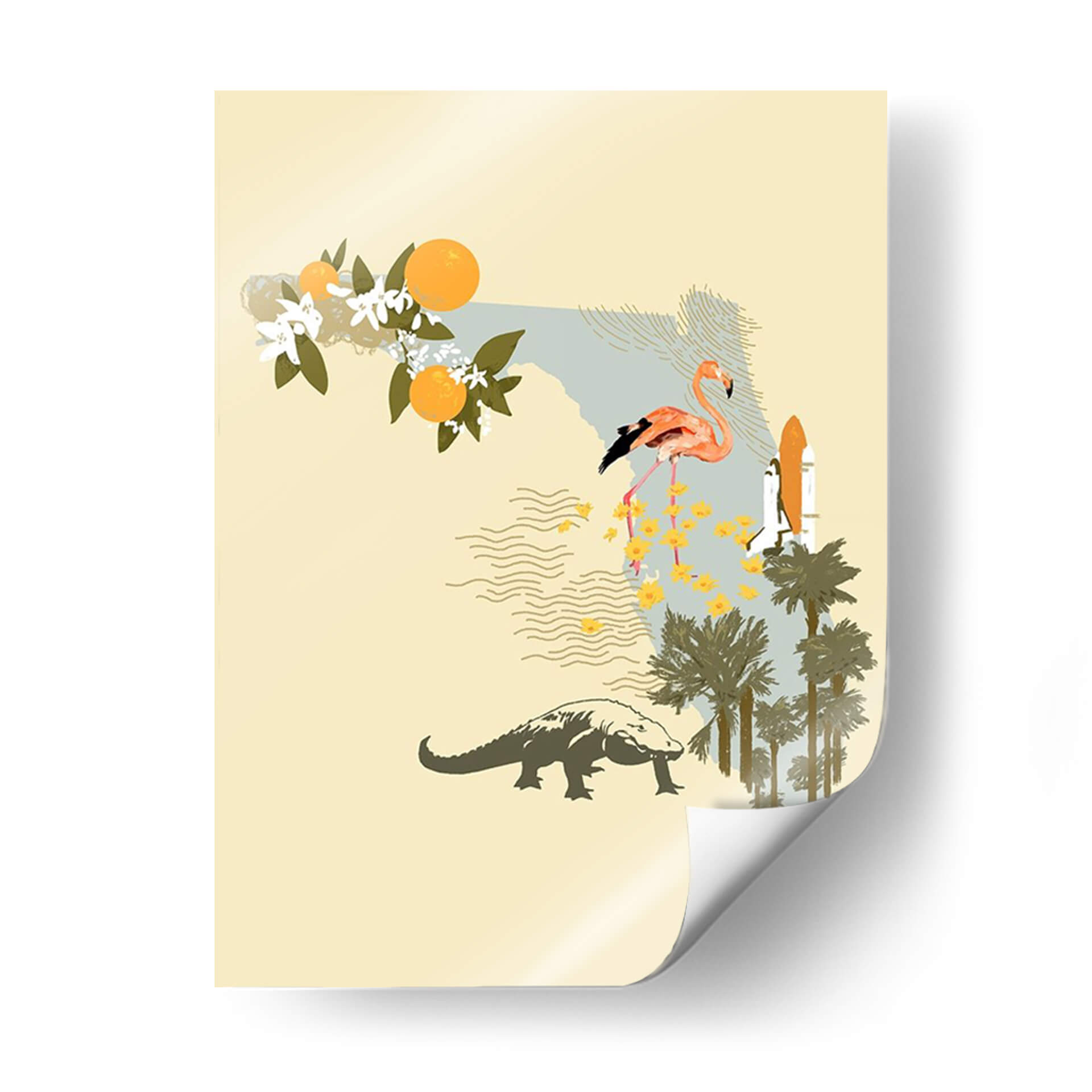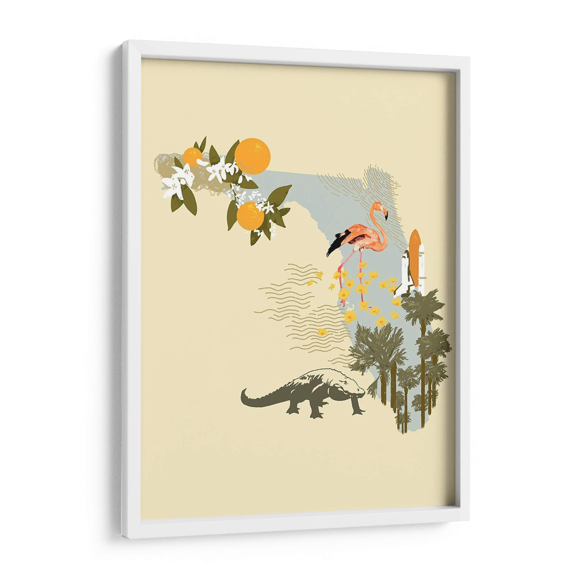 Captura la esencia vibrante y única de Florida con este cautivador cuadro decorativo, 'Estado Ilustrado-Florida' de W. Rutledge. La obra es un collage visual que evoca la rica biodiversidad y el espíritu icónico del estado. Verás una silueta estilizada de Florida delineada con trazos suaves, sobre un fondo de color crema cálido. Detalladamente, la pieza integra elementos representativos: una rama de naranjo con sus flores blancas y frutos anaranjados, un flamenco de color rosa vibrante destacando en el centro, palmeras frondosas que sugieren un clima tropical, y la silueta de un caimán en primer plano, recordándonos la fauna salvaje de los Everglades. Un toque inesperado y futurista lo aporta la silueta de un cohete espacial, aludiendo a la industria aeroespacial de la región. La paleta de colores, dominada por tonos tierra, naranjas, rosas y verdes, crea una atmósfera alegre y exótica. Este cuadro es perfecto para añadir un toque de personalidad y conversación a cualquier sala de estar moderna, oficina o espacio que busque celebrar la cultura y el paisaje de Florida. Una pieza que transporta a sus espectadores a un viaje imaginario por los encantos del Estado del Sol.