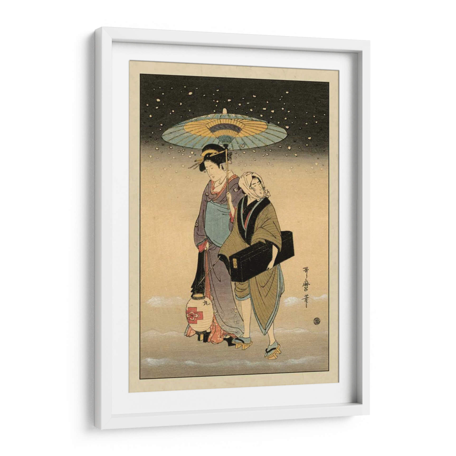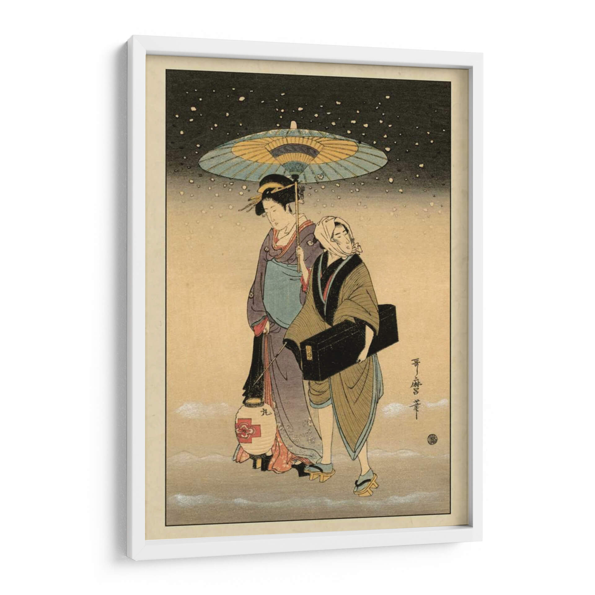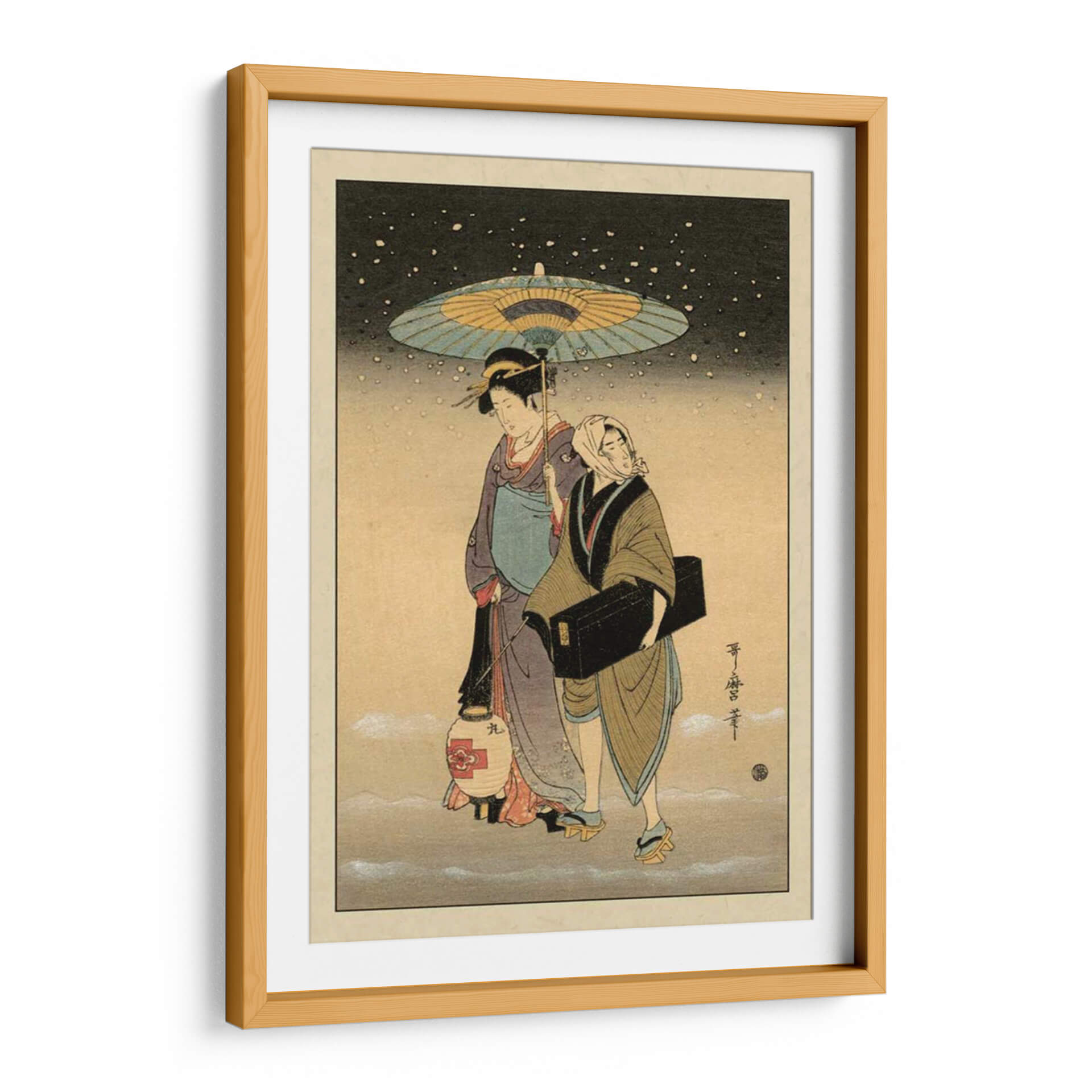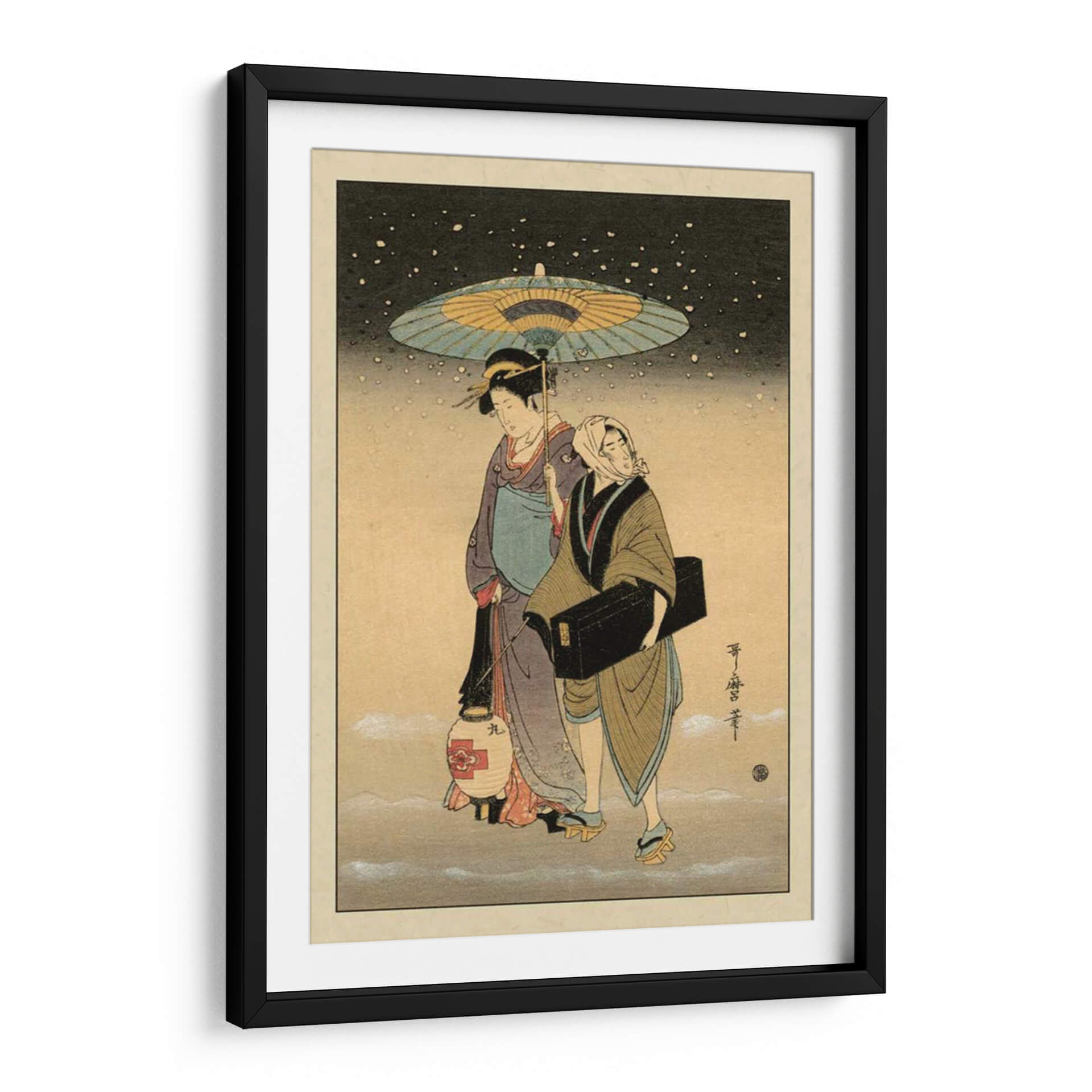 Sumérgete en la serena belleza de "Las Mujeres De Japón I", una obra maestra del Vision Studio que captura la esencia de una caminata bajo la lluvia en el Japón tradicional. Dos figuras femeninas, envueltas en vestimentas de época y protegidas por un paraguas decorativo, avanzan con paso firme sobre un terreno que evoca la humedad y el ambiente tranquilo de un día lluvioso. La paleta de colores, dominada por tonos cálidos y terrosos que contrastan con el azul del paraguas y los detalles en morado y ocre de los kimonos, crea una atmósfera introspectiva y pacífica. La iluminación sutil, acentuada por el resplandor de un farolillo japonés, aporta un toque de calidez y misterio a la escena. Este cuadro decorativo, con su estilo que evoca las estampas Ukiyo-e, es perfecto para añadir un toque de sofisticación y serenidad a tu hogar u oficina. Ideal para espacios que buscan una conexión con la cultura oriental, la tranquilidad y la belleza clásica. Transforma tu pared con esta pieza que invita a la contemplación y al aprecio por los momentos cotidianos, aportando una narrativa visual única y evocadora a tu decoración.