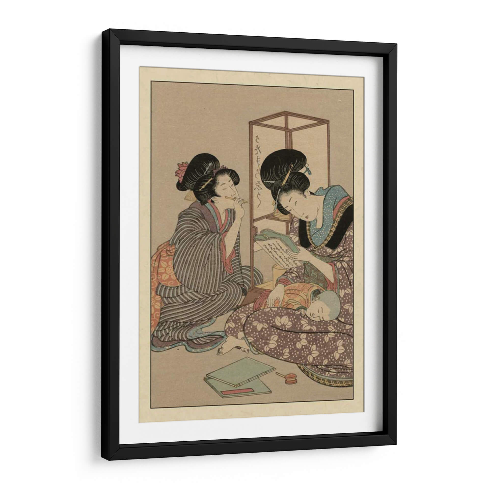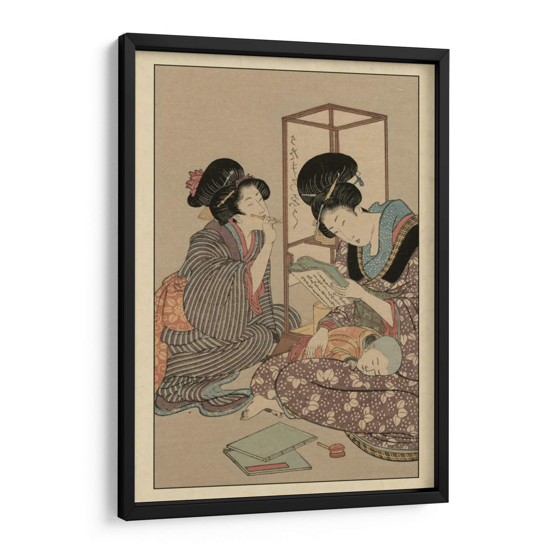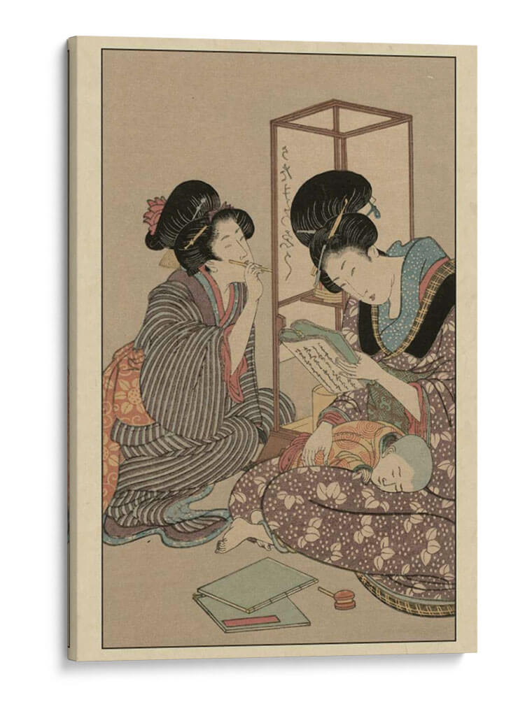 Sumérgete en la serenidad y la elegancia de "Las Mujeres En Japón II", una obra de arte que captura un momento íntimo y cotidiano de la vida japonesa. Este cuadro decorativo, creado por Vision Studio, transporta al espectador a través de su detallada representación de dos mujeres vestidas con kimonos tradicionales, absortas en sus actividades. Una de ellas se arregla el cabello con delicadeza mientras la otra se inclina sobre un documento, quizás leyendo o escribiendo, con un niño dormido plácidamente a su lado. La paleta de colores, dominada por tonos tierra, grises y acentos de coral y azul, evoca una atmósfera de calma y contemplación, propia del arte ukiyo-e. La composición, con sus líneas fluidas y la atención al detalle en los patrones de las vestimentas, invita a la admiración. Esta pieza es ideal para añadir un toque de sofisticación y cultura a cualquier espacio, ya sea un salón, un dormitorio o un estudio. "Las Mujeres En Japón II" no es solo una decoración de pared, sino una ventana a una tradición y una escena de profunda tranquilidad, perfecta para quienes buscan un arte que inspire paz y belleza en su hogar u oficina.