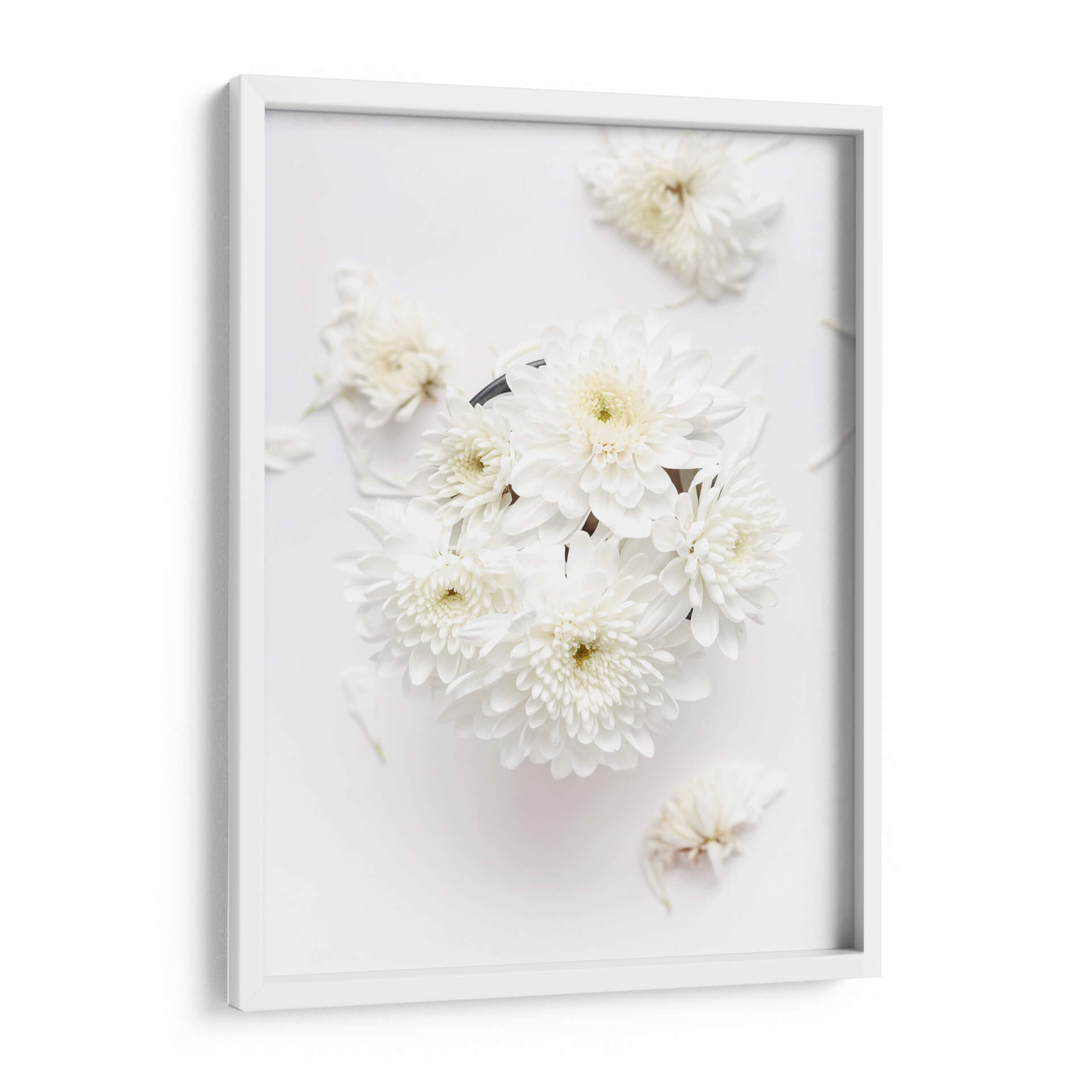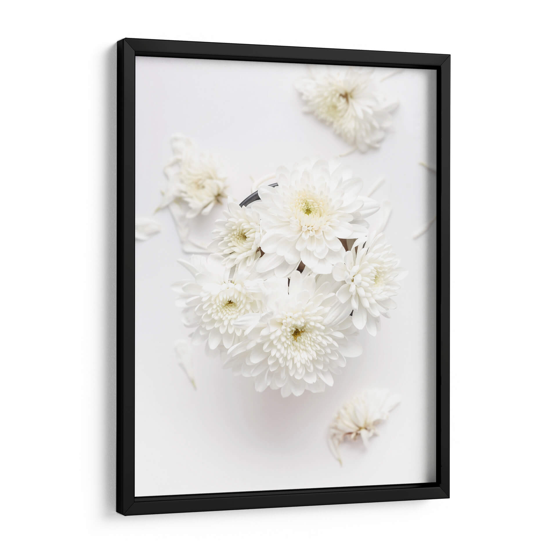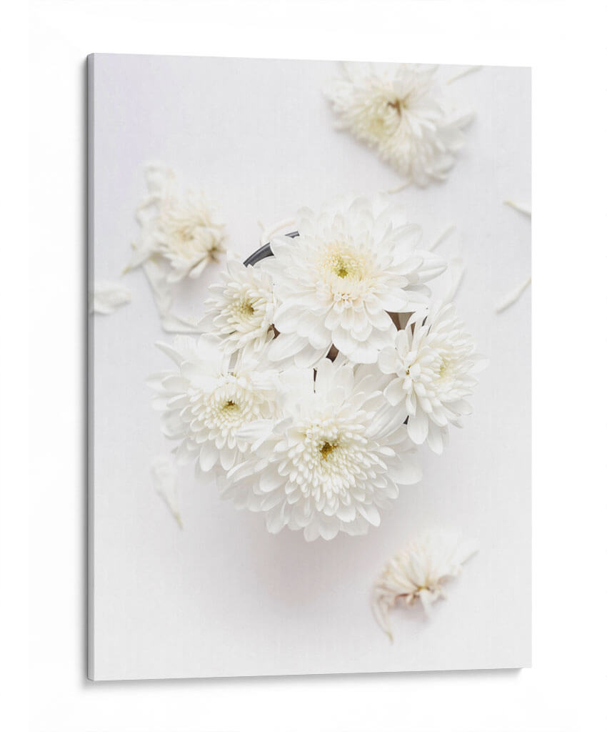 Sumérgete en la pureza y la serenidad con esta exquisita obra de arte titulada "Blanco sobre Blanco". Presenta un delicado arreglo de flores blancas, posiblemente crisantemos, dispuestas con una gracia etérea sobre un fondo minimalista y luminoso. La composición, que parece capturada desde una perspectiva cenital o ligeramente inclinada, resalta la belleza intrínseca de cada pétalo y la textura suave de las flores. Predomina una paleta de colores monocromática en tonos blancos y cremas, creando una atmósfera de calma, paz y elegancia sutil. Los sutiles contrastes de luz y sombra, junto con los pétalos caídos dispersos, añaden profundidad y un toque de melancolía poética a la pieza. Este lienzo es ideal para espacios que buscan un aire de sofisticación discreta, como dormitorios, salas de estar minimalistas, estudios o incluso oficinas que deseen proyectar tranquilidad y claridad. Su diseño atemporal y su evocadora simplicidad lo convierten en un complemento perfecto para cualquier decoración interior, aportando un toque de naturaleza y belleza serena que invita a la contemplación y al bienestar.