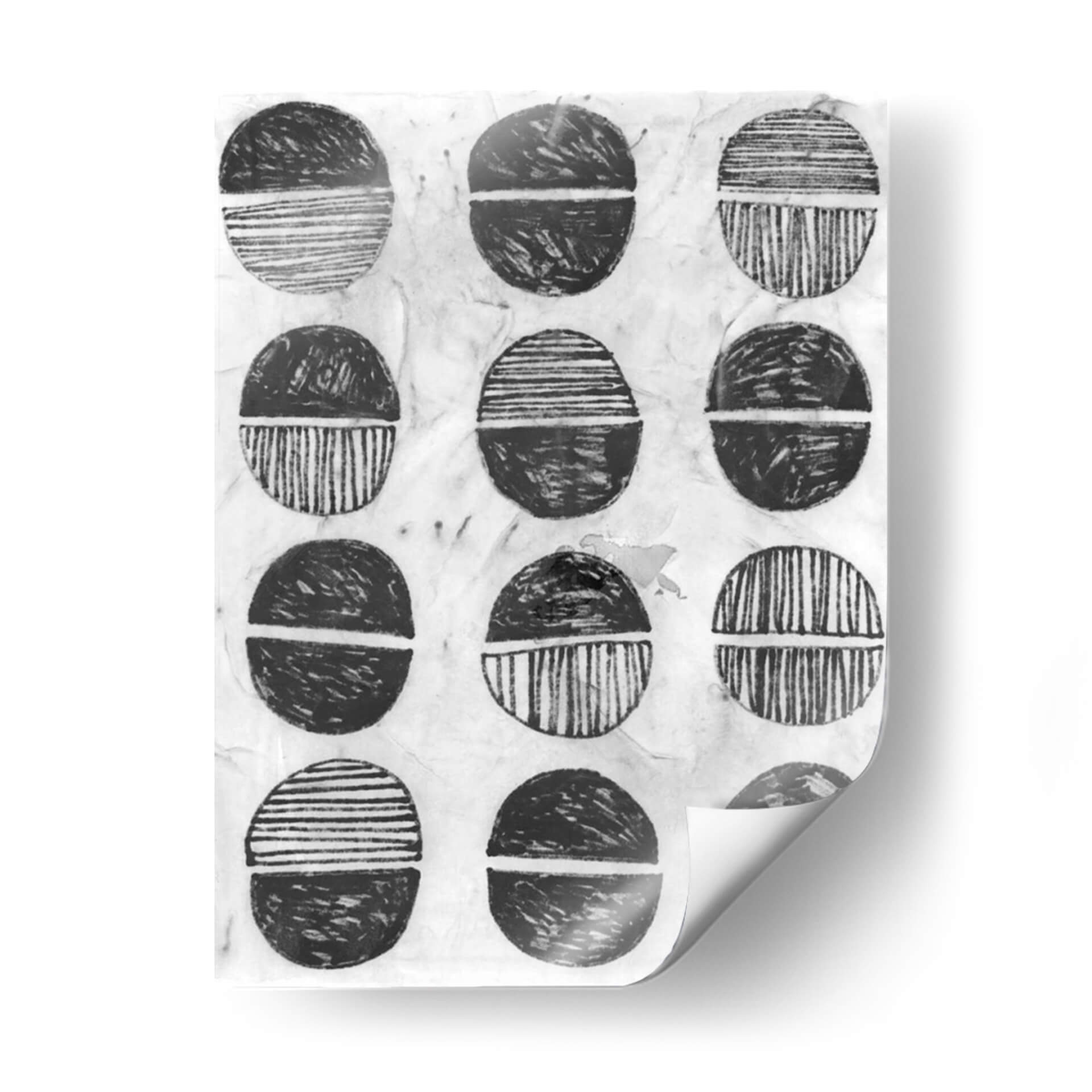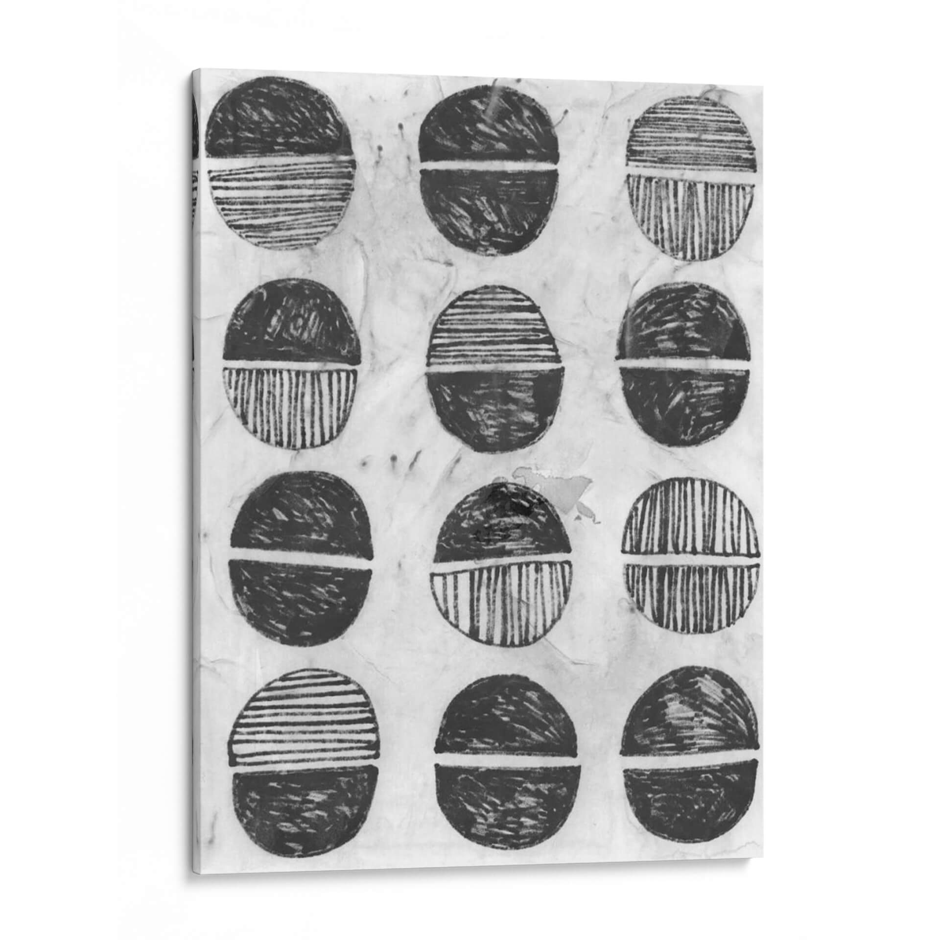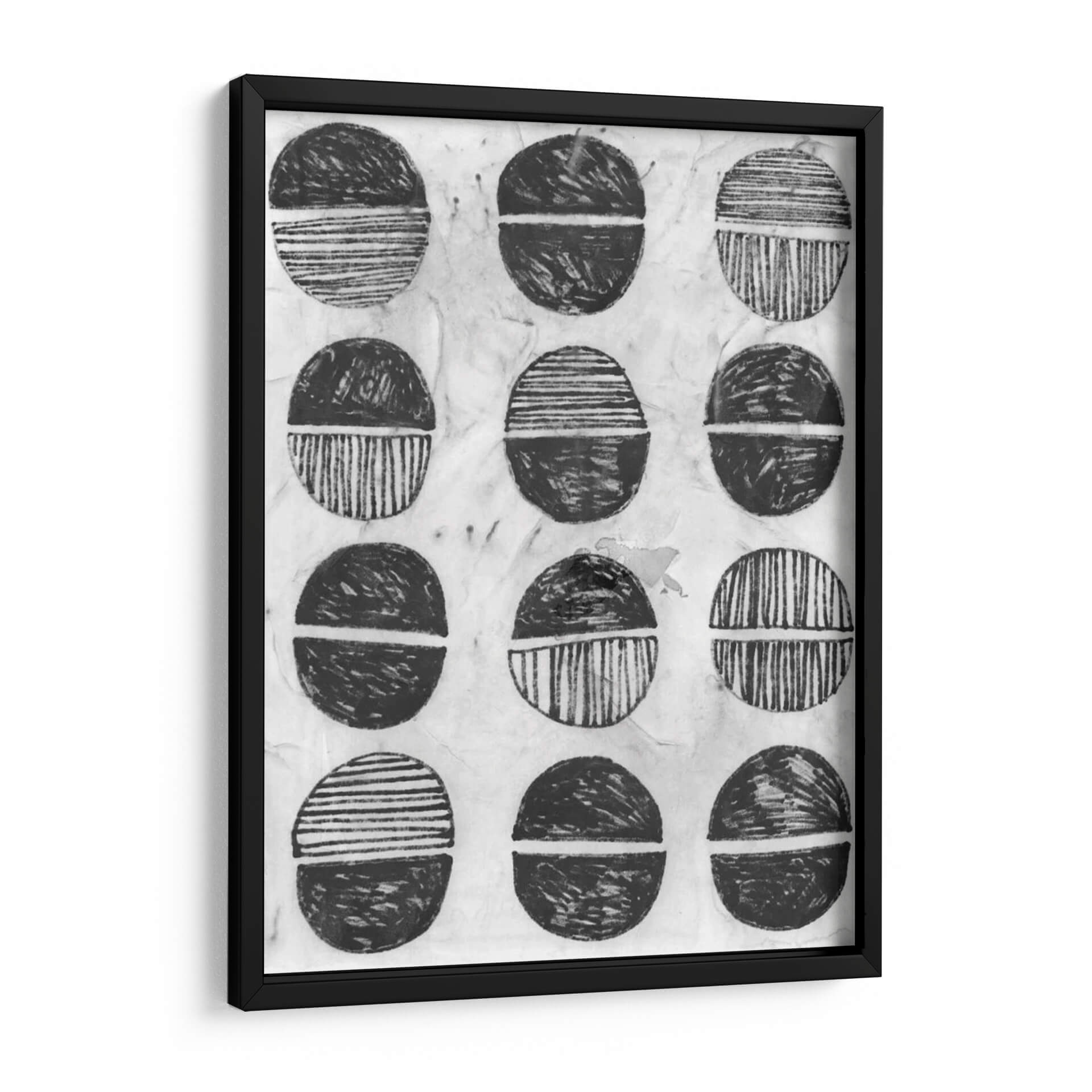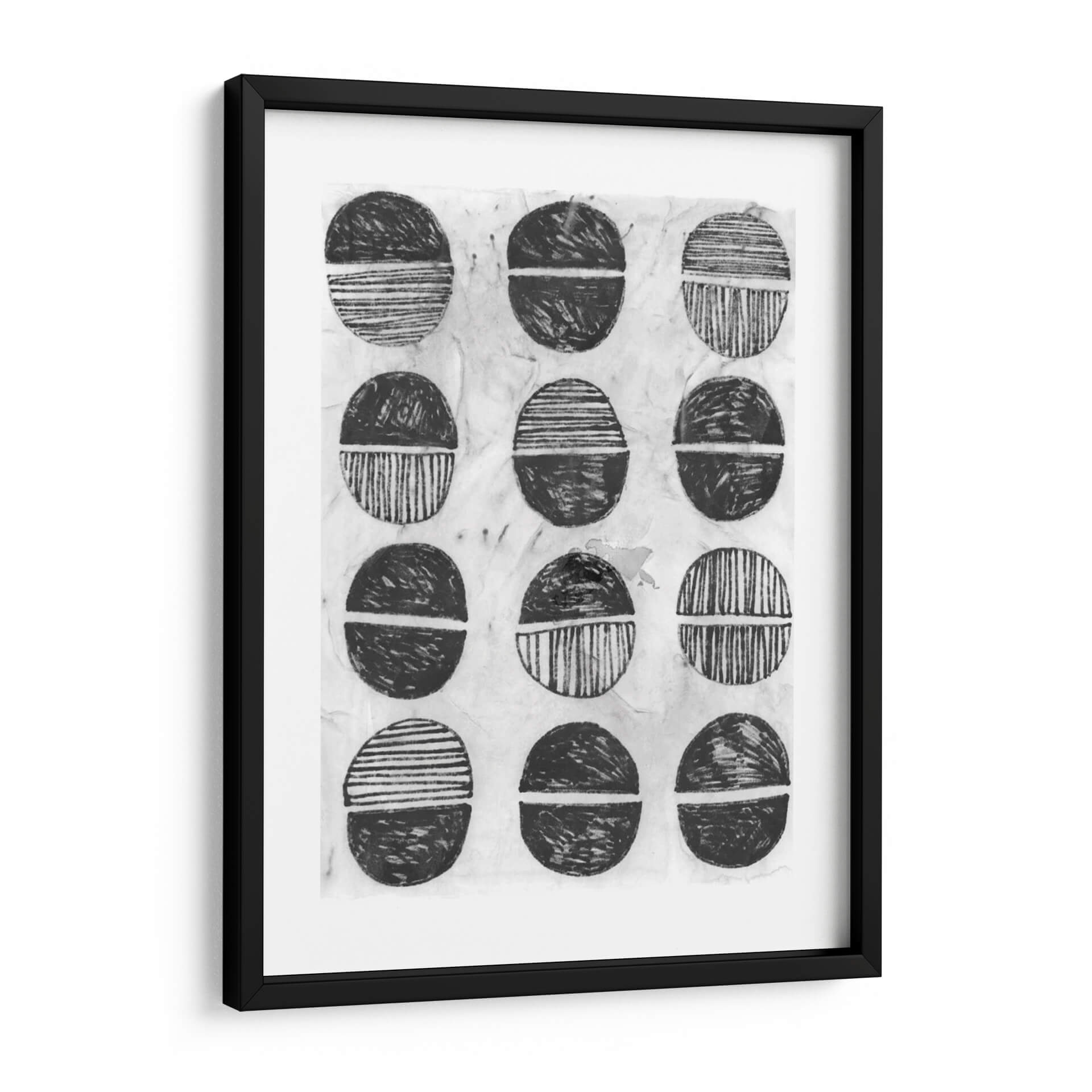 Sumérgete en la serenidad y el estilo contemporáneo con "Símbolo De Impresión I", una obra de arte abstracta de June Erica Vess. Este cuadro decorativo presenta una composición cautivadora de formas circulares divididas, ejecutadas en una paleta monocromática de blancos y negros con matices texturizados. Cada círculo, reminiscentes de sellos o motivos tribales, está dividido por una línea horizontal, con la mitad superior y la inferior representadas con diferentes patrones: algunas con trazos gestuales enérgicos y otras con líneas finas y paralelas. El fondo texturizado, que evoca el papel de arroz o una superficie de impresión artesanal, añade una capa de profundidad y autenticidad a la pieza. "Símbolo De Impresión I" irradia una atmósfera de calma reflexiva y un diseño orgánico que dialoga con la estética moderna y minimalista. Es una elección perfecta para quienes buscan añadir un toque de arte abstracto y con carácter a su hogar u oficina, funcionando como un punto focal sutil pero impactante en cualquier sala de estar, estudio o dormitorio. Esta obra invita a la contemplación y a la interpretación personal, convirtiéndose en un elemento decorativo que no solo embellece, sino que también inspira. Descubre la elegancia atemporal del arte abstracto y transforma tu espacio con esta pieza única de June Erica Vess, ideal para interiores contemporáneos y eclécticos.