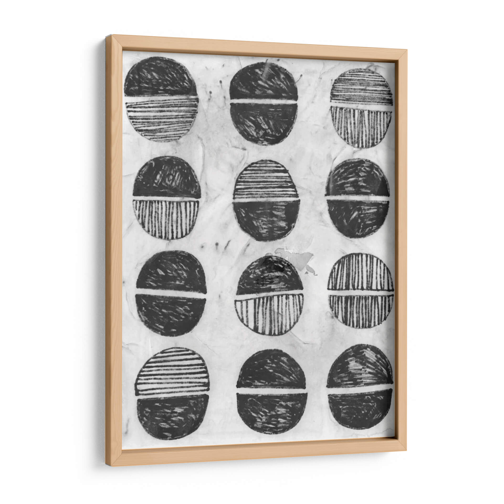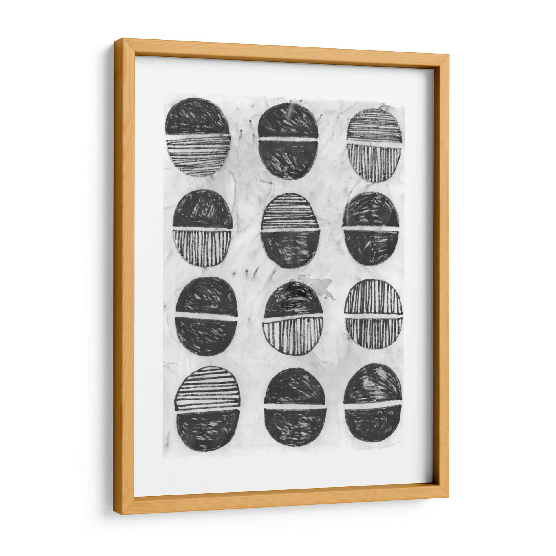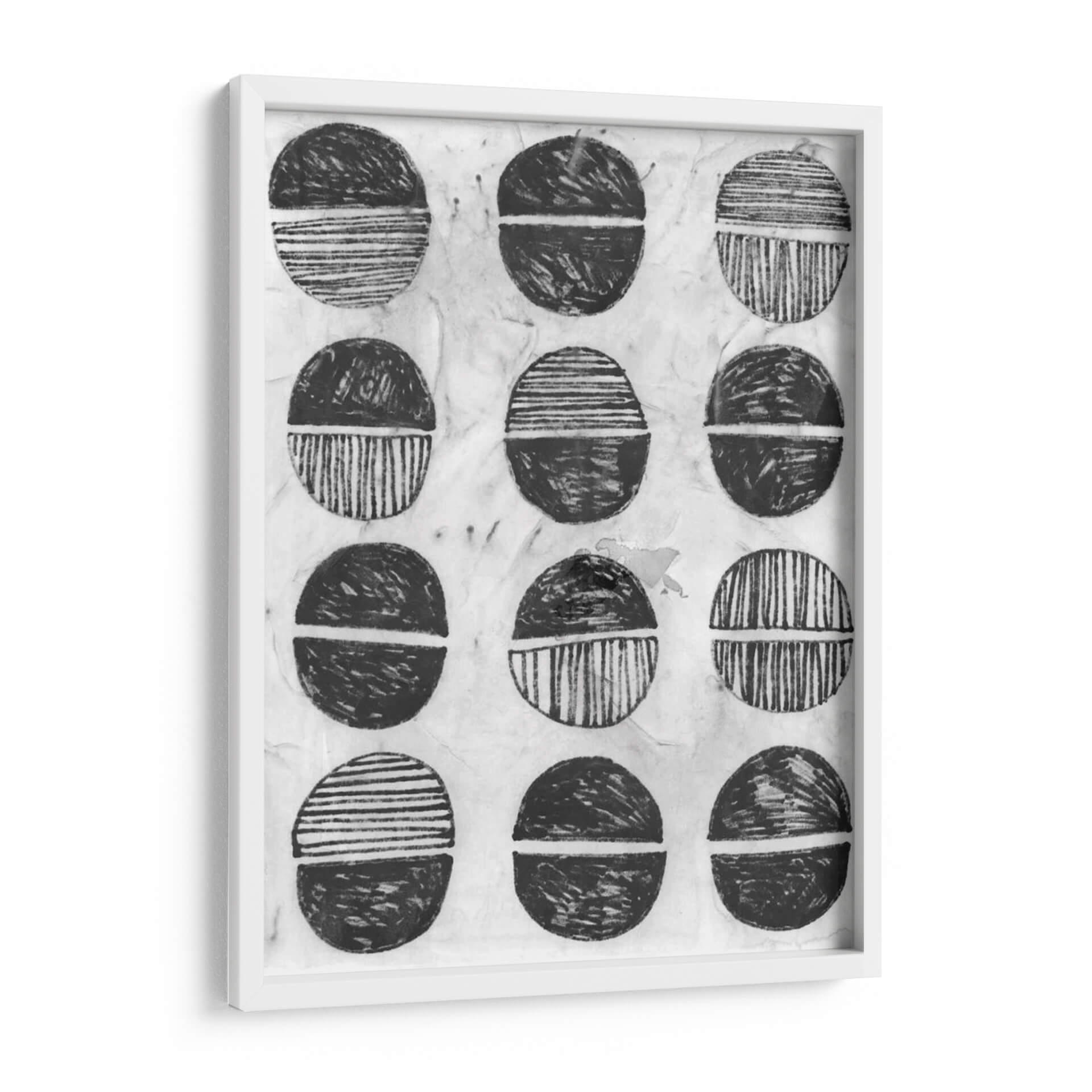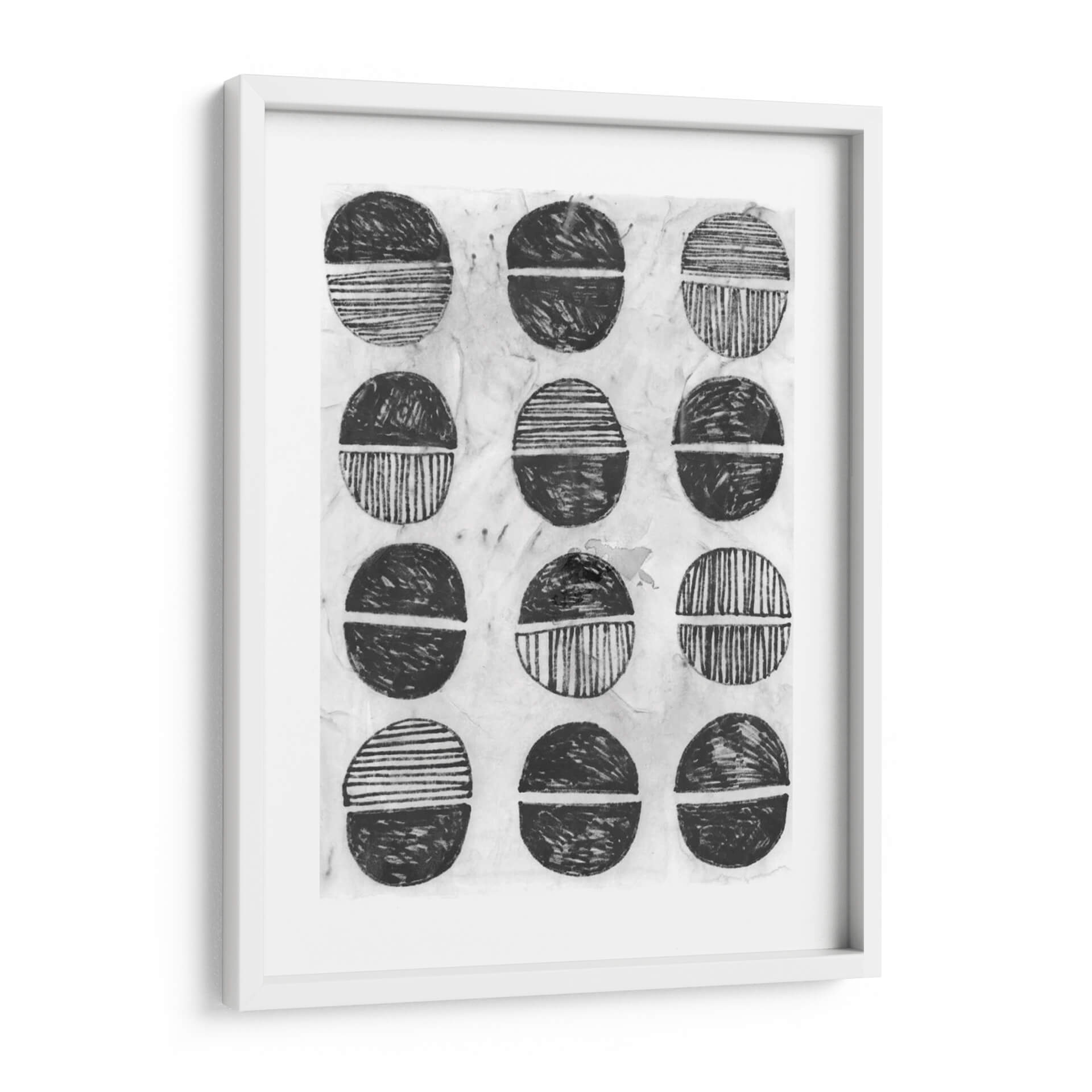 Sumérgete en la serenidad y el estilo contemporáneo con "Símbolo De Impresión I", una obra de arte abstracta de June Erica Vess. Este cuadro decorativo presenta una composición cautivadora de formas circulares divididas, ejecutadas en una paleta monocromática de blancos y negros con matices texturizados. Cada círculo, reminiscentes de sellos o motivos tribales, está dividido por una línea horizontal, con la mitad superior y la inferior representadas con diferentes patrones: algunas con trazos gestuales enérgicos y otras con líneas finas y paralelas. El fondo texturizado, que evoca el papel de arroz o una superficie de impresión artesanal, añade una capa de profundidad y autenticidad a la pieza. "Símbolo De Impresión I" irradia una atmósfera de calma reflexiva y un diseño orgánico que dialoga con la estética moderna y minimalista. Es una elección perfecta para quienes buscan añadir un toque de arte abstracto y con carácter a su hogar u oficina, funcionando como un punto focal sutil pero impactante en cualquier sala de estar, estudio o dormitorio. Esta obra invita a la contemplación y a la interpretación personal, convirtiéndose en un elemento decorativo que no solo embellece, sino que también inspira. Descubre la elegancia atemporal del arte abstracto y transforma tu espacio con esta pieza única de June Erica Vess, ideal para interiores contemporáneos y eclécticos.