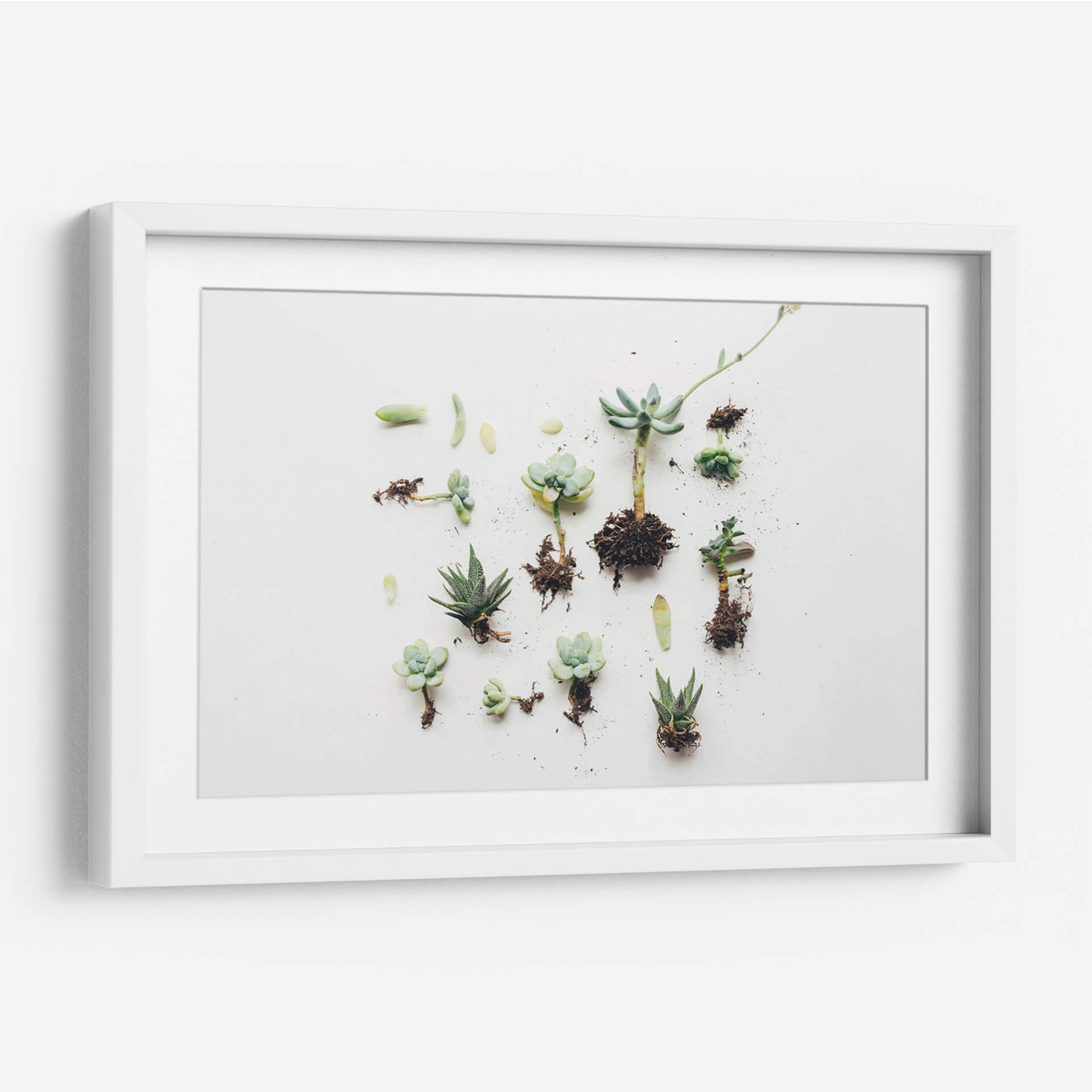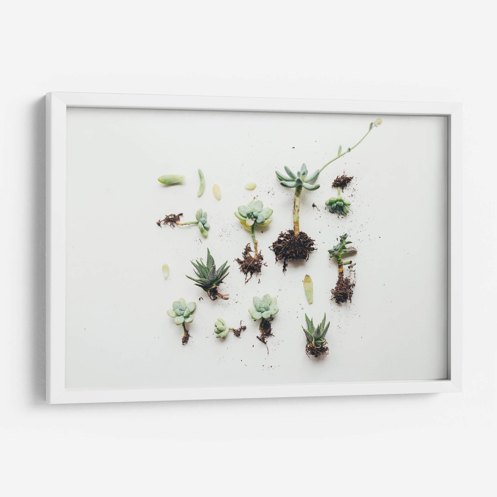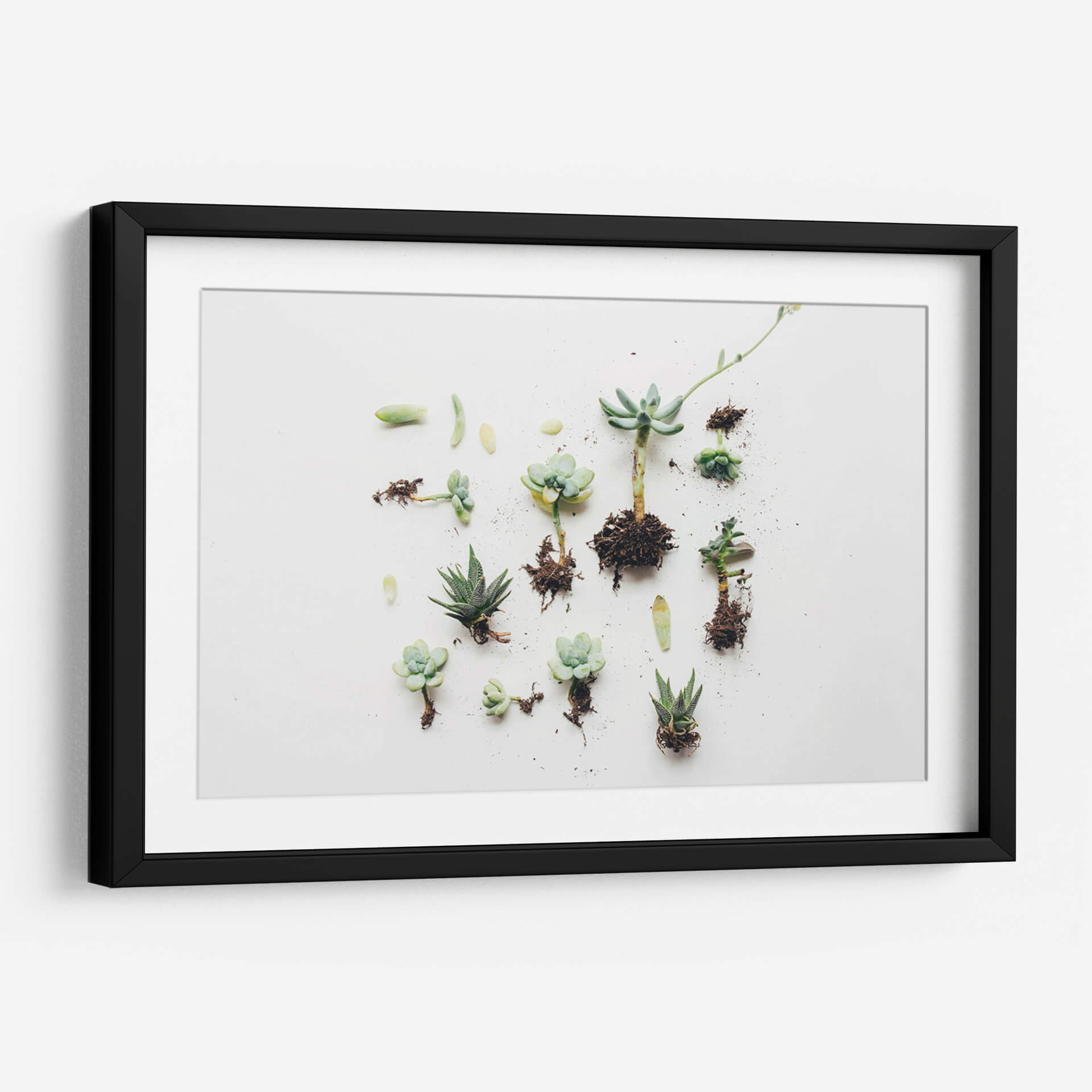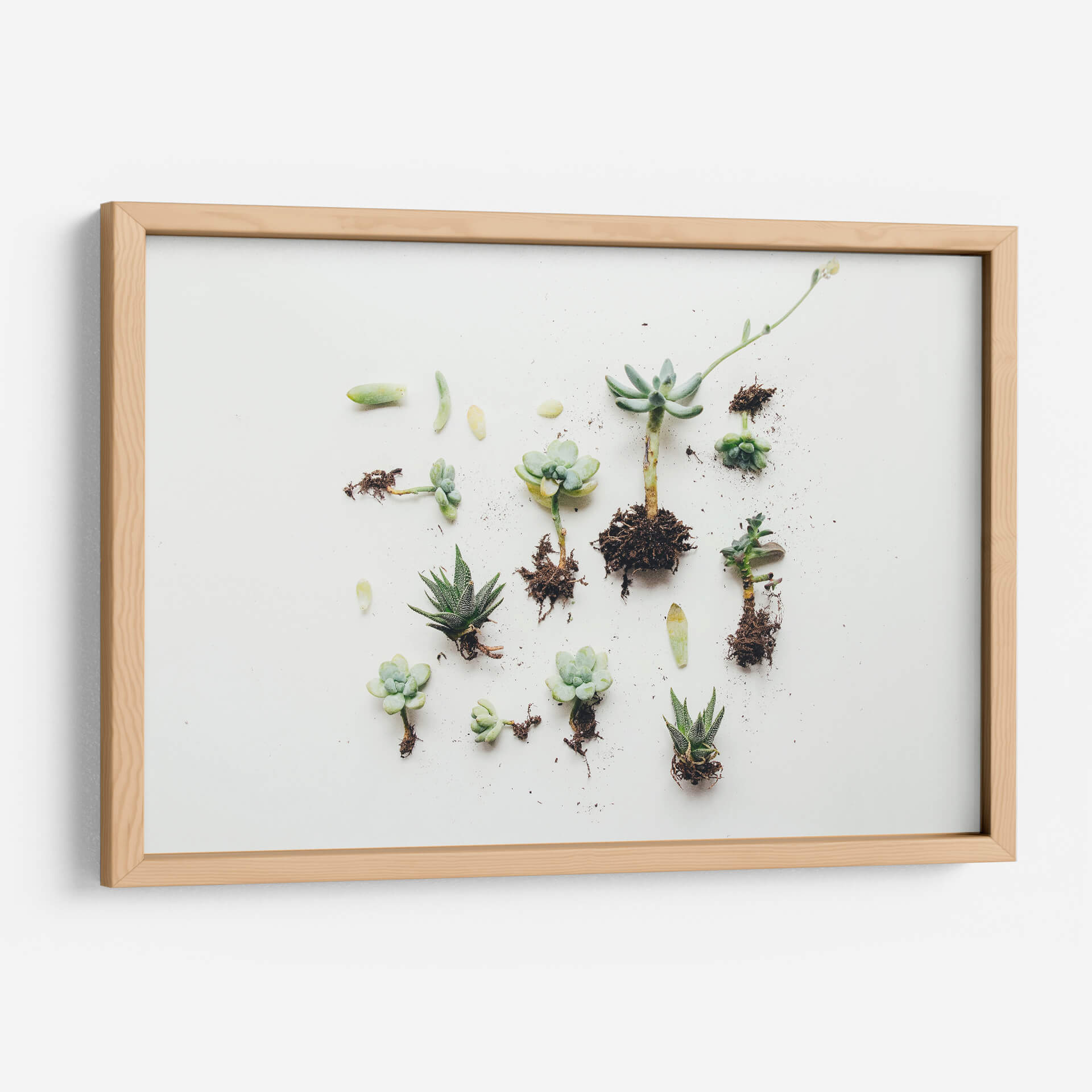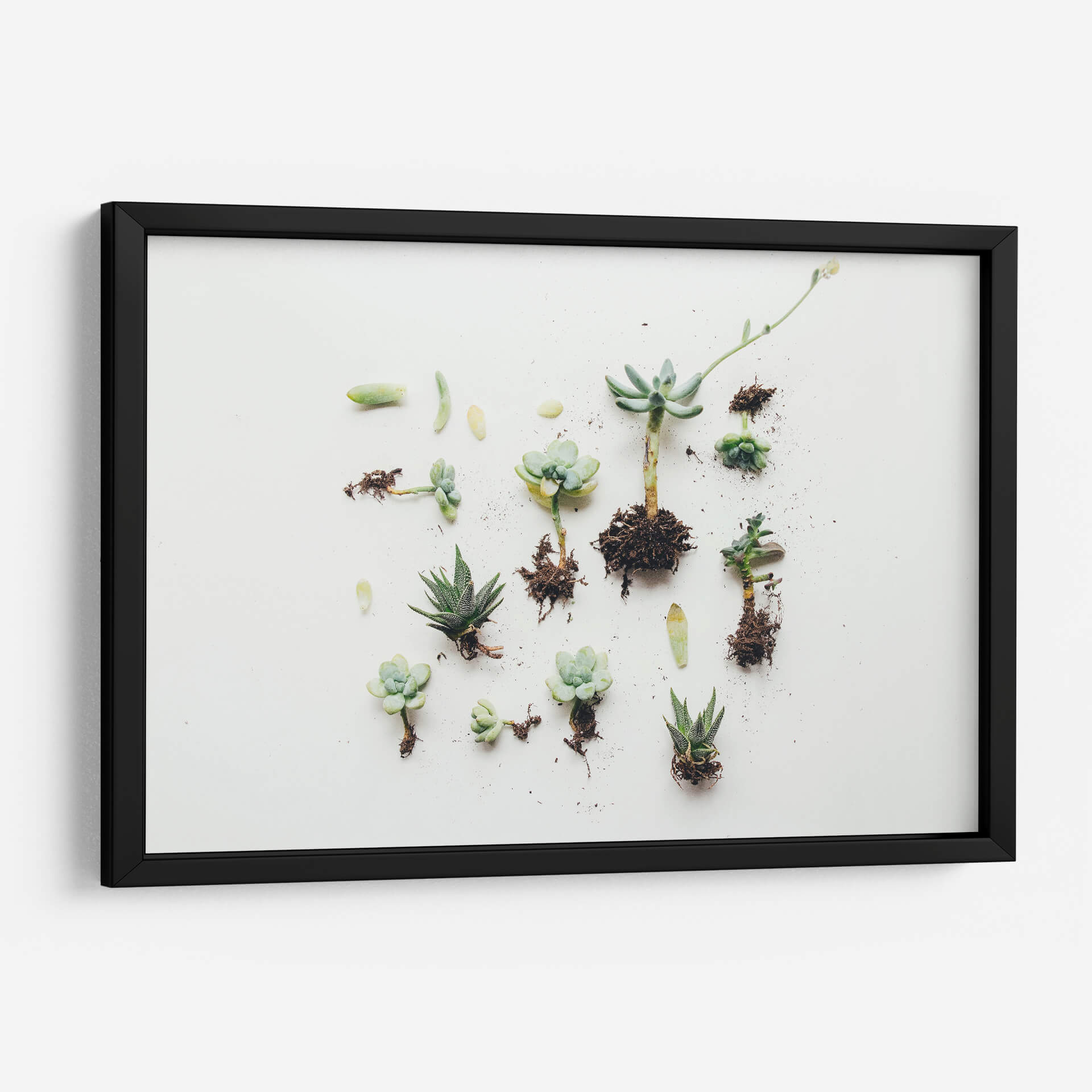 Este cautivador cuadro decorativo, titulado "Suculentas con raíz", captura la esencia delicada y resiliente de estas fascinantes plantas. La obra presenta una composición cuidadosamente orquestada de diversas suculentas, cada una con sus raíces expuestas, dispuestas sobre un fondo neutro y claro que resalta su belleza natural. Los tonos verdes suaves y pálidos, junto con los toques terrosos de la tierra, crean una paleta de colores serena y orgánica, invitando a la calma y la contemplación. El estilo fotográfico, con un enfoque detallado en la textura y la forma de las plantas, confiere a la pieza una cualidad casi botánica, a la vez que artística. La composición, que juega con la disposición dispersa pero armoniosa de las suculentas, evoca una sensación de crecimiento, renovación y la intrincada belleza del mundo natural. Este cuadro decorativo es ideal para añadir un toque de frescura y serenidad a cualquier espacio, ya sea una sala de estar moderna, un dormitorio tranquilo o una oficina que busca un elemento inspirador y orgánico. Su simplicidad elegante y su conexión con la naturaleza lo convierten en una pieza versátil que complementará una amplia gama de estilos decorativos, aportando vida y un aire de sofisticación botánica a tu hogar.