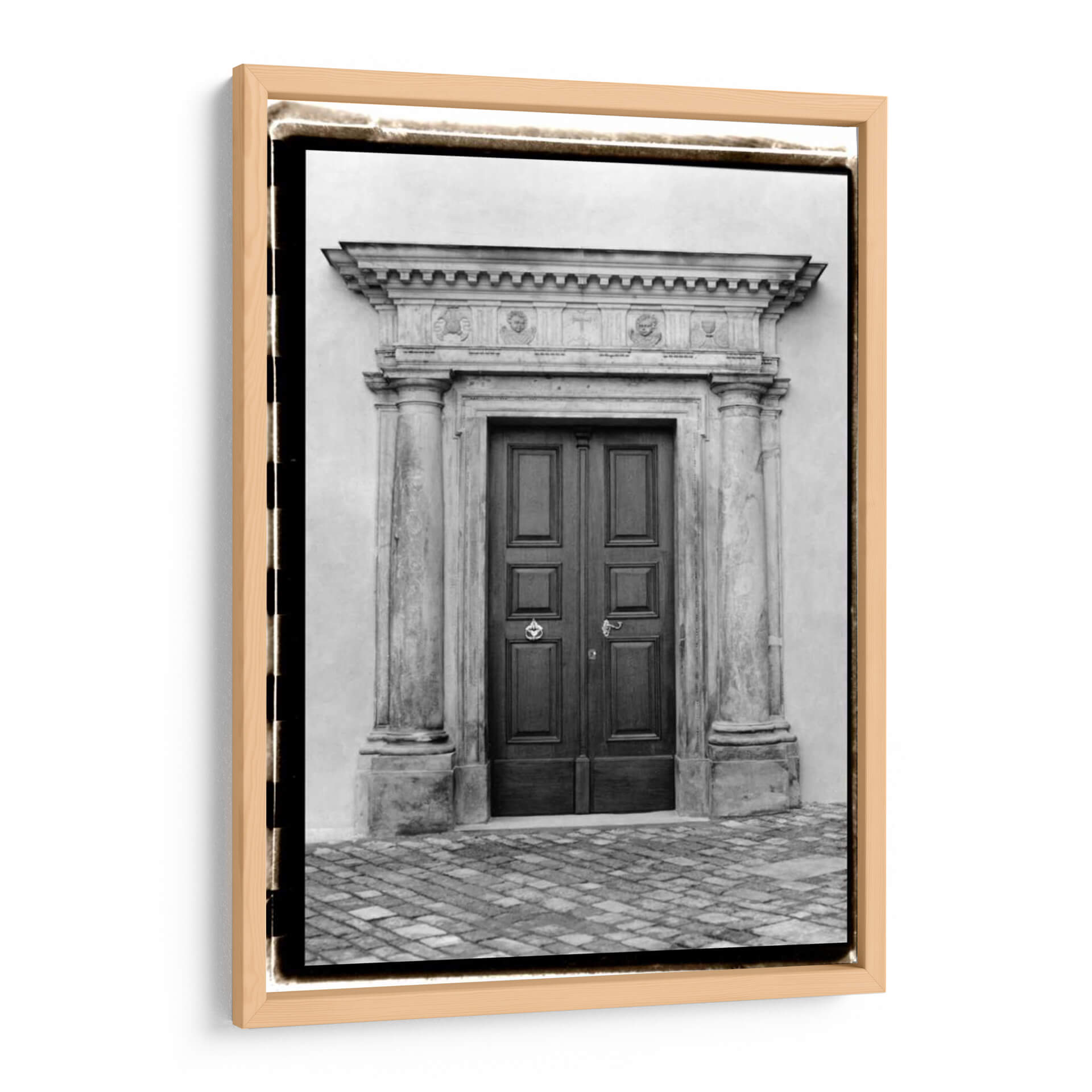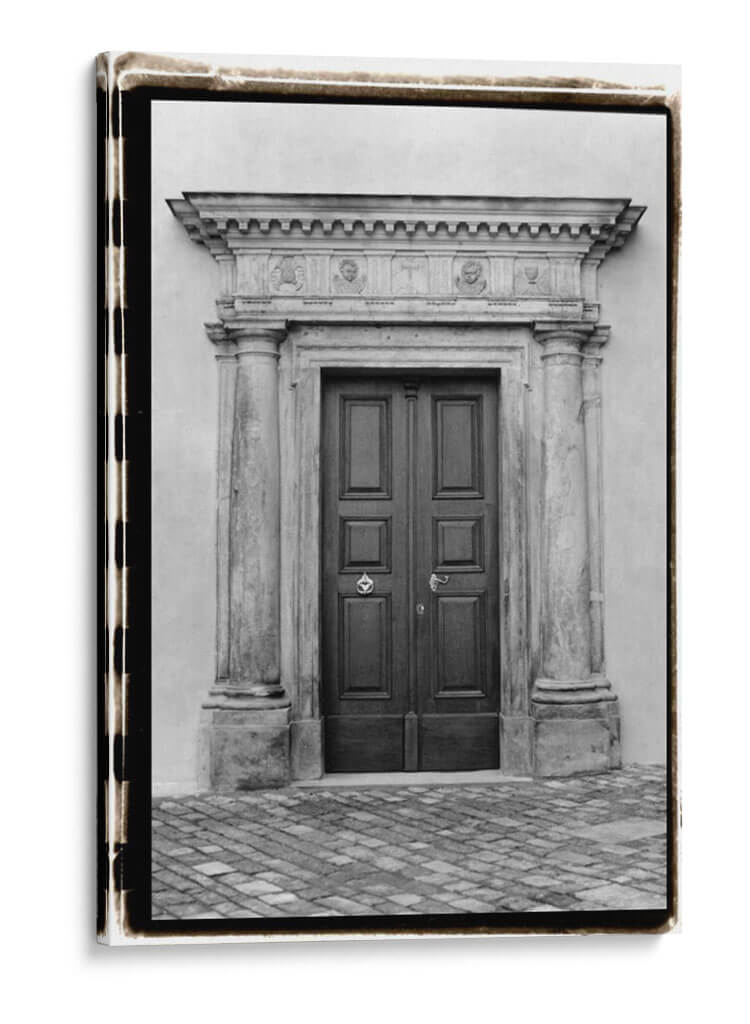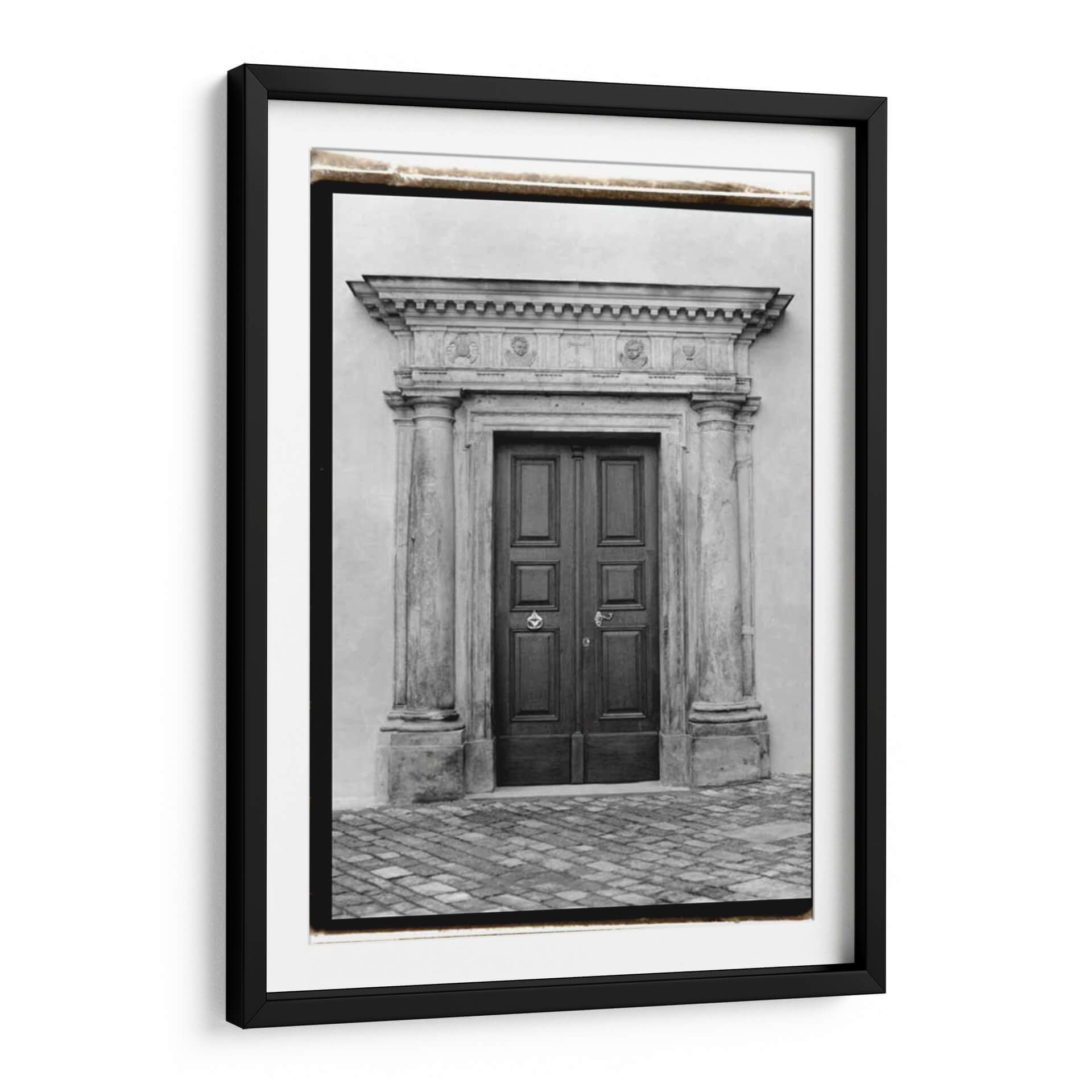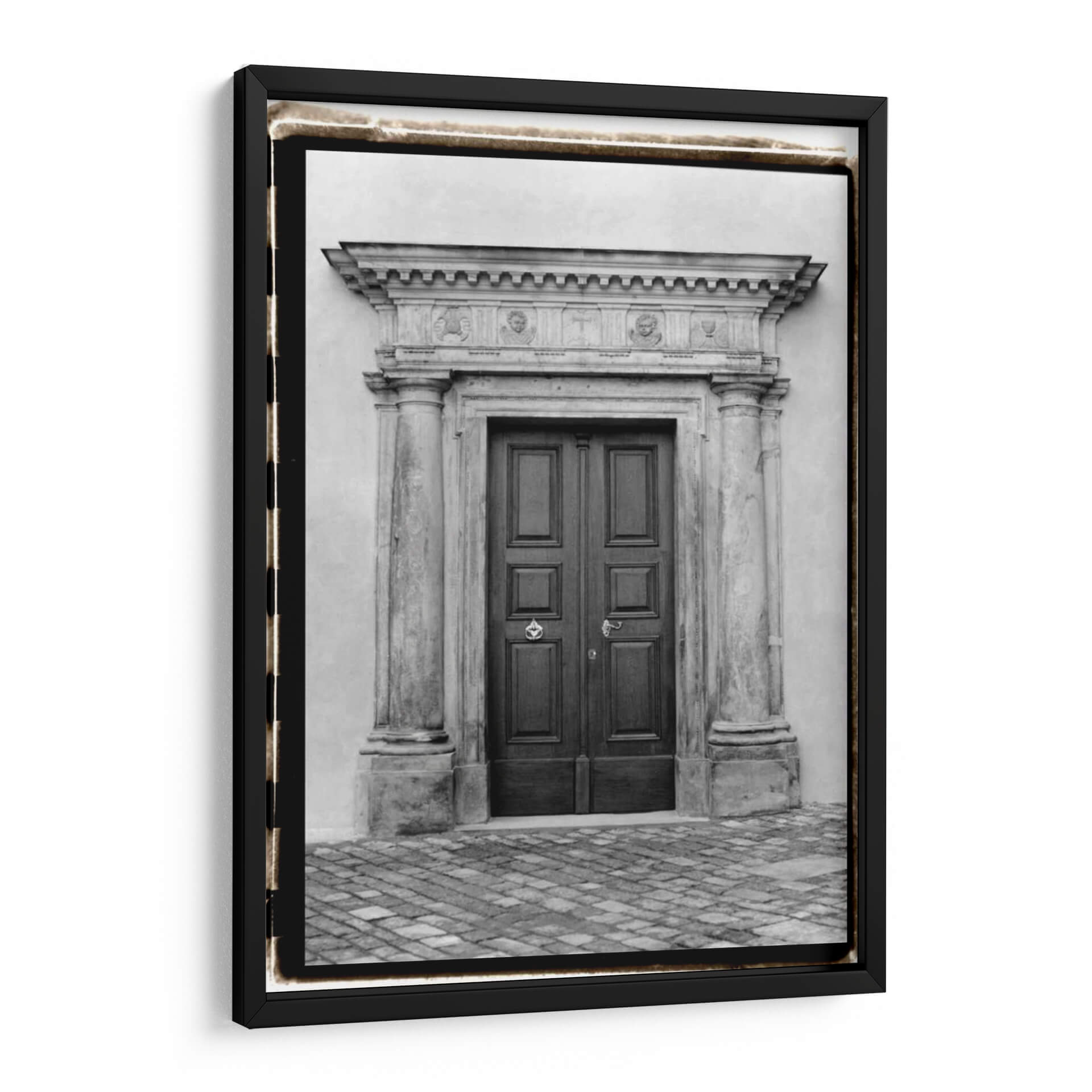 Adéntrese en la elegancia atemporal con "Cualidades Perdurables III", una obra maestra fotográfica en blanco y negro de Laura DeNardo. Esta pieza captura la imponente belleza de una entrada arquitectónica clásica, dominada por una puerta de madera oscura y un elaborado frontispicio de piedra, flanqueada por columnas robustas. La composición simétrica y el juego de luces y sombras evocan una sensación de misterio y sofisticación, invitando a la contemplación sobre el paso del tiempo y la permanencia de la belleza. La textura detallada de la piedra y la pátina del empedrado añaden una riqueza visual que transporta al espectador a otra época. Este cuadro decorativo es perfecto para añadir un toque de carácter y profundidad a cualquier espacio, desde un estudio clásico hasta un salón moderno que busque un contraste de texturas y un aire de historia. Su estética monocromática la convierte en una adición versátil y distinguida para cualquier decoración, ofreciendo una ventana a la arquitectura y al arte perdurable.
