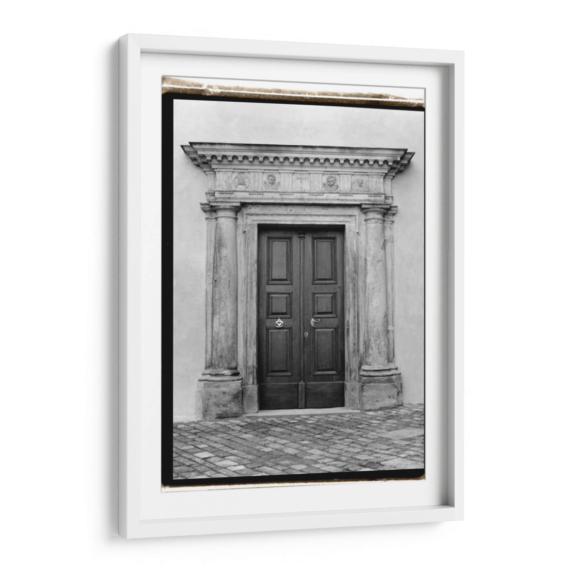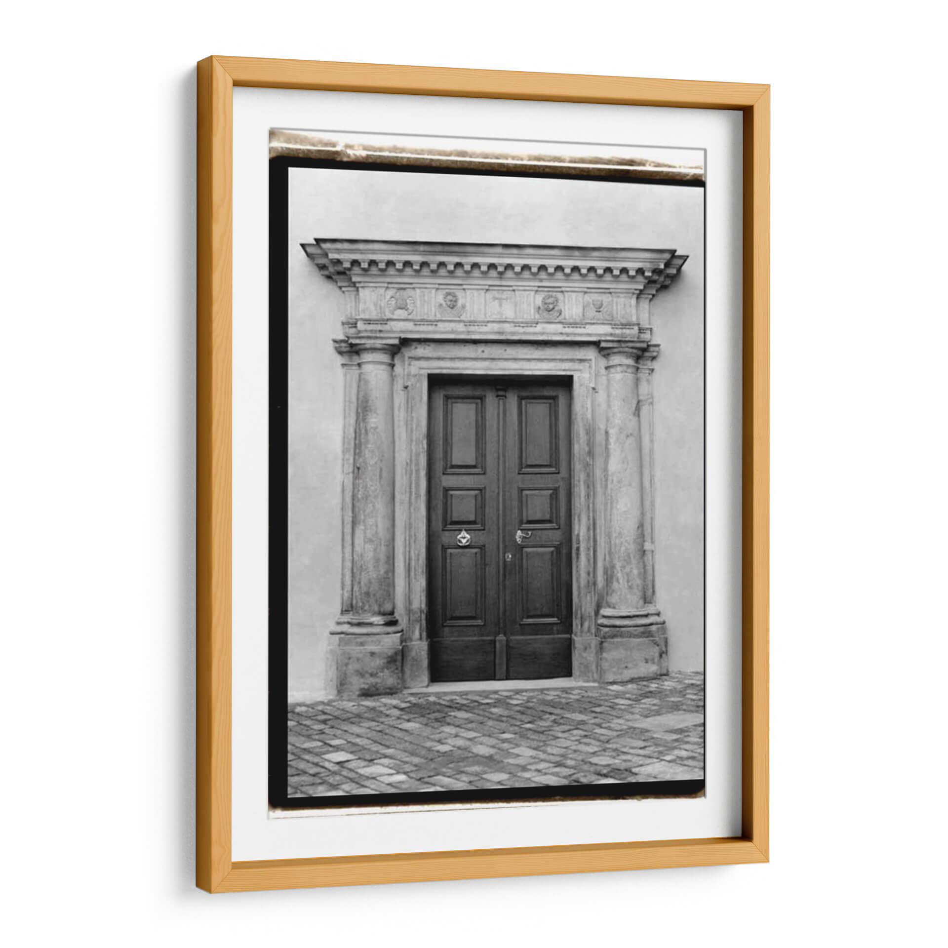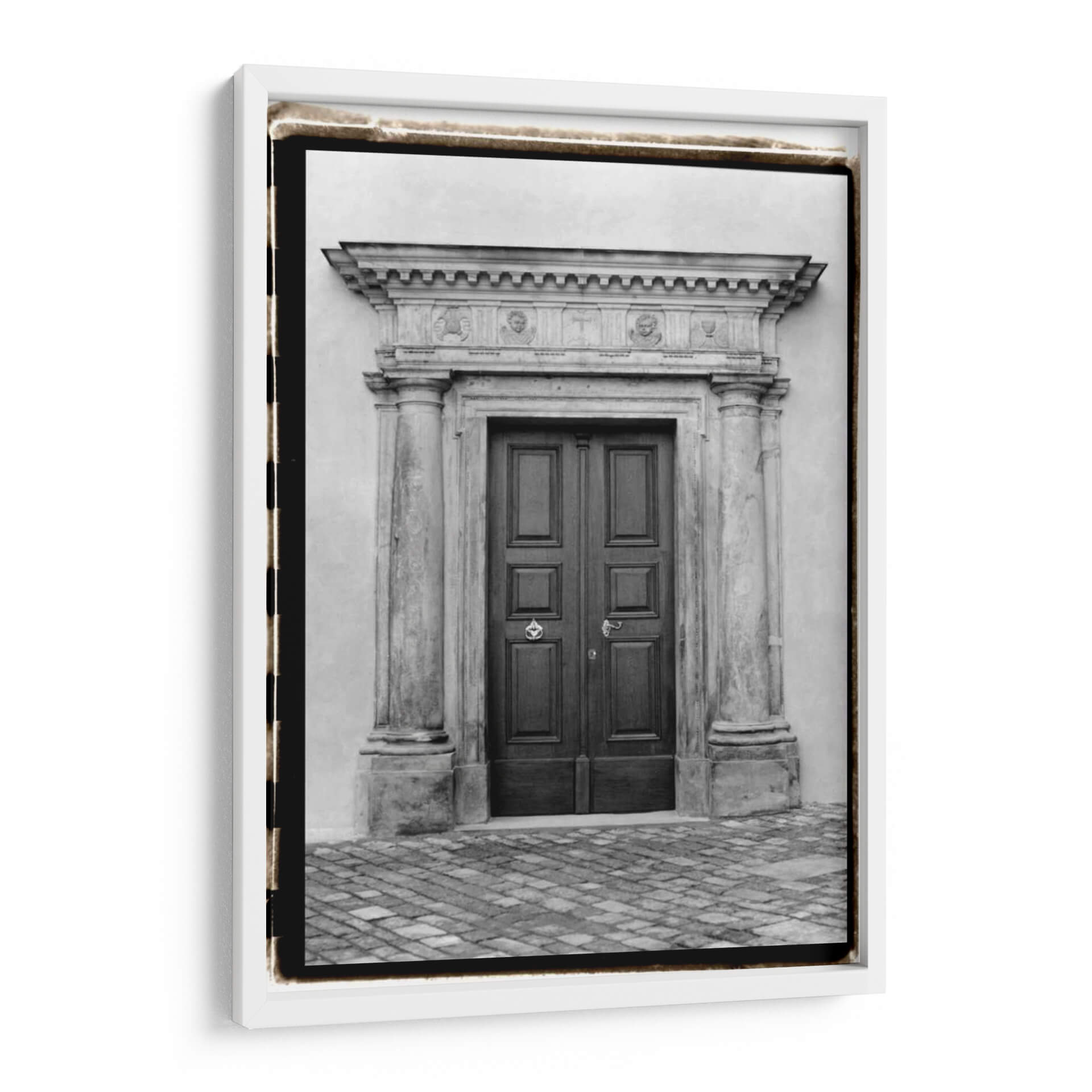 Adéntrese en la elegancia atemporal con "Cualidades Perdurables III", una obra maestra fotográfica en blanco y negro de Laura DeNardo. Esta pieza captura la imponente belleza de una entrada arquitectónica clásica, dominada por una puerta de madera oscura y un elaborado frontispicio de piedra, flanqueada por columnas robustas. La composición simétrica y el juego de luces y sombras evocan una sensación de misterio y sofisticación, invitando a la contemplación sobre el paso del tiempo y la permanencia de la belleza. La textura detallada de la piedra y la pátina del empedrado añaden una riqueza visual que transporta al espectador a otra época. Este cuadro decorativo es perfecto para añadir un toque de carácter y profundidad a cualquier espacio, desde un estudio clásico hasta un salón moderno que busque un contraste de texturas y un aire de historia. Su estética monocromática la convierte en una adición versátil y distinguida para cualquier decoración, ofreciendo una ventana a la arquitectura y al arte perdurable.