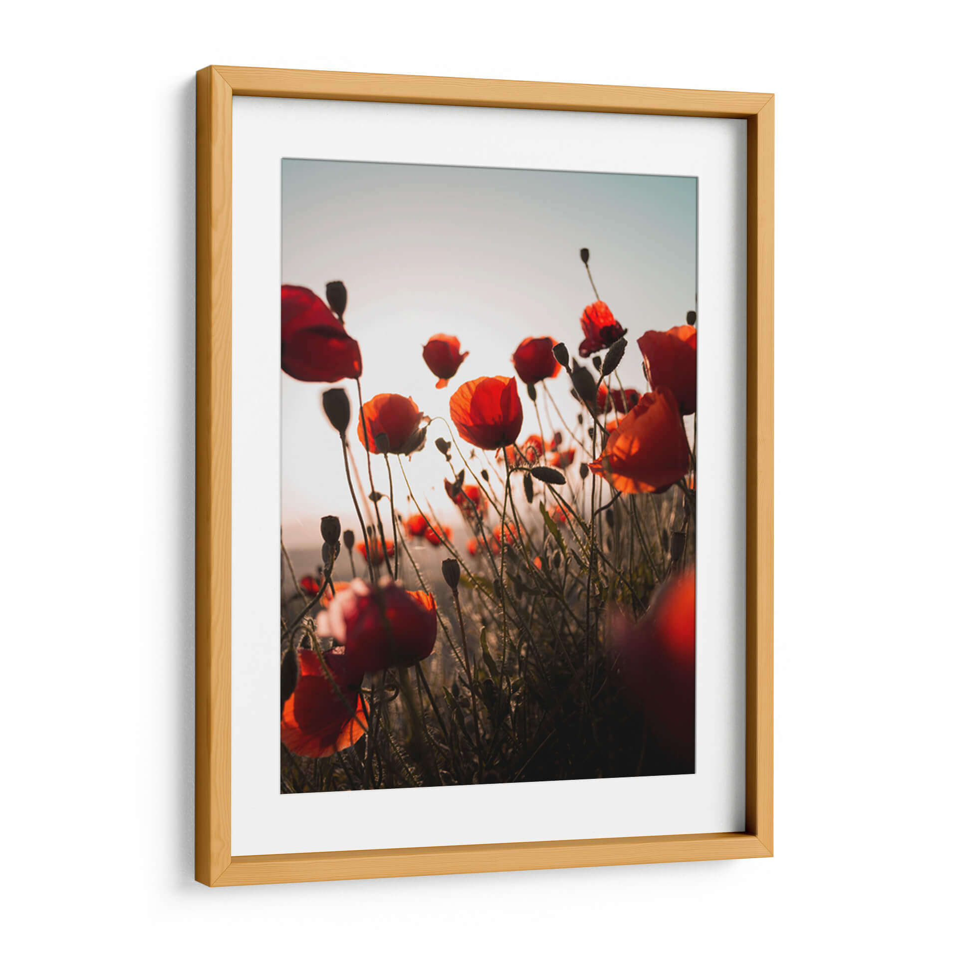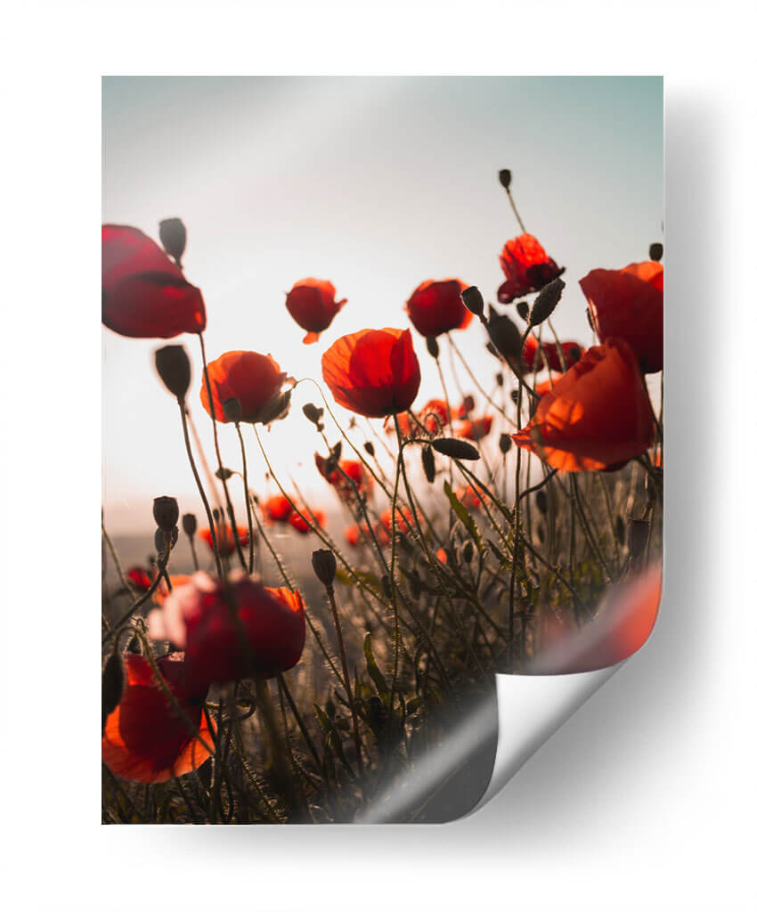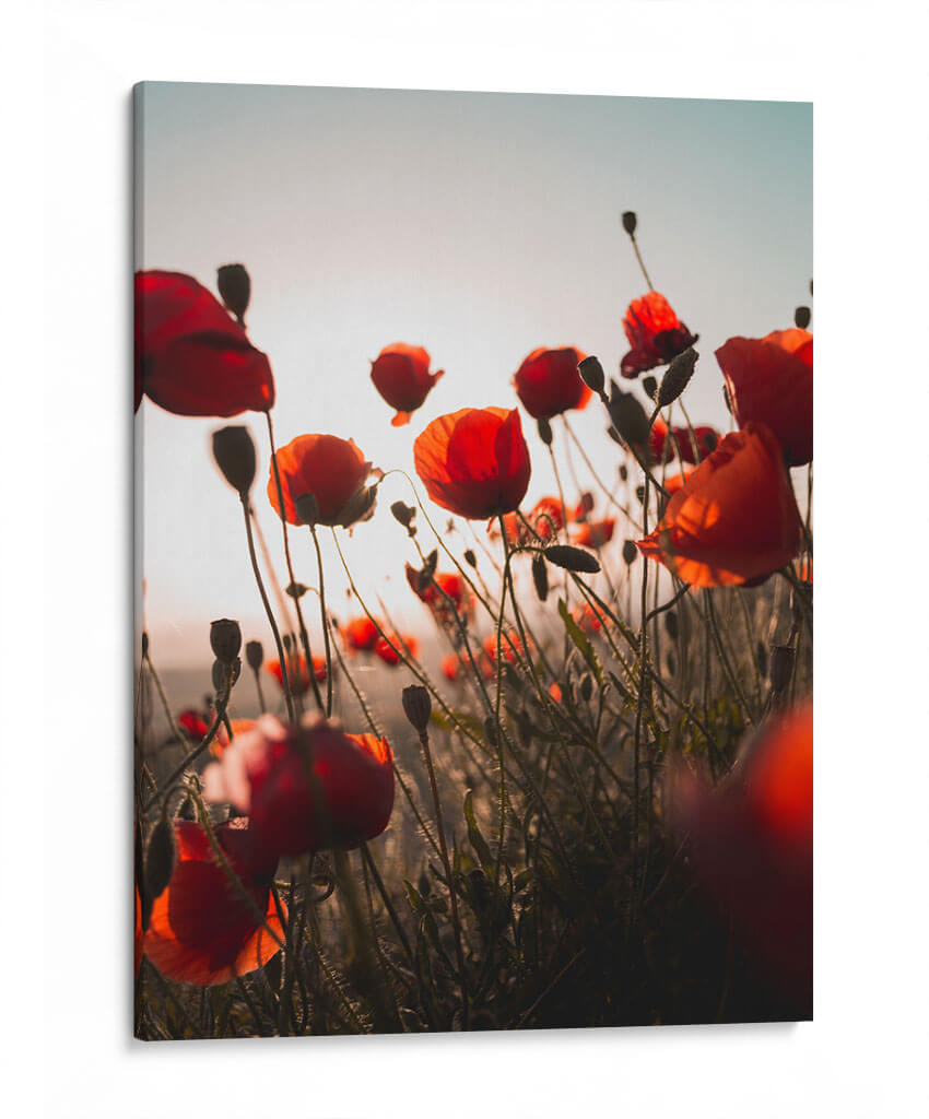 Captura la esencia vibrante de la naturaleza con este cautivador lienzo de amapolas. La obra presenta un campo de amapolas rojas intensas, bañadas por la luz dorada del atardecer. Las delicadas flores, con sus pétalos translúcidos y tallos finos, se alzan contra un cielo suavemente degradado, creando una atmósfera etérea y serena. La composición, con un enfoque en primer plano de algunas amapolas y un desenfoque suave del fondo, invita a perderse en la belleza del momento. Los tonos cálidos, desde los rojos profundos hasta los naranjas y amarillos sutiles, evocan una sensación de calidez y vitalidad. Este lienzo es ideal para añadir un toque de color y vida a cualquier espacio, ya sea una sala de estar moderna, un dormitorio acogedor o una oficina que busque inspiración. Su estilo fotográfico y la temática floral lo convierten en una pieza decorativa versátil que evoca la paz del campo y la energía de la primavera, perfecto para quienes buscan arte que transmita optimismo y conexión con la naturaleza.