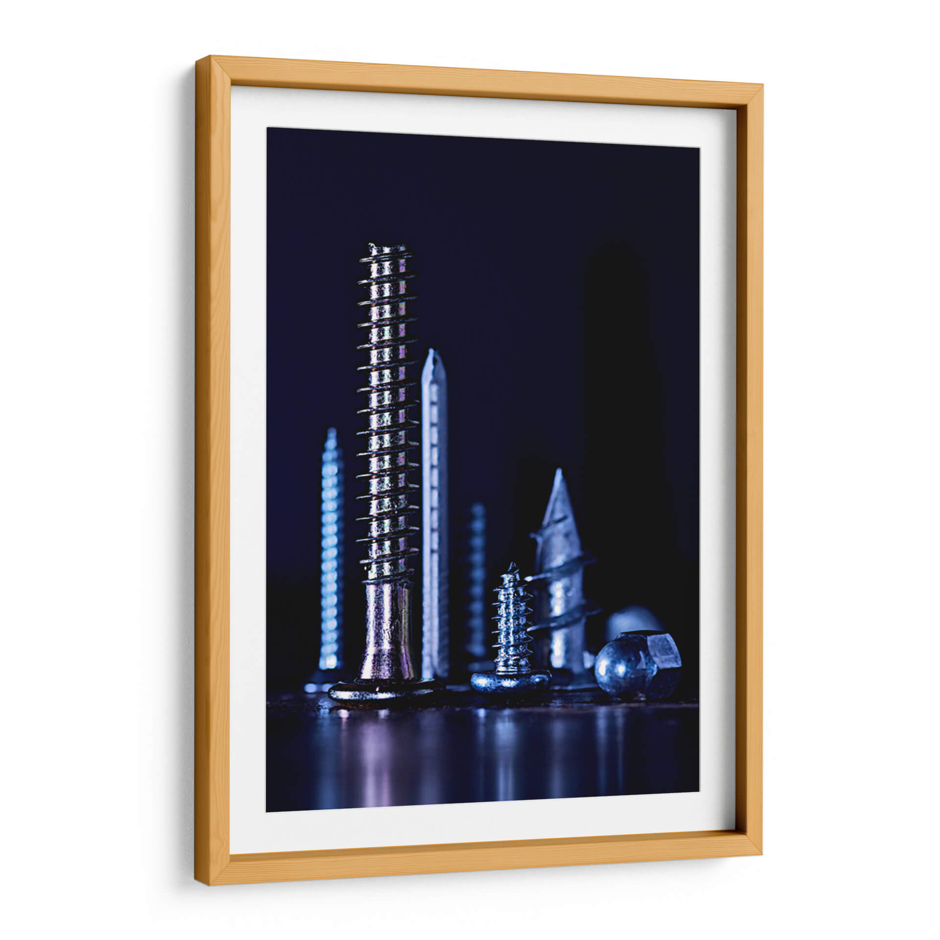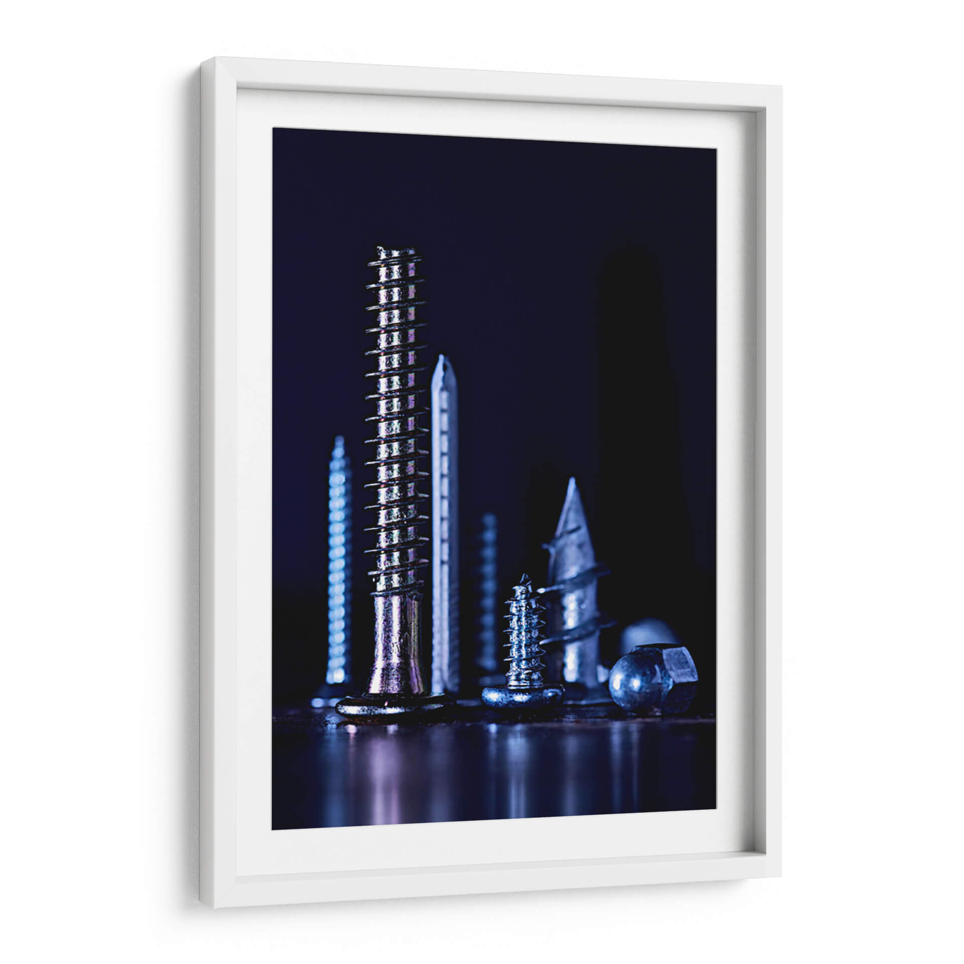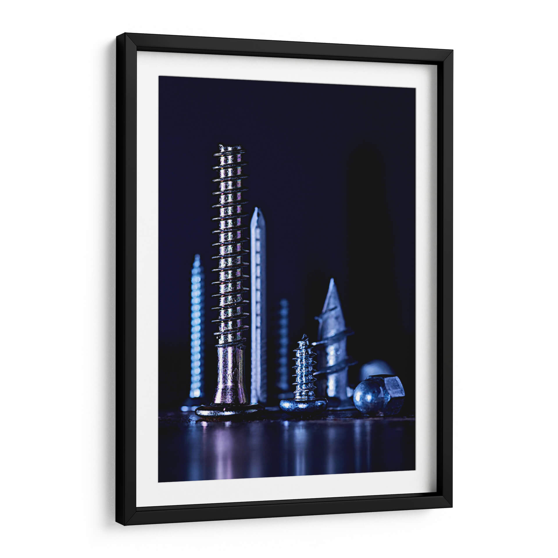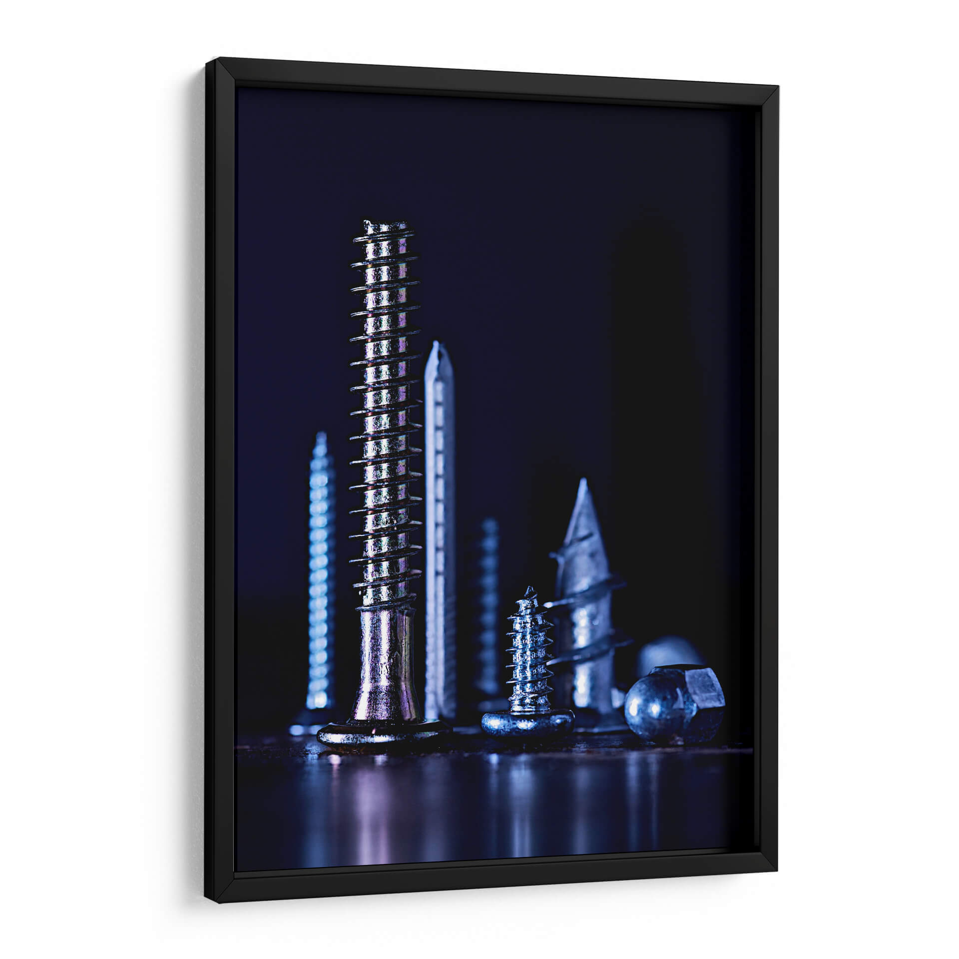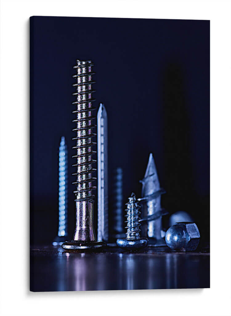 Sumérgete en la fascinante composición de "Ciudad de Tornillos", una obra de arte que transforma elementos industriales en una cautivadora escena urbana. A través de un detallado primer plano, se despliega un conjunto de tornillos y elementos de fijación, dispuestos de manera que evocan un paisaje arquitectónico con rascacielos metálicos y estructuras intrincadas. La paleta de colores, dominada por profundos tonos de azul y plateados metálicos, crea una atmósfera de misterio y modernidad, mientras que la iluminación selectiva resalta las texturas y los detalles de cada pieza, otorgándole una calidad casi escultórica. Este cuadro decorativo es una celebración de la belleza oculta en lo cotidiano y lo industrial. Su estilo fotográfico y su composición única lo convierten en una pieza de conversación ideal para espacios contemporáneos, oficinas de diseño o estudios creativos. "Ciudad de Tornillos" no es solo una imagen, es una perspectiva innovadora sobre la forma y la función, invitando a la reflexión sobre la ingeniería y la estética que nos rodean. Añade un toque de audacia y originalidad a tu decoración con esta pieza que fusiona lo robusto con lo artístico, generando un impacto visual inolvidable y un ambiente sofisticado.