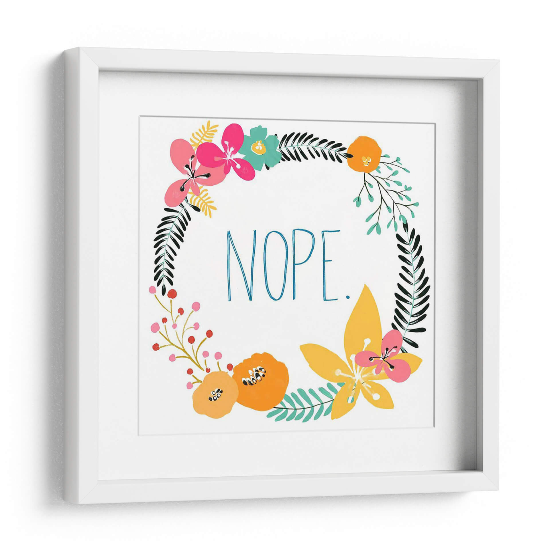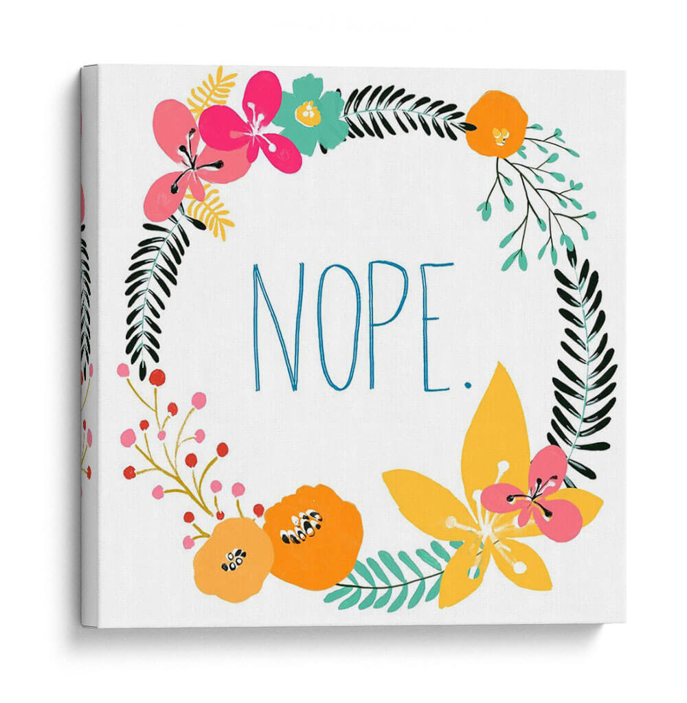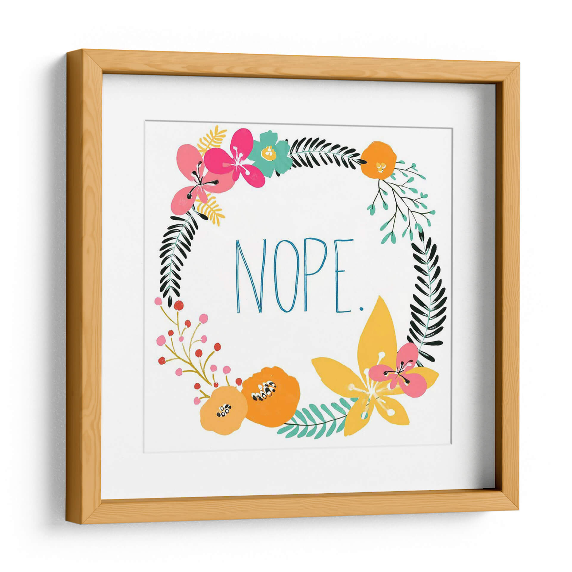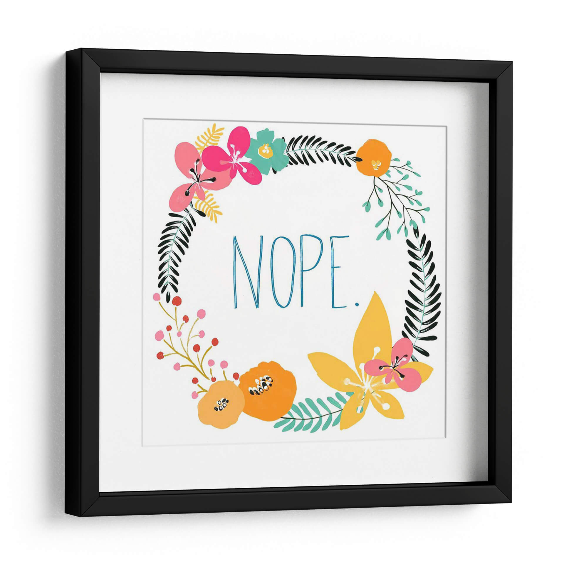 Transforma tu espacio con el encantador cuadro decorativo "Florals Snarky I" de June Erica Vess. Esta obra vibrante presenta una corona circular de flores y follaje en tonos alegres como rosa, naranja, amarillo y verde azulado, que contrasta con el fondo blanco y el audaz mensaje "NOPE." en letras azules. El estilo, que combina elementos botánicos con un toque de humor gráfico, crea una pieza única y moderna que irradia personalidad. La composición circular del arte floral atrae la mirada hacia el centro, generando un equilibrio visual dinámico. Perfecto para aquellos que aprecian el arte con un giro inesperado, "Florals Snarky I" es ideal para añadir un toque de frescura y carácter a tu sala de estar, oficina o cualquier rincón que necesite una dosis de encanto audaz. Su paleta de colores vivos y su mensaje sutil pero directo lo convierten en un punto focal memorable y una excelente opción para quienes buscan una decoración de pared que sea tanto estéticamente agradable como expresiva.