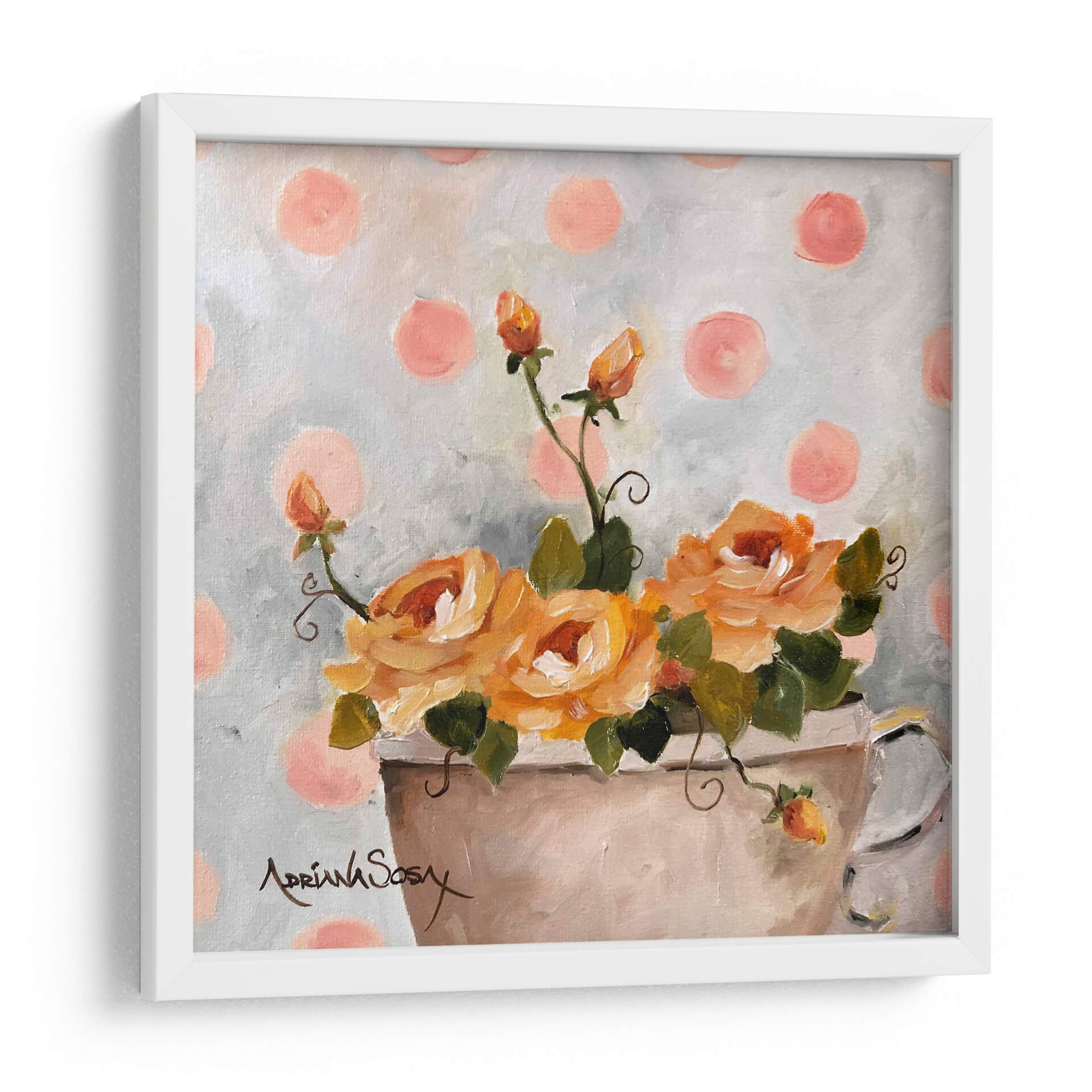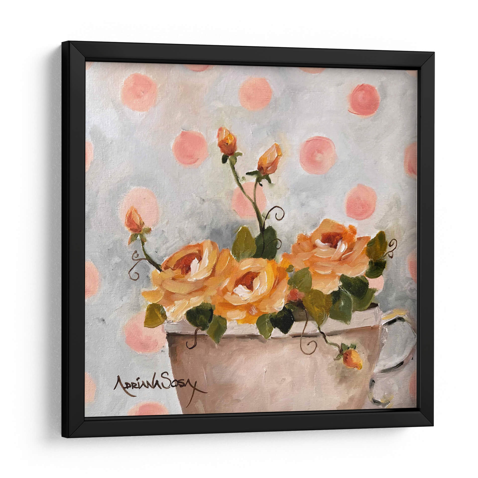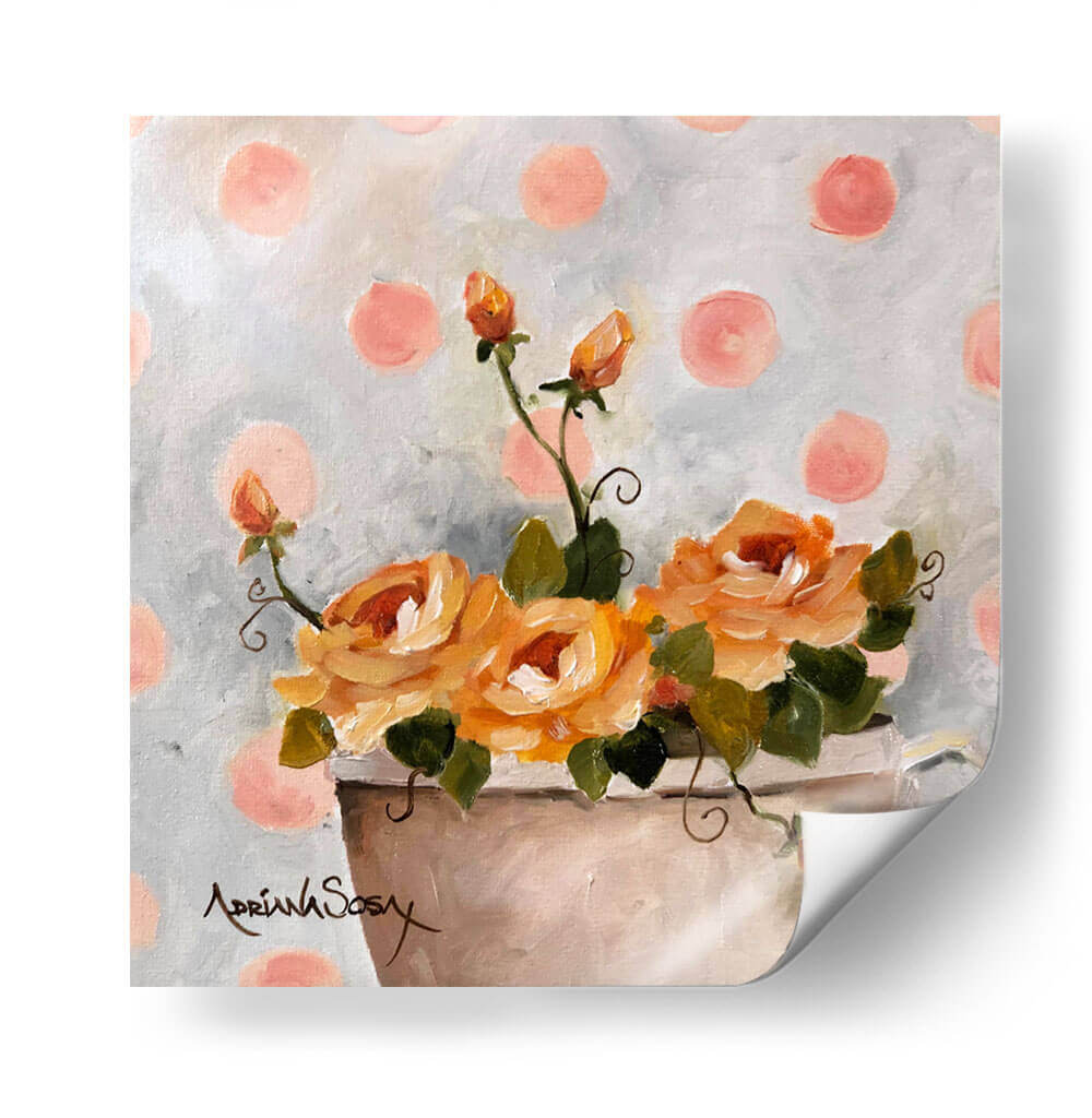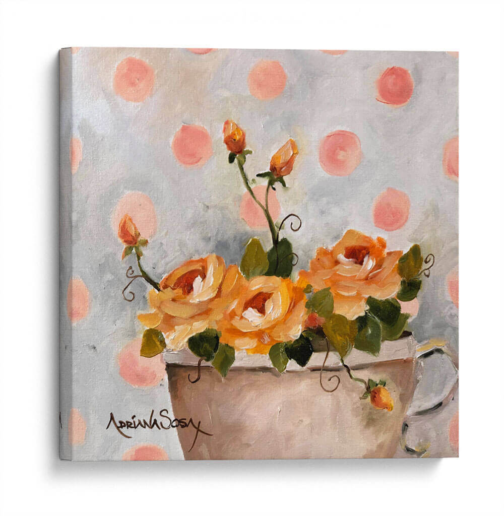 Sumérgete en la delicadeza y el encanto de "El tapiz de lunares", una obra de arte floral que irradia calidez y serenidad. Este cuadro decorativo captura la esencia de unas rosas de un vibrante tono anaranjado, dispuestas en un jarrón sencillo, con brotes que prometen florecer. El fondo, salpicado de lunares en un suave tono rosado sobre un lienzo grisáceo texturizado, crea un ambiente juguetón y a la vez sofisticado, evocando una sensación de nostalgia dulce. La pincelada suelta y expresiva de Adriana Sosa confiere a la pieza una textura rica y una vitalidad palpable, invitando a contemplar la belleza efímera de la naturaleza. Ideal para añadir un toque de color y optimismo a cualquier estancia, este cuadro es perfecto para salones, dormitorios o estudios que busquen un punto focal alegre y elegante. Su estilo, que combina lo clásico de la pintura floral con un toque contemporáneo por el patrón de puntos, lo convierte en una pieza versátil que complementará decoraciones tanto tradicionales como modernas, aportando un aire de frescura y alegría atemporal.
