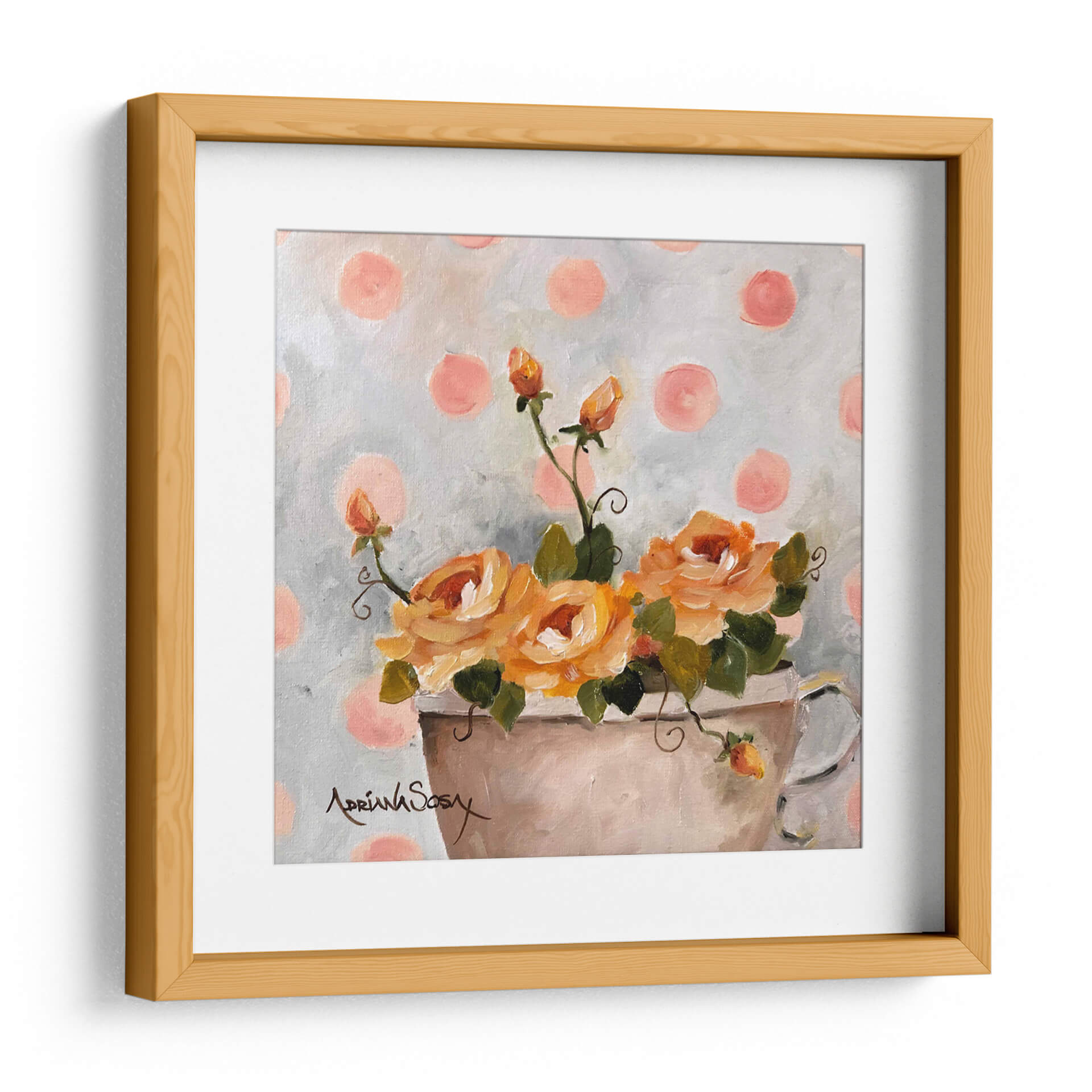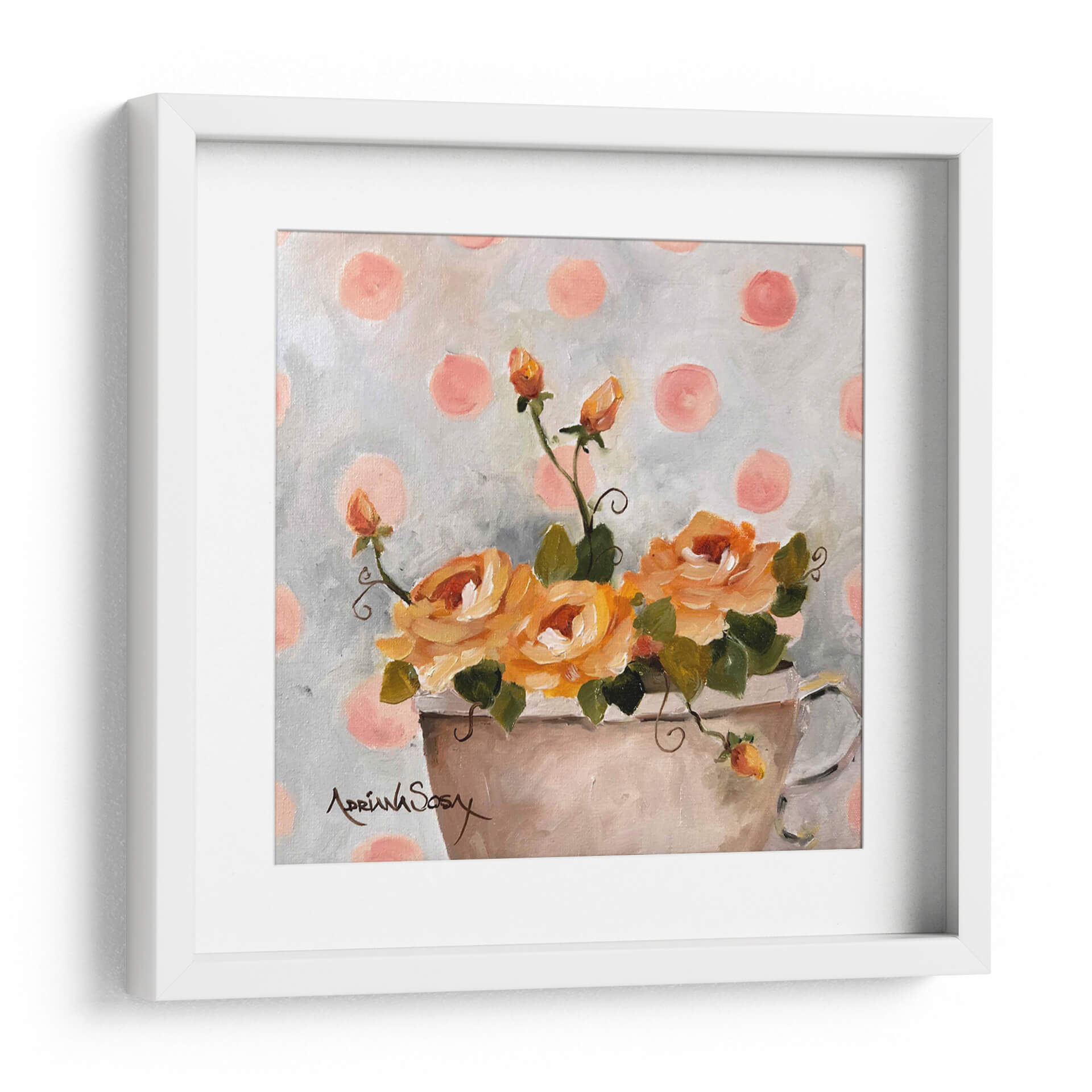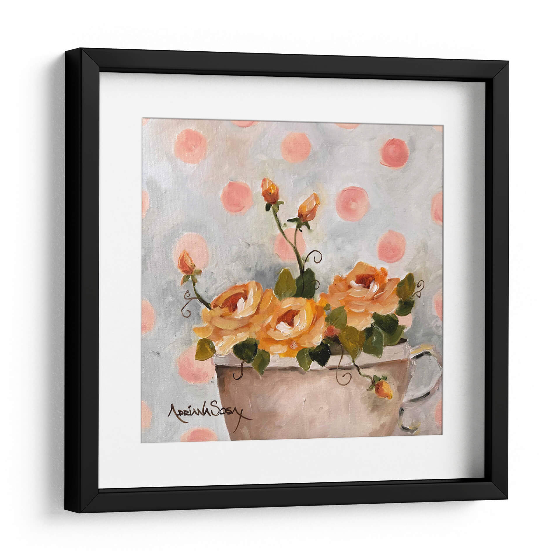 Sumérgete en la delicadeza y el encanto de "El tapiz de lunares", una obra de arte floral que irradia calidez y serenidad. Este cuadro decorativo captura la esencia de unas rosas de un vibrante tono anaranjado, dispuestas en un jarrón sencillo, con brotes que prometen florecer. El fondo, salpicado de lunares en un suave tono rosado sobre un lienzo grisáceo texturizado, crea un ambiente juguetón y a la vez sofisticado, evocando una sensación de nostalgia dulce. La pincelada suelta y expresiva de Adriana Sosa confiere a la pieza una textura rica y una vitalidad palpable, invitando a contemplar la belleza efímera de la naturaleza. Ideal para añadir un toque de color y optimismo a cualquier estancia, este cuadro es perfecto para salones, dormitorios o estudios que busquen un punto focal alegre y elegante. Su estilo, que combina lo clásico de la pintura floral con un toque contemporáneo por el patrón de puntos, lo convierte en una pieza versátil que complementará decoraciones tanto tradicionales como modernas, aportando un aire de frescura y alegría atemporal.