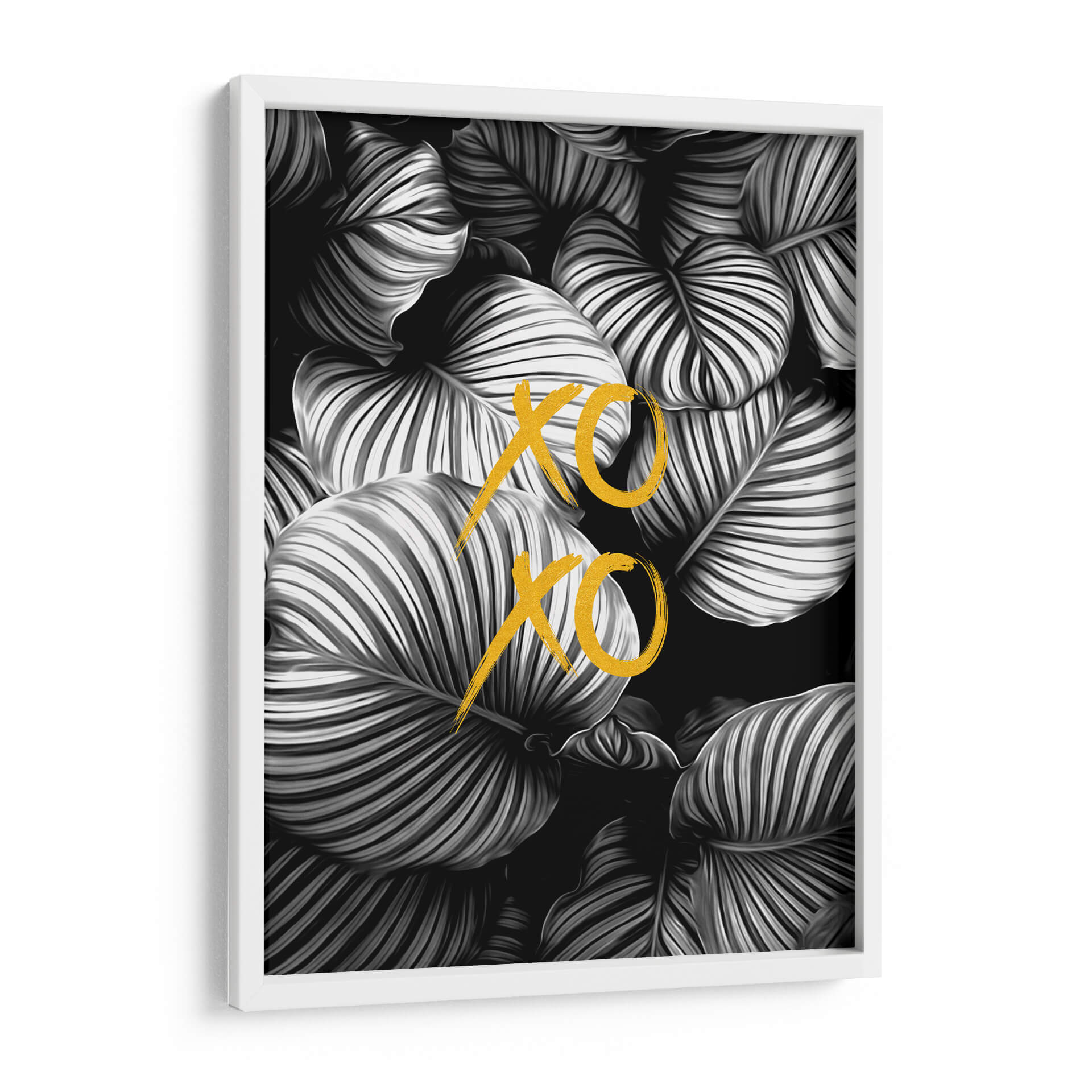 Sumérgete en la elegancia botánica con este cautivador cuadro decorativo que presenta un primer plano detallado de hojas exuberantes en tonos de blanco y negro. La composición se ve realzada por la sutil adición de "XOXO" en un vibrante color dorado, añadiendo un toque de calidez y afecto a la escena. Las texturas intrincadas de las hojas, con sus venas definidas y contornos suaves, crean una profundidad visual fascinante, mientras que la paleta monocromática evoca una sensación de sofisticación y calma. Este arte de pared es una elección perfecta para quienes buscan infundir a su hogar u oficina una atmósfera de serenidad moderna con un guiño juguetón. Ideal para salas de estar, dormitorios o incluso espacios de trabajo que se beneficien de un toque de naturaleza estilizada y un sentimiento de conexión. La fusión de elementos naturales con un diseño gráfico audaz lo convierte en una pieza versátil que complementa una amplia gama de estilos decorativos, desde el contemporáneo hasta el minimalista.