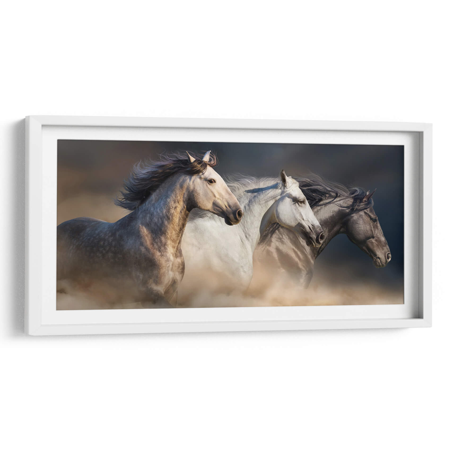 Captura la esencia de la libertad y la fuerza indomable con "Tres Caballos Galopando", una obra de arte impactante que inmortaliza la majestuosidad equina en pleno movimiento. Esta pieza visualmente cautivadora presenta tres caballos de diferentes tonalidades —un gris moteado, un blanco puro y un oscuro azabache— que corren juntos, levantando nubes de polvo que añaden una textura dinámica y etérea a la composición. La luz dorada del atardecer o del amanecer baña la escena, resaltando la musculatura de los animales y creando un contraste dramático con el fondo oscuro y ligeramente desenfocado. Los colores cálidos y terrosos predominan, evocando una sensación de naturaleza salvaje y pura energía. El estilo fotorealista y la composición diagonal otorgan profundidad y movimiento, invitando al espectador a sentir la velocidad y la emoción del galope. Ideal para espacios que buscan un toque de vitalidad y conexión con la naturaleza, como una sala de estar moderna, un estudio o incluso una entrada principal, "Tres Caballos Galopando" es una declaración de poder y elegancia que transformará cualquier ambiente, añadiendo un elemento de inspiración y belleza natural que resonará con los amantes de los animales y la decoración de interiores sofisticada.