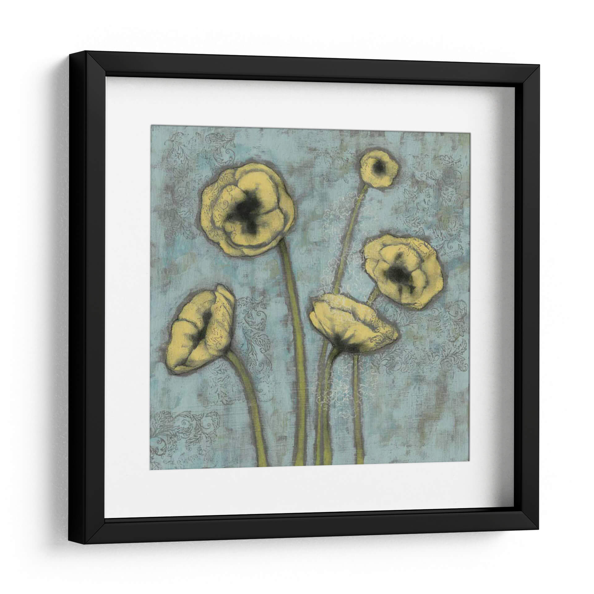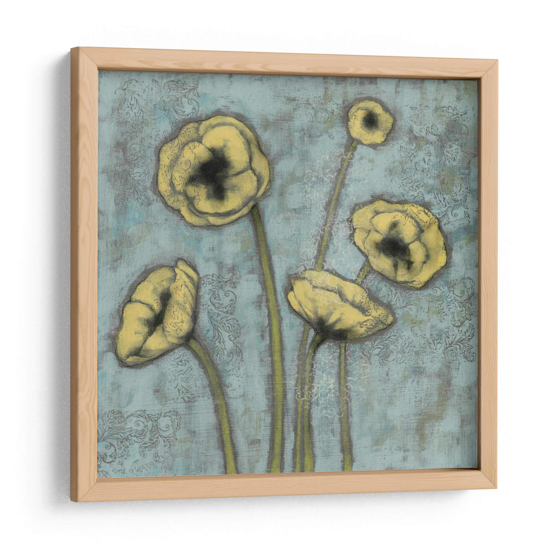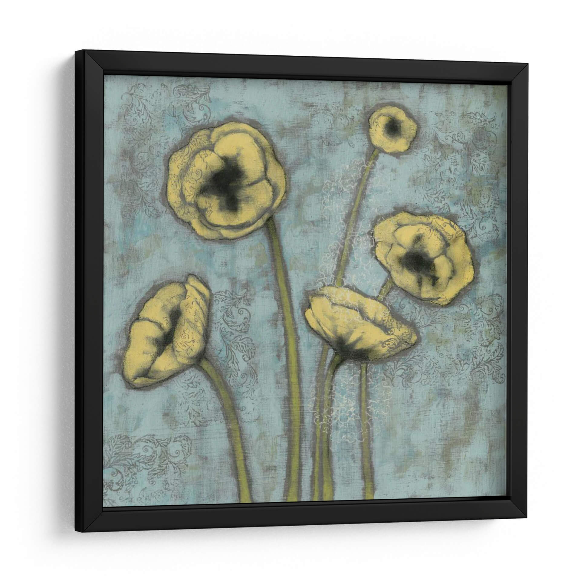 Sumérgete en la delicadeza y el encanto de "Sun Amapies I", una obra de arte contemporáneo de Jennifer Goldberger que captura la esencia de la naturaleza con un toque moderno. Este cuadro decorativo presenta un grupo de amapolas amarillas vibrantes, cuyas formas se definen con trazos audaces y texturas sugerentes. El fondo, un lienzo de tonos azul verdoso desgastado con sutiles patrones de damasco en gris pálido, crea un contraste cautivador que resalta la luminosidad de las flores. La composición vertical, con los tallos alargados de las amapolas elevándose con elegancia, aporta una sensación de crecimiento y vitalidad. La paleta de colores, dominada por el amarillo sol y los matices acuáticos del fondo, evoca una atmósfera de calma pero también de energía sutil. Es una pieza ideal para añadir un punto de interés visual y un toque de frescura a cualquier espacio, ya sea un salón moderno, una oficina serena o un dormitorio acogedor. "Sun Amapies I" es más que una simple decoración; es una invitación a contemplar la belleza efímera de las flores y a infundir serenidad y alegría en tu hogar.