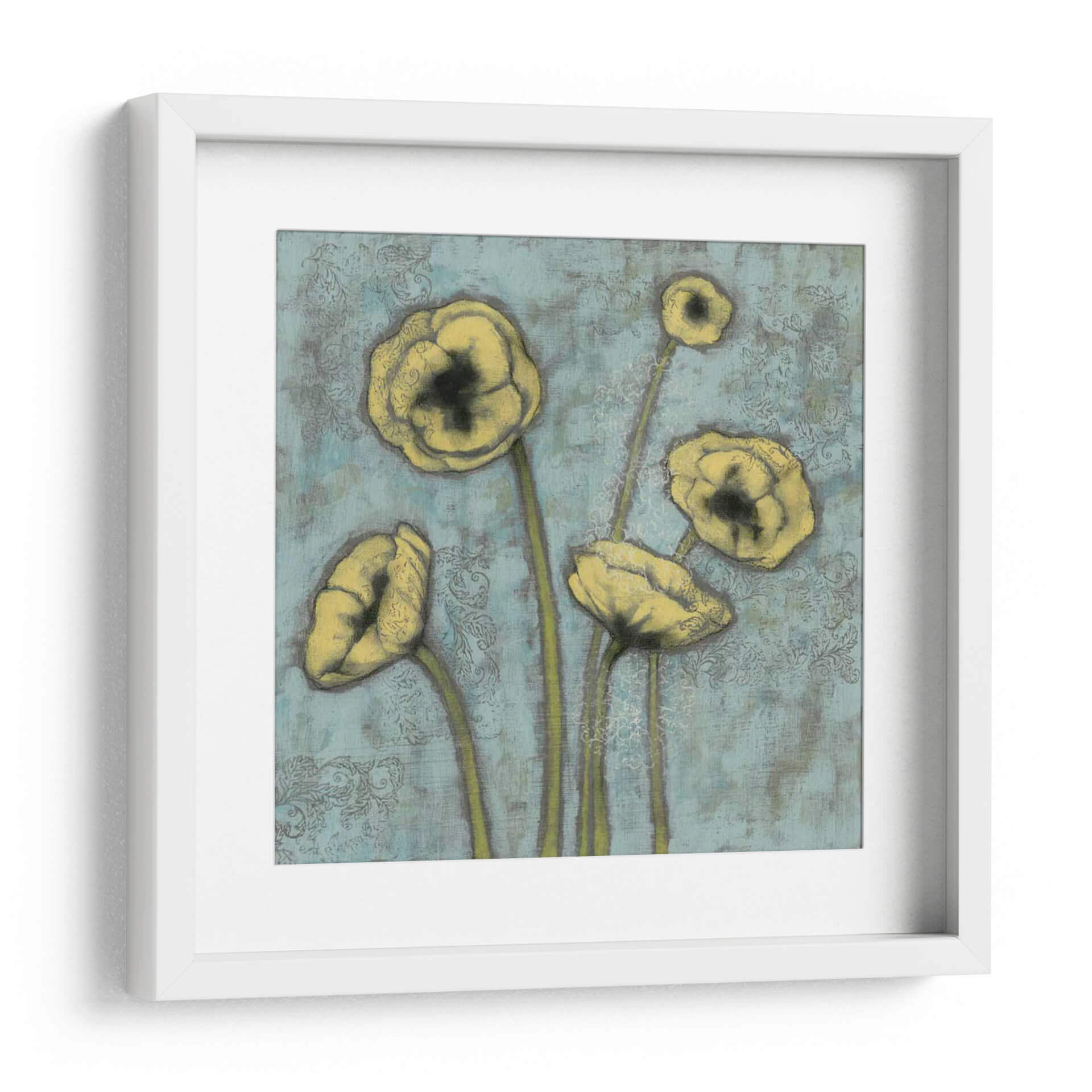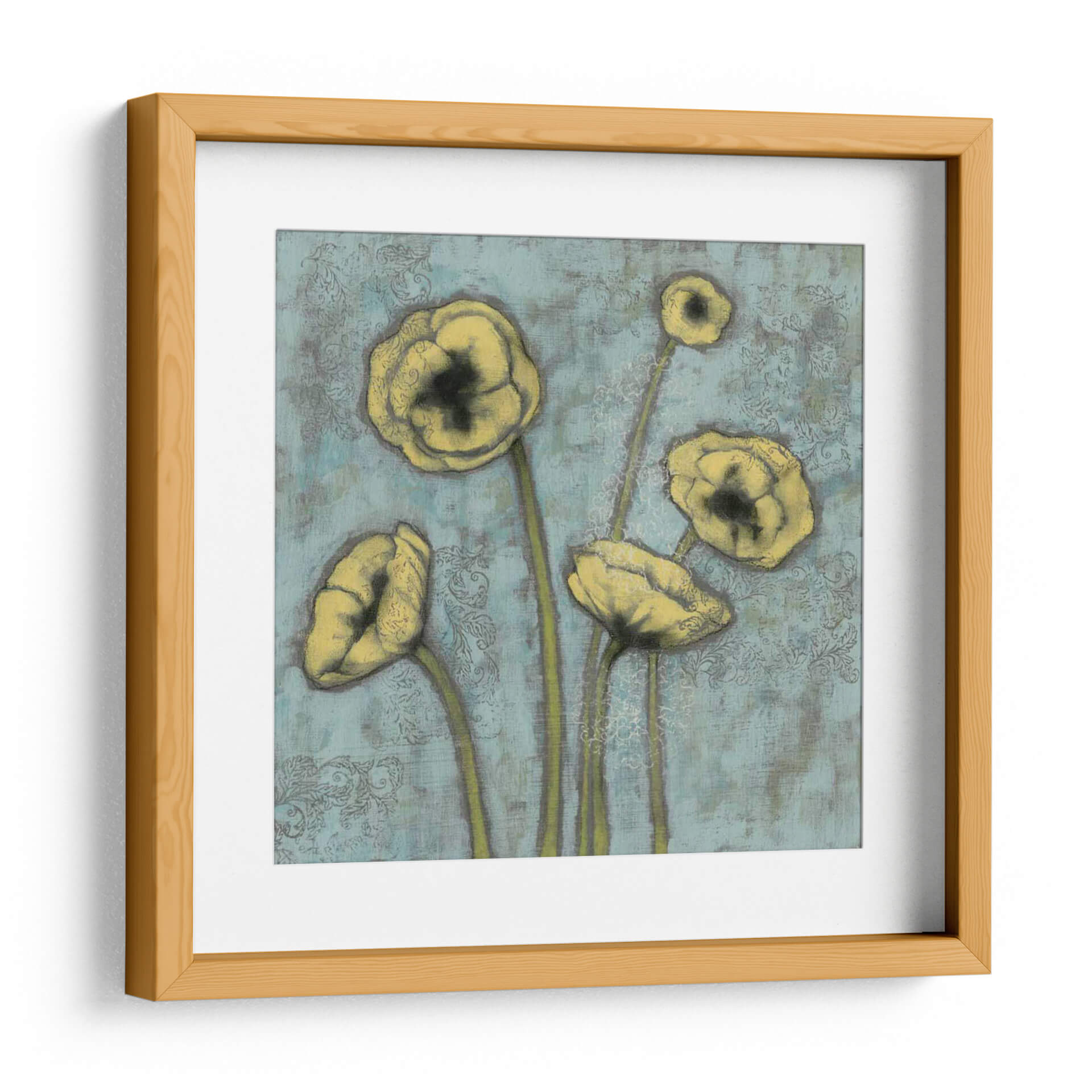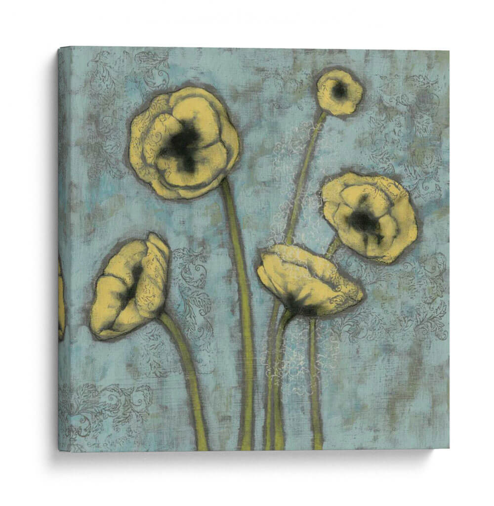 Sumérgete en la delicadeza y el encanto de "Sun Amapies I", una obra de arte contemporáneo de Jennifer Goldberger que captura la esencia de la naturaleza con un toque moderno. Este cuadro decorativo presenta un grupo de amapolas amarillas vibrantes, cuyas formas se definen con trazos audaces y texturas sugerentes. El fondo, un lienzo de tonos azul verdoso desgastado con sutiles patrones de damasco en gris pálido, crea un contraste cautivador que resalta la luminosidad de las flores. La composición vertical, con los tallos alargados de las amapolas elevándose con elegancia, aporta una sensación de crecimiento y vitalidad. La paleta de colores, dominada por el amarillo sol y los matices acuáticos del fondo, evoca una atmósfera de calma pero también de energía sutil. Es una pieza ideal para añadir un punto de interés visual y un toque de frescura a cualquier espacio, ya sea un salón moderno, una oficina serena o un dormitorio acogedor. "Sun Amapies I" es más que una simple decoración; es una invitación a contemplar la belleza efímera de las flores y a infundir serenidad y alegría en tu hogar.