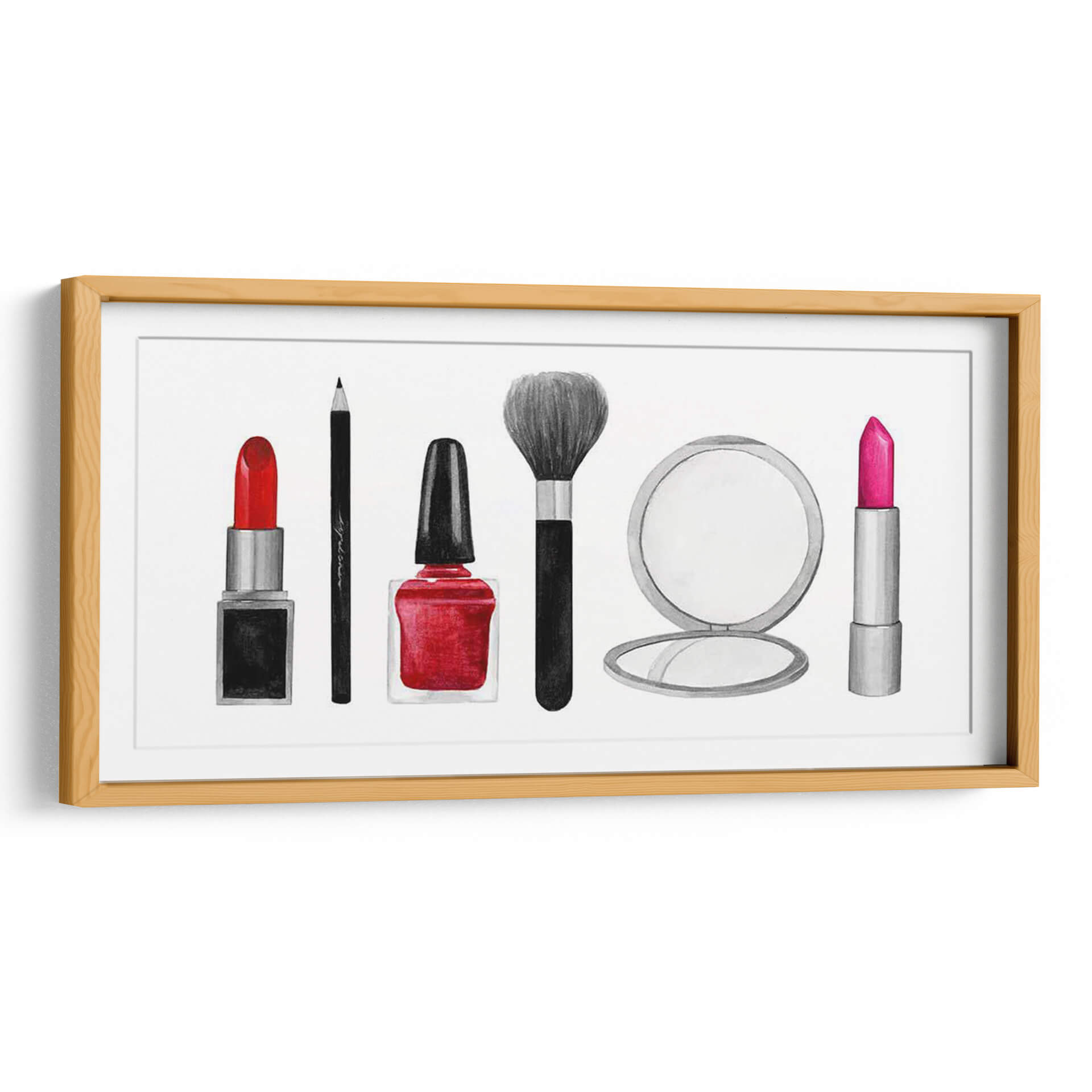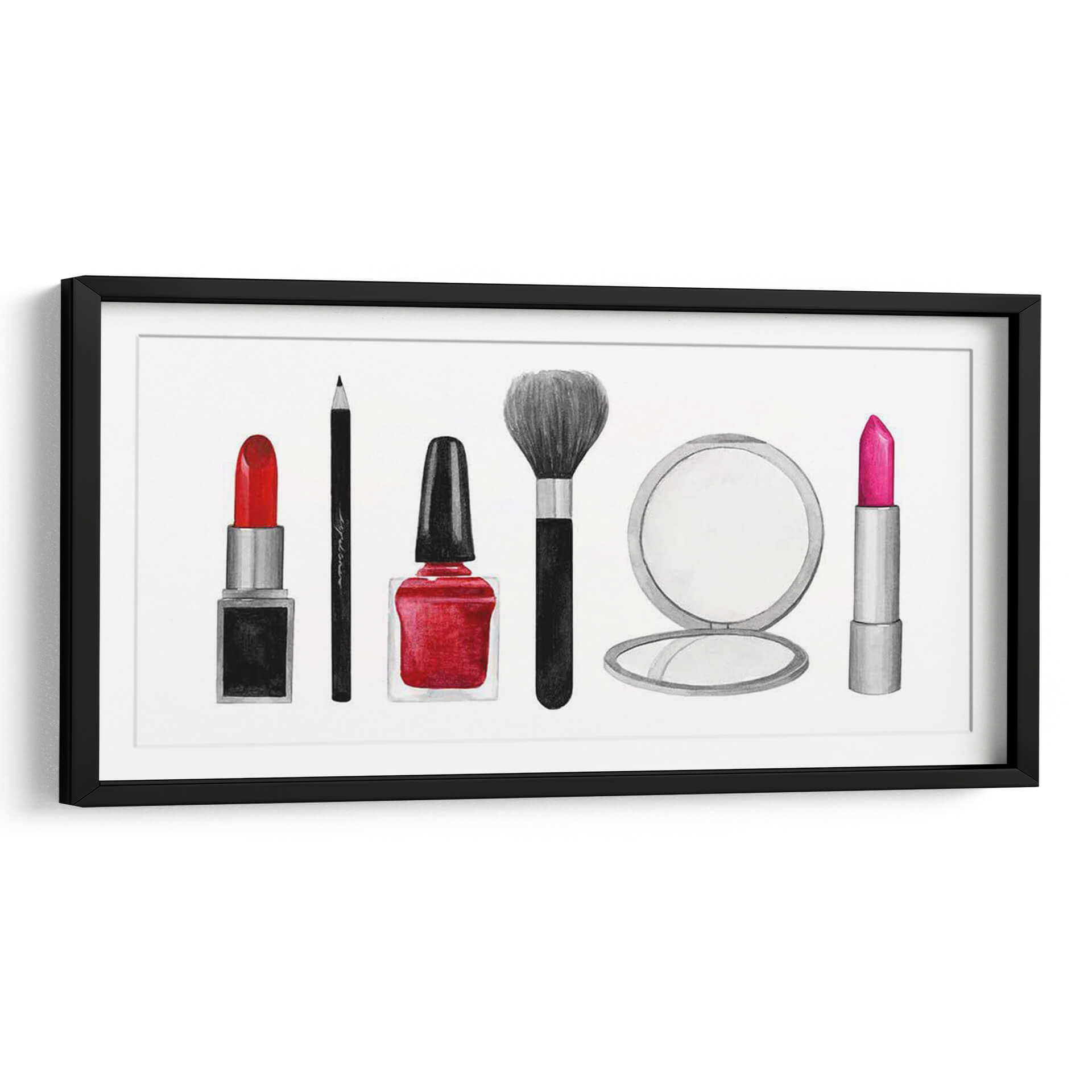 Este encantador cuadro decorativo, titulado 'Muestras De Maquillaje II' por Grace Popp, captura la esencia de la elegancia y el glamour con un toque artístico. La obra presenta una delicada ilustración de artículos de belleza esenciales, incluyendo un audaz lápiz labial rojo, un práctico lápiz de ojos, un vibrante esmalte de uñas, un suave pincel de maquillaje y un espejo compacto abierto, junto a otro labial en un tono fucsia llamativo. La paleta de colores se centra en rojos intensos y fucsia, contrastando con los tonos neutros del negro y los grises de los accesorios y el fondo blanco, creando una composición limpia y sofisticada. El estilo detallado y con toques de acuarela o lápiz transmite una sensación de refinamiento y cuidado personal. Ideal para añadir un toque de sofisticación a un tocador, un salón de belleza, una peluquería o como un acento chic en un dormitorio o vestidor. Este cuadro decorativo es perfecto para quienes aprecian la moda, la belleza y el arte contemporáneo, aportando un aire de estilo y personalidad a cualquier espacio. Su diseño evoca una sensación de preparación y confianza, celebrando los rituales de belleza con una estética cuidada y moderna. Añade este toque de glamour a tu hogar.