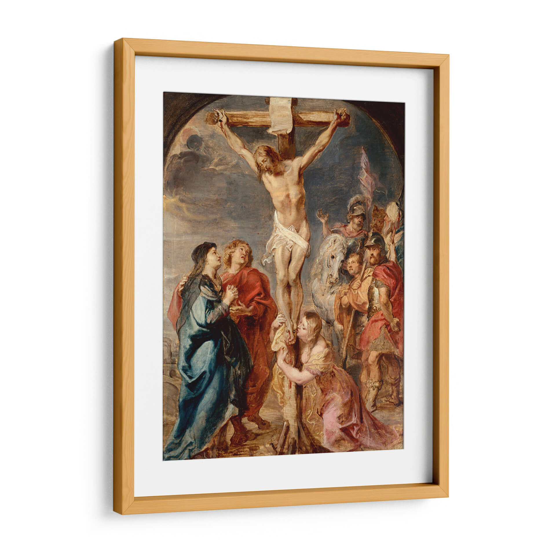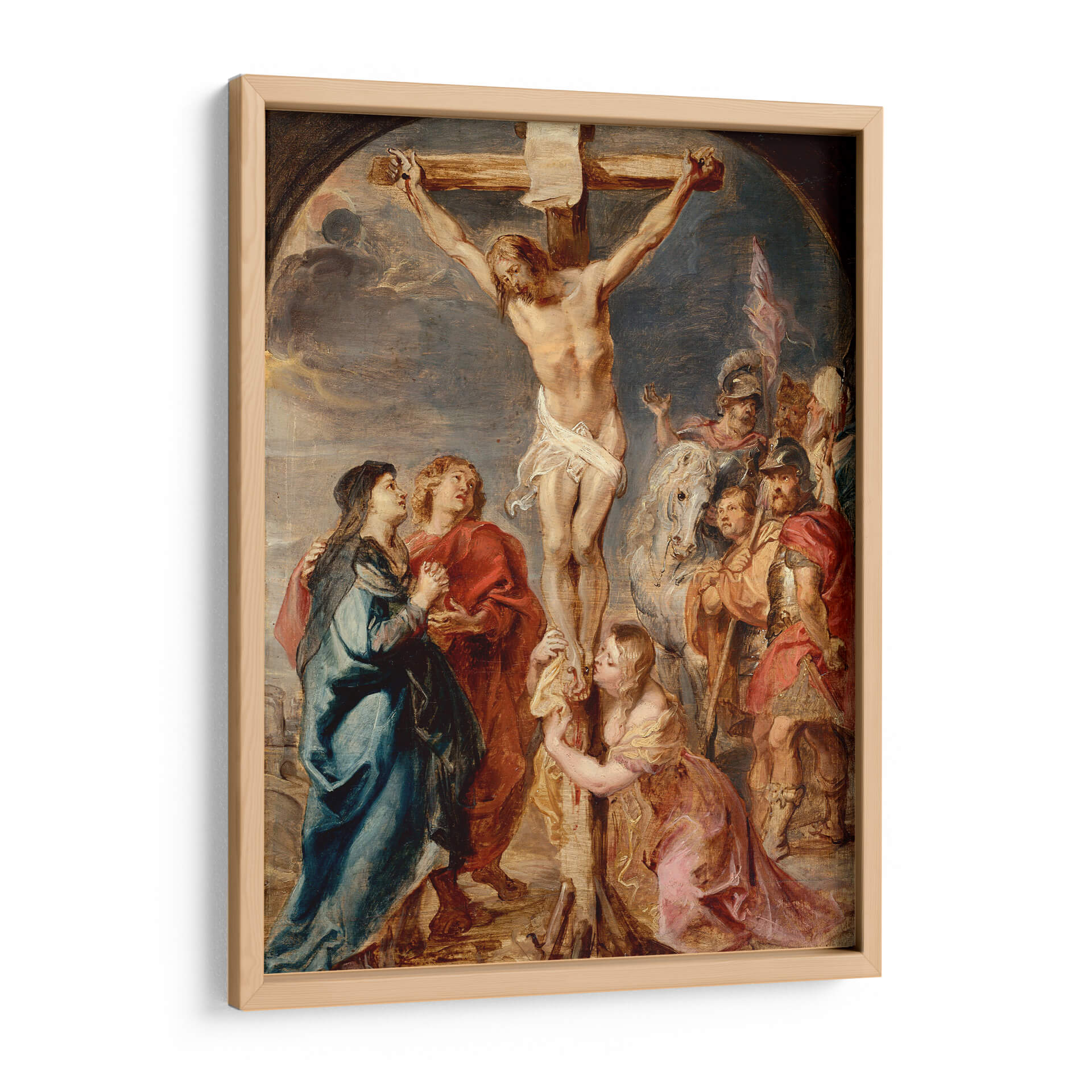 Sumérgete en la profunda emotividad y el dramatismo de "Cristo en la Cruz", una obra maestra inspirada en el estilo barroco de Peter Paul Rubens. Este cuadro decorativo captura un momento de intensa devoción y sufrimiento, con una composición dinámica que guía la mirada a través de las figuras que rodean la escena. La paleta de colores rica y terrenal, con contrastes de luz y sombra, acentúa la teatralidad y la profundidad emocional de la pieza. Las expresiones de dolor, fe y resignación se entrelazan, creando una atmósfera de solemnidad y reflexión que trasciende el tiempo. La musculatura de Cristo, la caída de su cuerpo y el drapeado de las túnicas están representados con un realismo impactante, característico del barroco flamenco. Este cuadro religioso es ideal para quienes buscan infundir a su hogar u oficina un sentido de trascendencia espiritual y aprecio por el arte clásico. Aporta un punto focal de gran poder visual y resonancia emocional, perfecto para salas de estar, estudios o espacios de meditación, invitando a la contemplación y al diálogo. Una pieza que no solo decora, sino que también inspira y conmueve.
