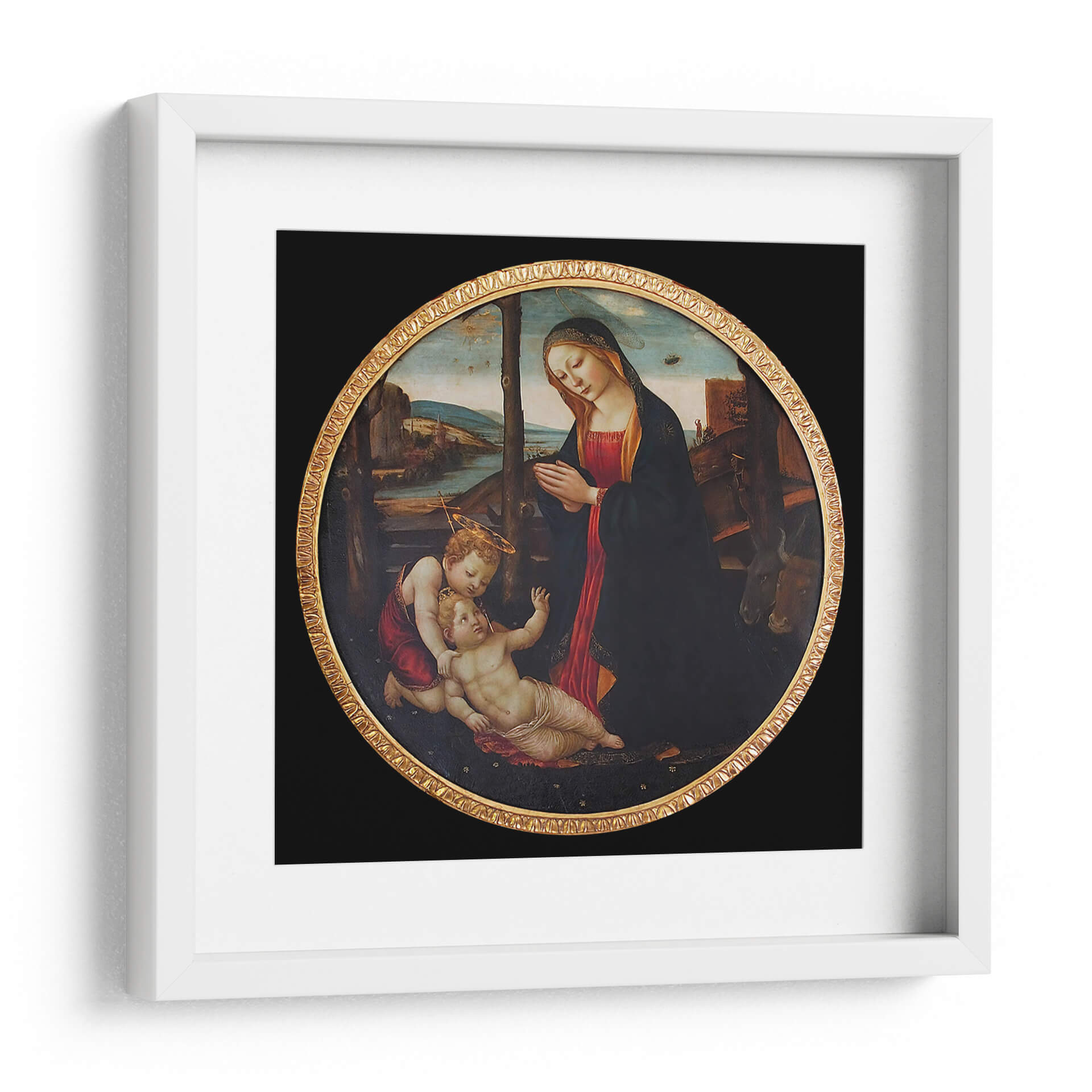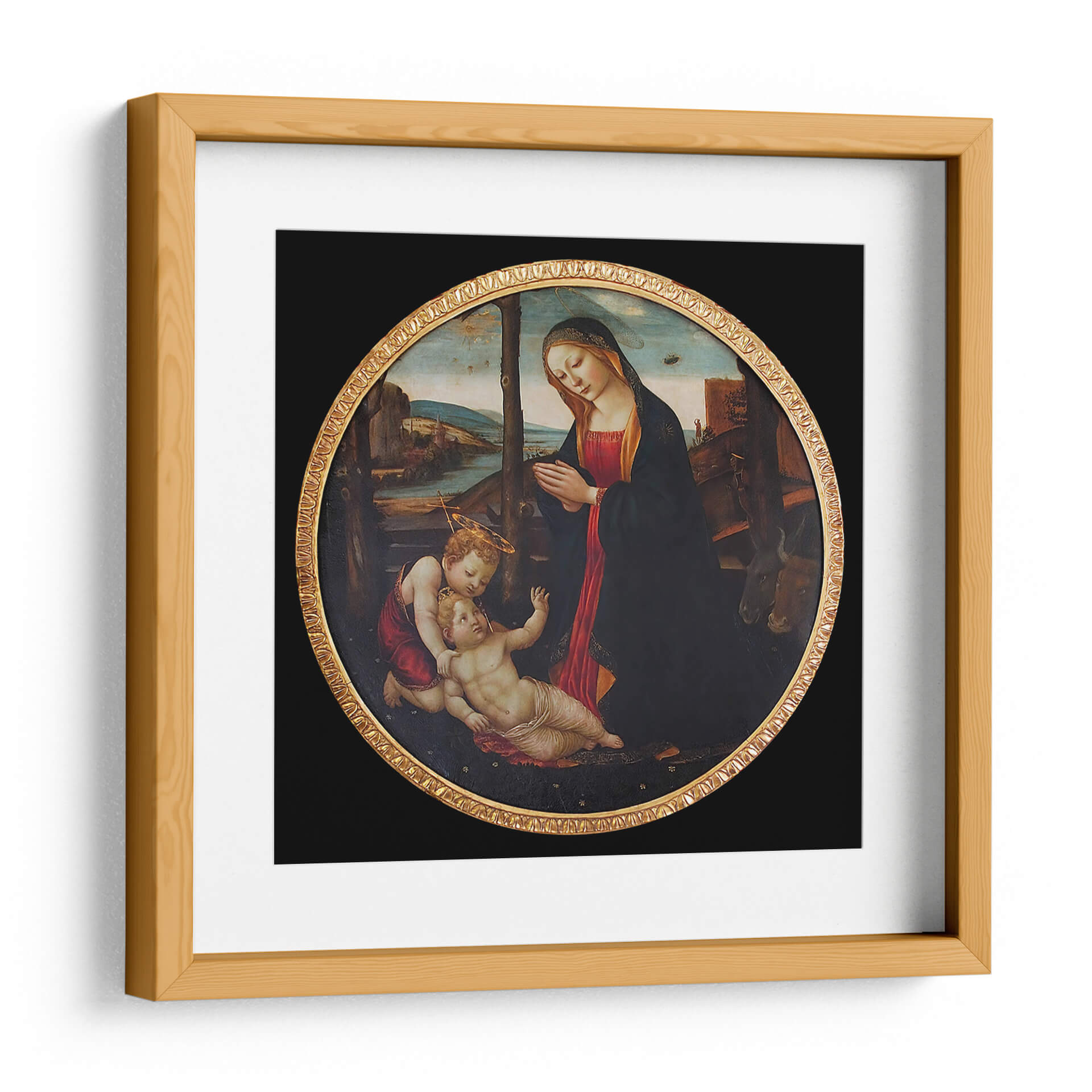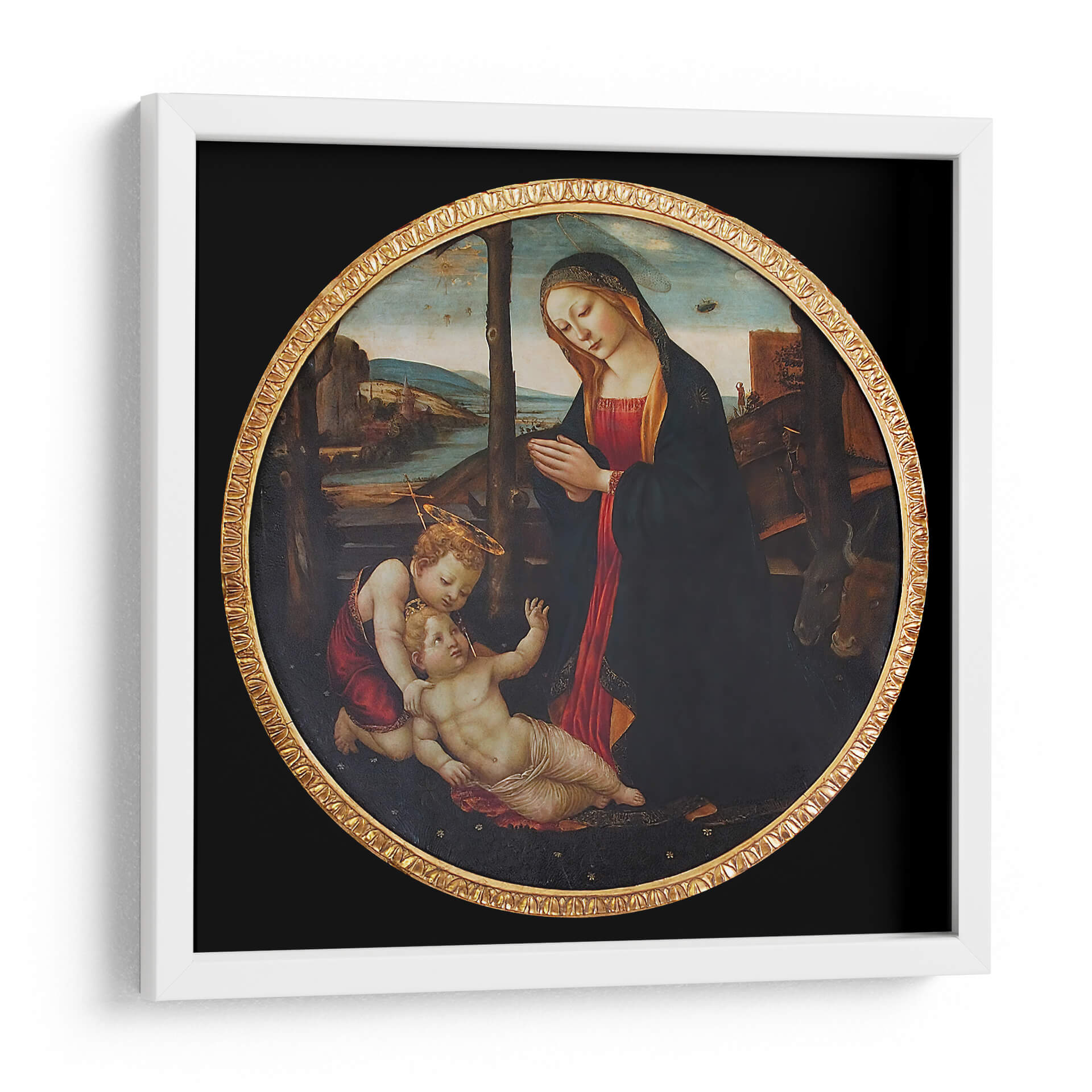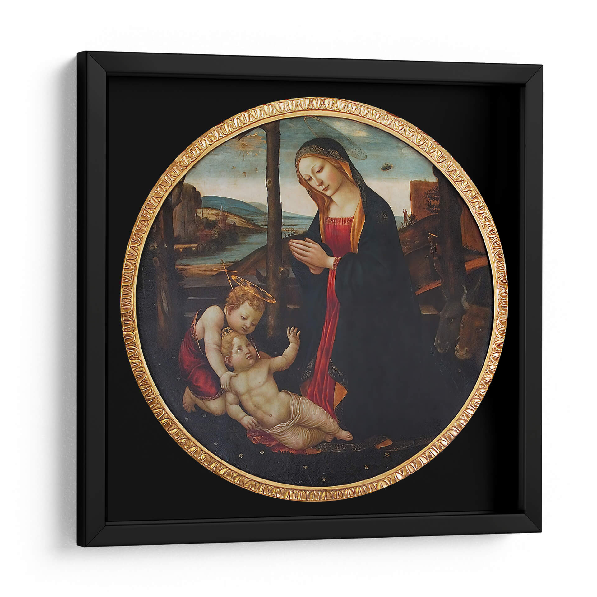 Sumérgete en la serenidad y la devoción con esta exquisita reproducción de "Virgen María con el Niño Dios y San Juanito" de Domenico Ghirlandaio. Esta obra maestra, capturada en un formato circular clásico con un marco dorado ornamentado, evoca una atmósfera de profunda ternura y espiritualidad. La paleta de colores, dominada por ricos rojos, azules oscuros y tonos terrosos, crea un ambiente de calidez y reverencia. La composición central, que presenta a la Virgen María en oración junto al Niño Jesús y San Juan Bautista, irradia una conexión maternal inquebrantable y un sentido de protección divina. El detallado paisaje de fondo, con sus sutiles matices y referencias arquitectónicas, añade profundidad y realismo a la escena. Ideal para quienes buscan infundir calma y belleza clásica en su hogar, esta pieza es perfecta para salones, dormitorios o incluso espacios de meditación, añadiendo un toque de arte renacentista y significado espiritual a cualquier decoración.