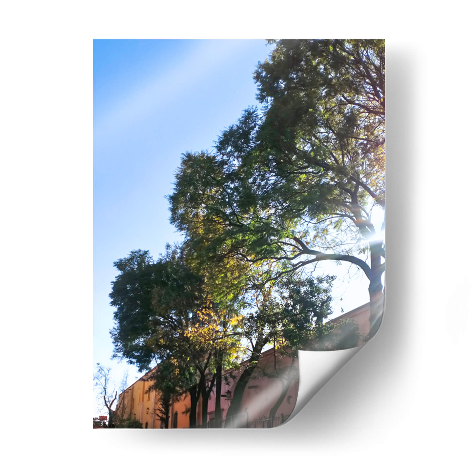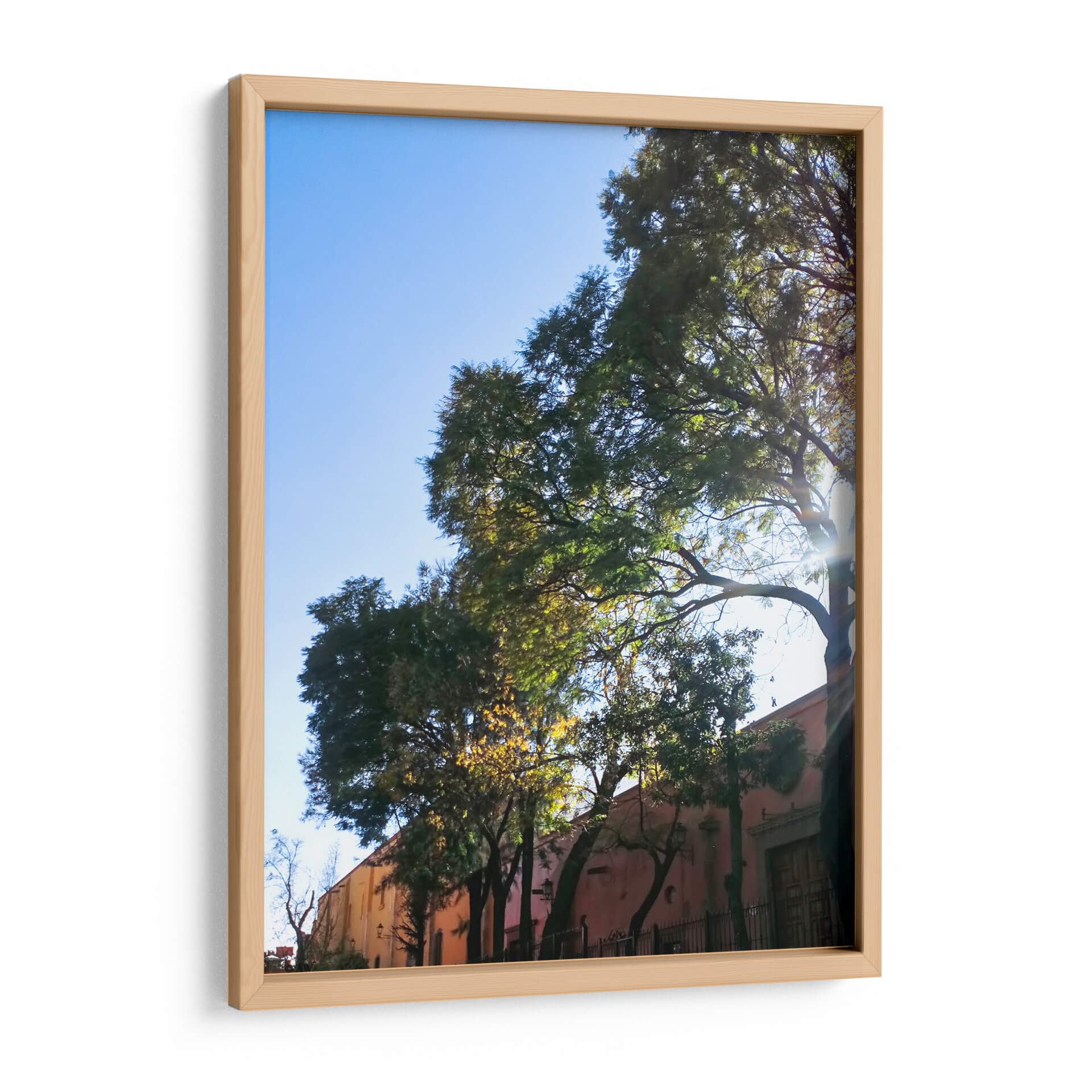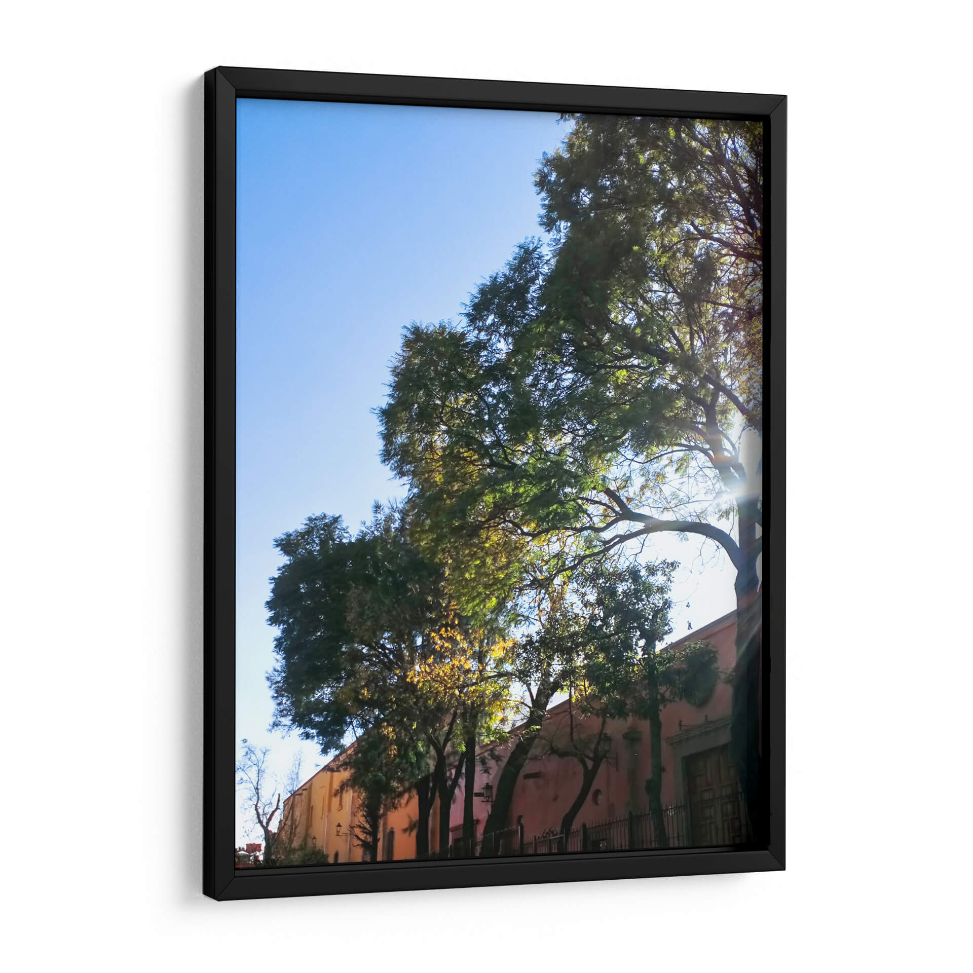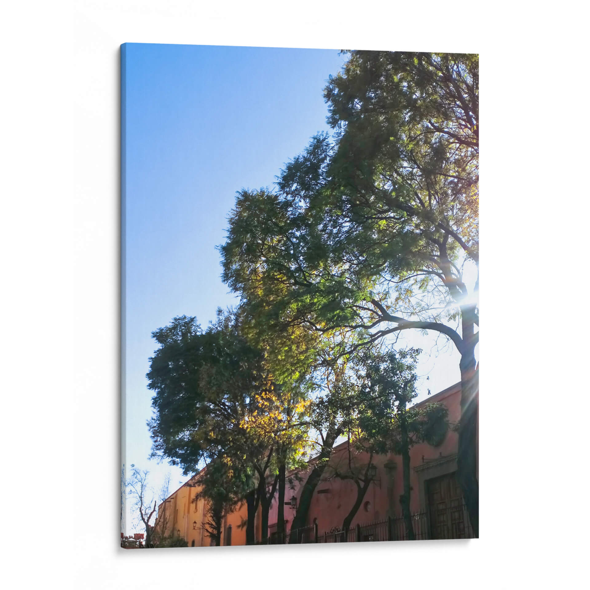 Sumérgete en la serenidad y el encanto arquitectónico con este cautivador cuadro decorativo que captura la esencia de "Árboles Coloniales". La obra presenta una perspectiva única donde majestuosos árboles de follaje exuberante se alzan contra un cielo azul despejado, bañado por la cálida luz del sol que se filtra entre las ramas, creando un juego de luces y sombras hipnotizante. Al fondo, una edificación de tonos rosados y ocres, con detalles arquitectónicos coloniales como puertas de madera y rejas de hierro forjado, añade una capa de historia y calidez a la escena. La paleta de colores, dominada por verdes intensos de la vegetación, el azul vibrante del cielo y los tonos terrosos de la construcción, evoca una atmósfera de paz y tranquilidad. Este cuadro es una invitación a un paseo imaginario por un lugar lleno de historia y belleza natural, ideal para quienes buscan añadir un toque de sofisticación y calma a su hogar u oficina. Su composición, que entrelaza lo natural y lo construido, lo convierte en una pieza versátil, perfecta para salones, dormitorios o estudios, aportando una sensación de conexión con la naturaleza y la arquitectura tradicional. "Árboles Coloniales" es más que una simple decoración; es una ventana a un rincón lleno de vida y serenidad.