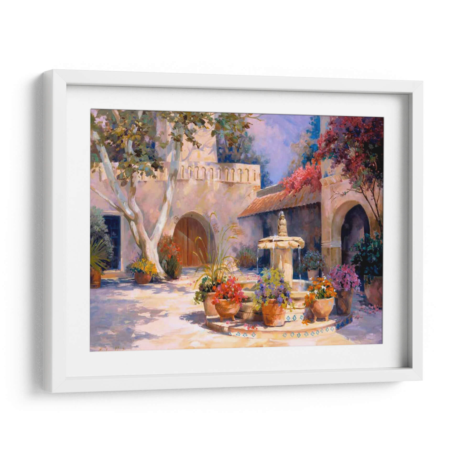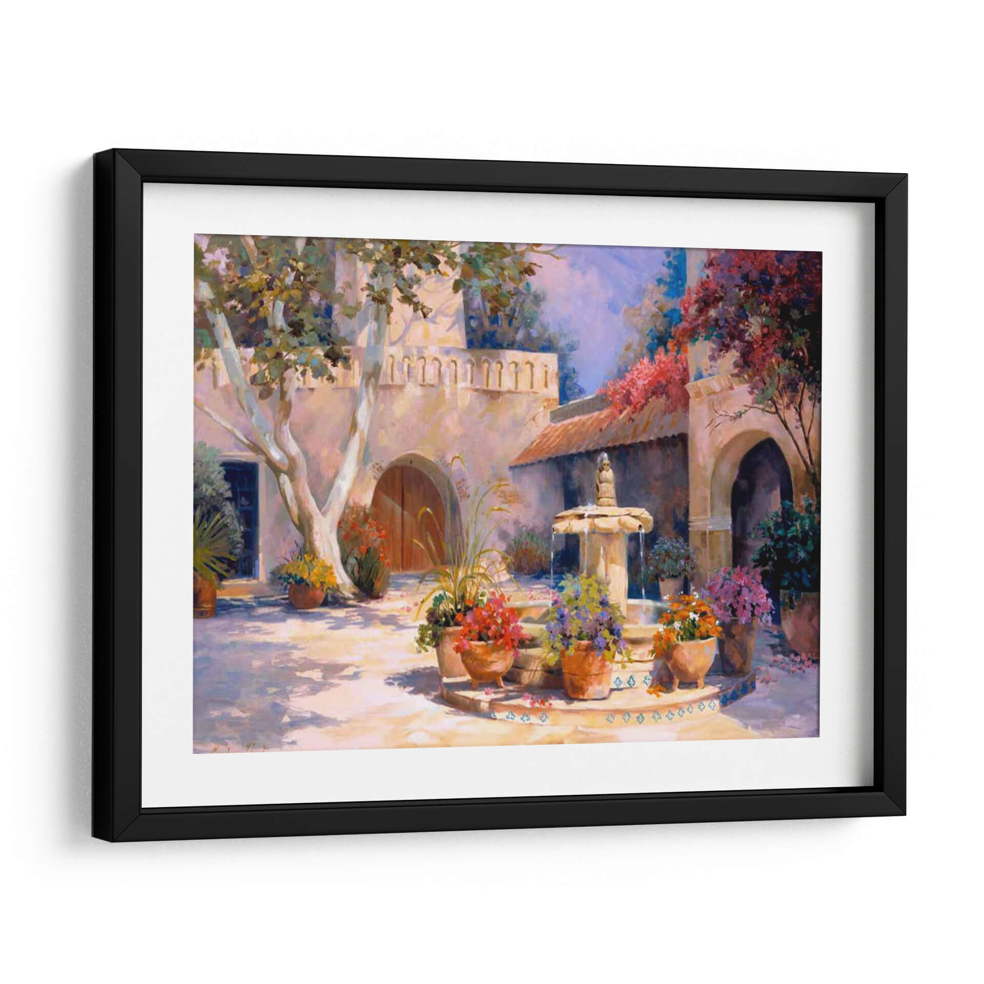 Sumérgete en la serena belleza de 'La Fuente', una obra de arte cautivadora de Carolyne Hawley. Este cuadro decorativo transporta al espectador a un idílico patio bañado por el sol, donde una fuente de piedra susurra historias de tranquilidad. La paleta de colores, rica en tonos cálidos tierra y acentos vibrantes de flores en maceta, evoca una atmósfera de paz y calidez mediterránea. La composición, con su juego de luces y sombras, y la sutil arquitectura del fondo, invitan a la contemplación y al descanso visual. El árbol frondoso en primer plano y la exuberante vegetación que rodea la fuente añaden una sensación de vitalidad y naturaleza integrada. Ideal para crear un oasis de calma en tu sala de estar, dormitorio o estudio, este cuadro decorativo es una invitación a la serenidad. Cada pincelada transmite la maestría de Hawley, logrando una pieza que no solo embellece, sino que también eleva el espíritu. Permite que 'La Fuente' se convierta en el corazón de tu hogar, aportando un toque de elegancia atemporal y una conexión con la naturaleza.