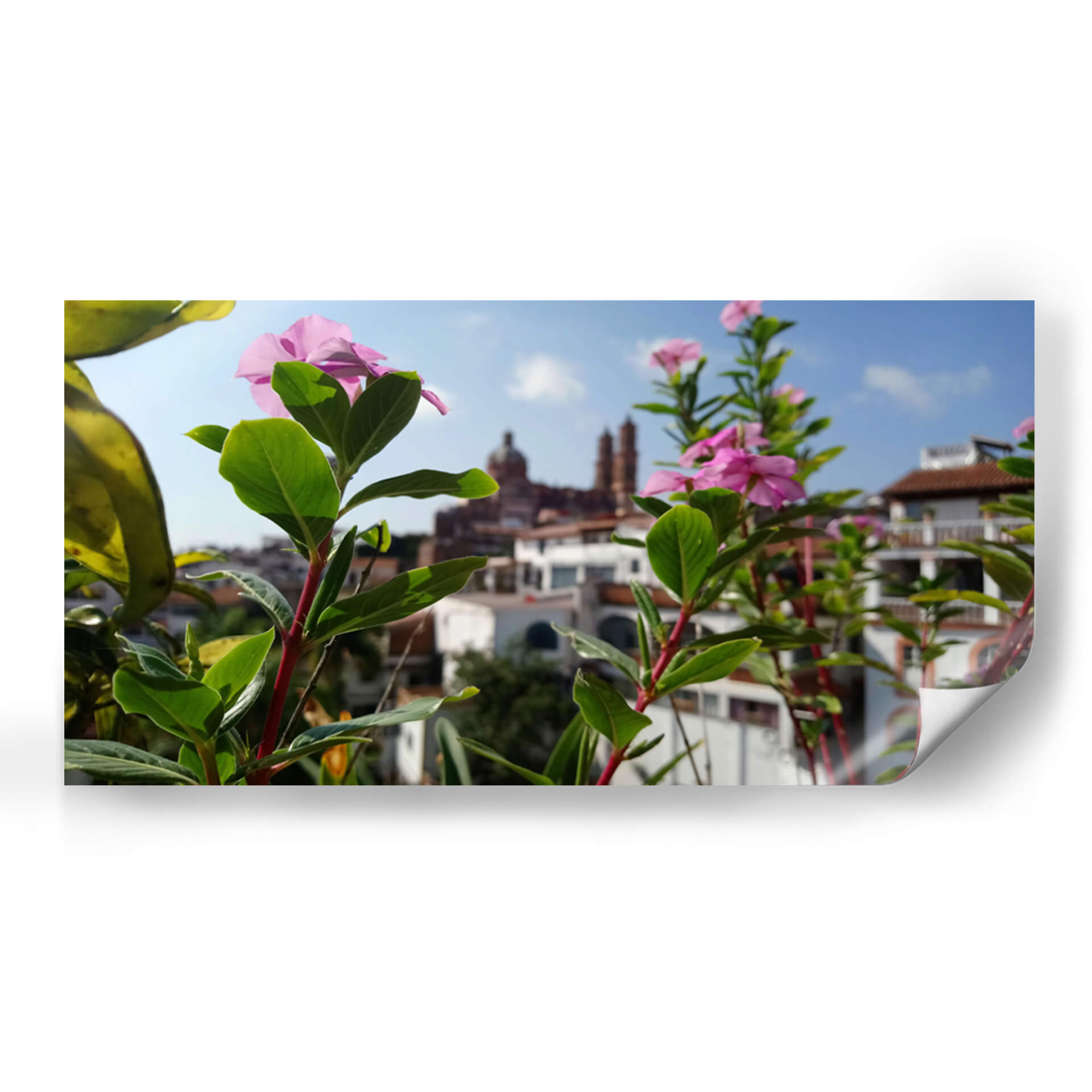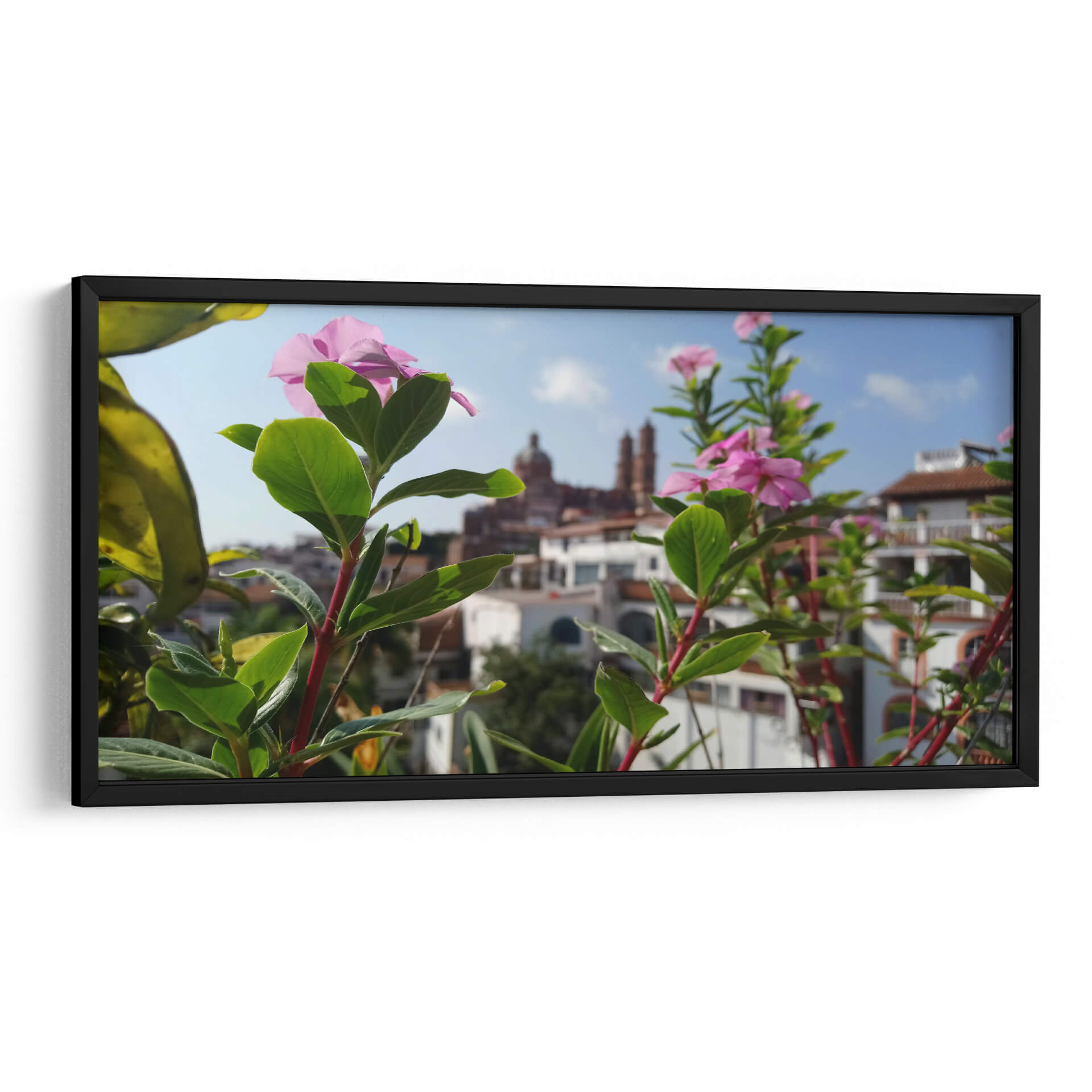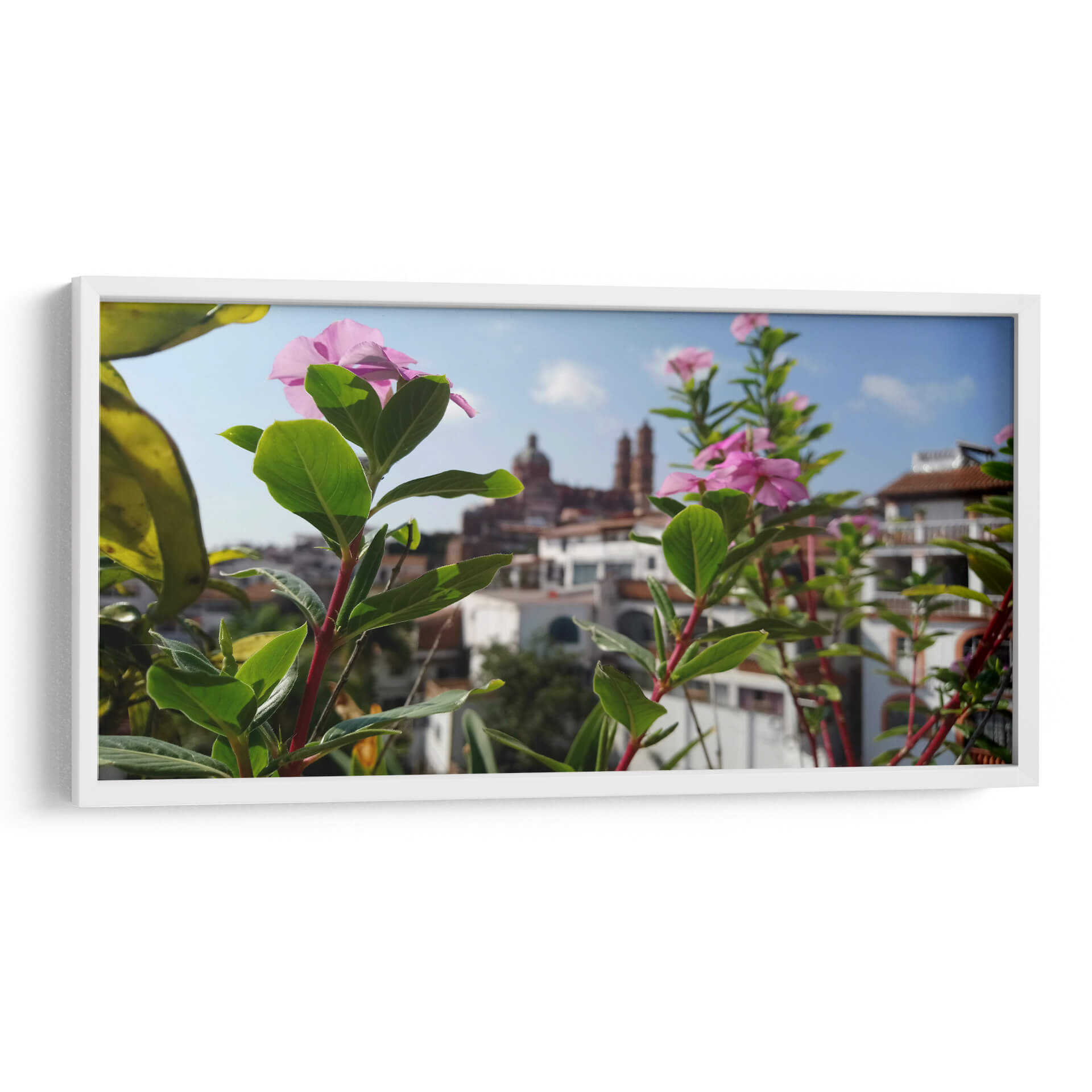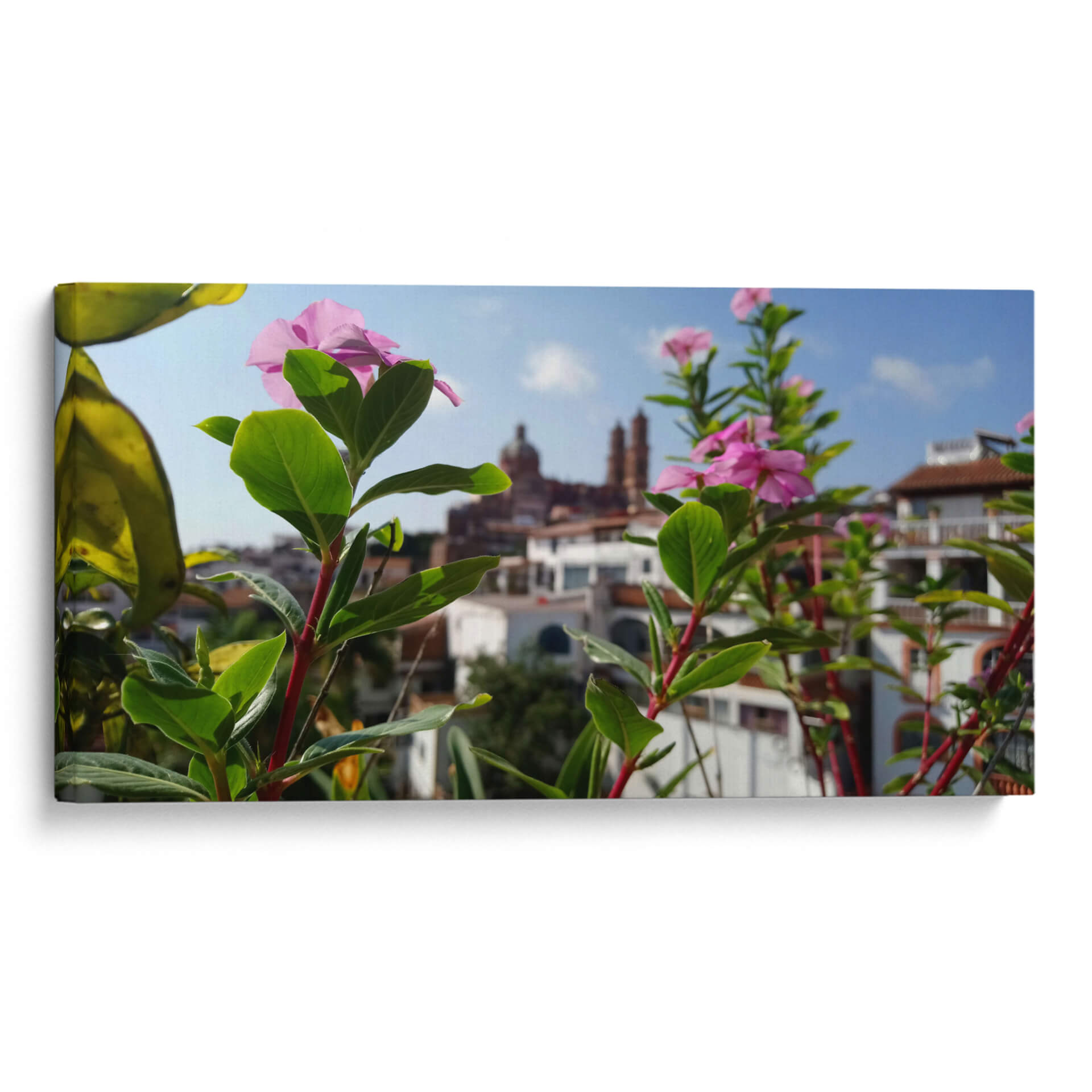 Captura la esencia vibrante de México con nuestro cuadro decorativo "Vista floral a la Catedral de Taxco". Esta obra, inspirada en la belleza arquitectónica y natural de Taxco, Guerrero, te transporta a un rincón encantador del país. El primer plano se adorna con exuberantes hojas verdes y delicadas flores rosas, creando una sensación de frescura y vitalidad. Detrás, se vislumbra el perfil de la icónica Catedral de Taxco, con sus cúpulas y torres emergiendo entre tejados de estilo colonial y fachadas blancas, todo bajo un cielo azul despejado salpicado de nubes. La composición juega con la profundidad, enfocando la atención en la textura y el color de la vegetación mientras sugiere la majestuosidad del edificio religioso y el encanto del pueblo mágico. Los tonos verdes intensos de las plantas contrastan armoniosamente con el blanco de las construcciones y el azul del cielo, mientras que los toques rosados de las flores añaden un punto de calidez y alegría. Este cuadro decorativo es ideal para añadir un toque de color y un aire vacacional a cualquier estancia, ya sea tu sala de estar, comedor, dormitorio u oficina. Es una pieza que evoca paz, belleza y la rica cultura mexicana, perfecta para quienes buscan un arte que cuente una historia y llene de vida sus espacios. Dale a tu hogar la atmósfera de un paraíso mexicano con esta cautivadora vista.