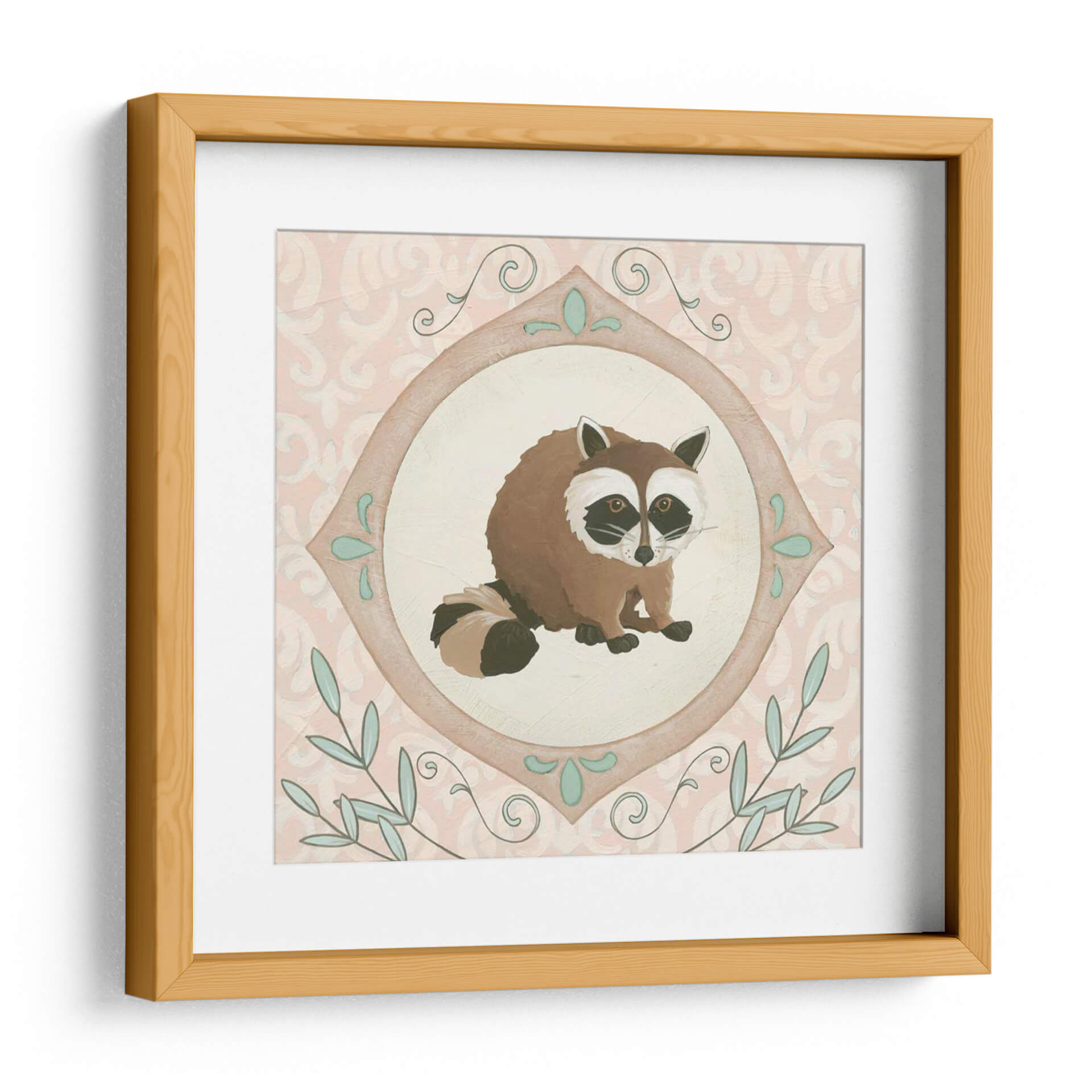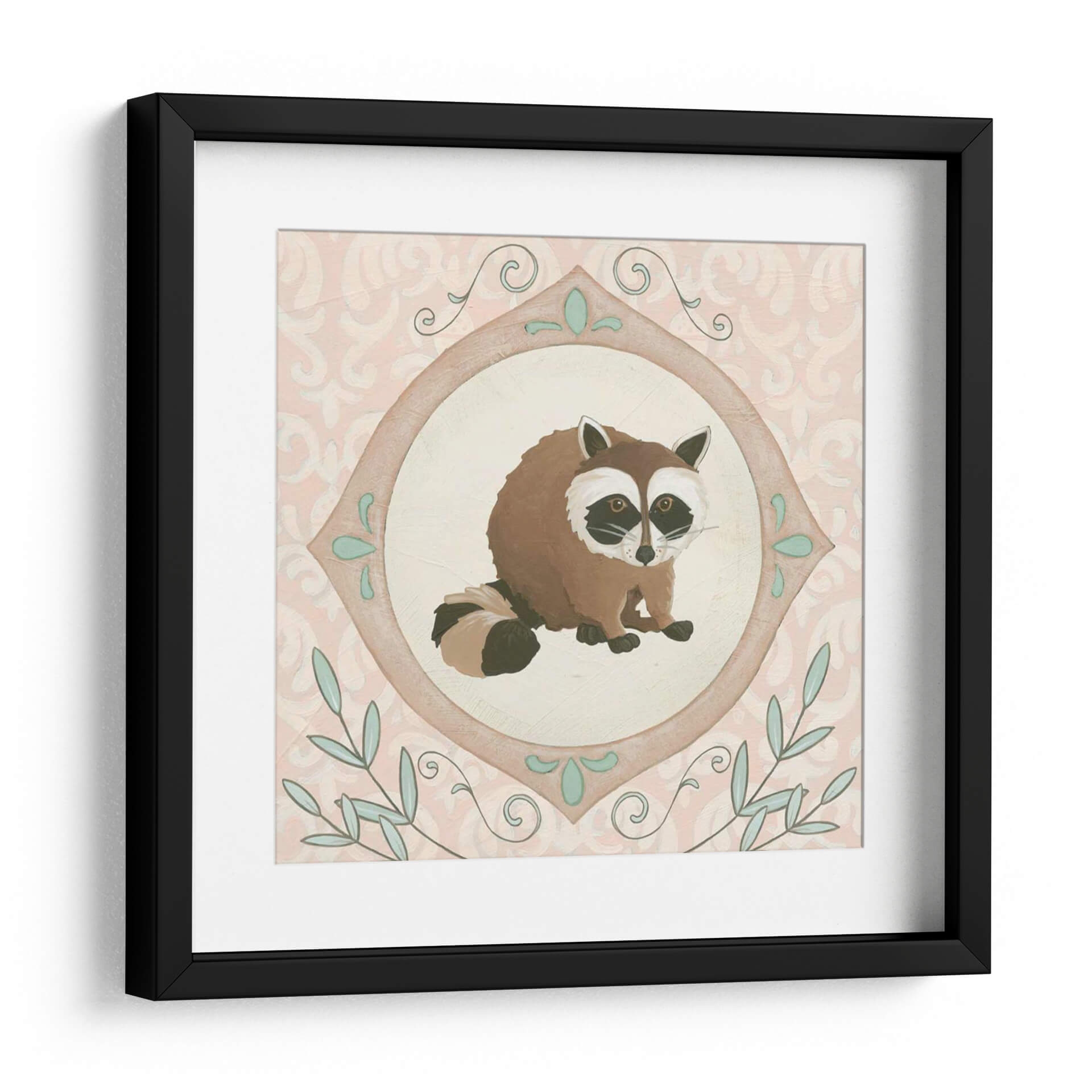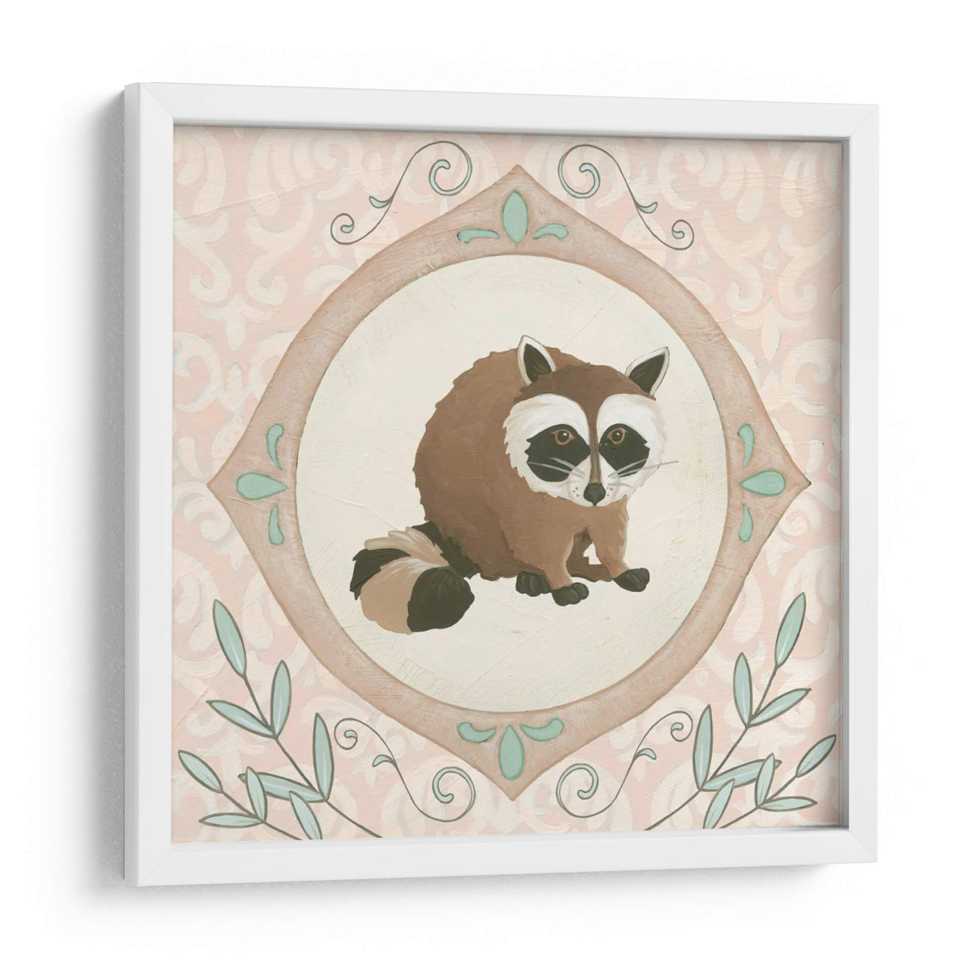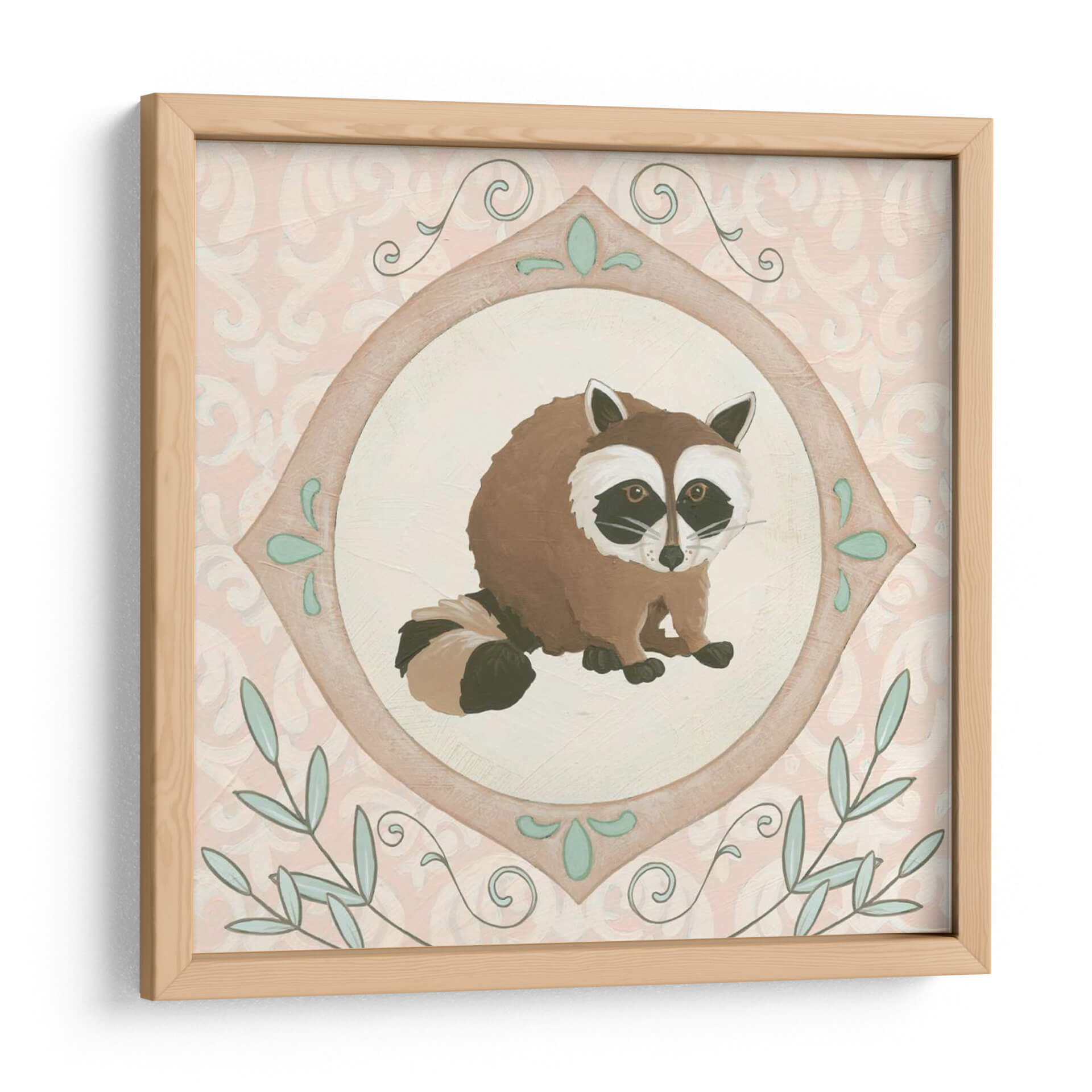 Sumérgete en la encantadora obra de arte "Bosque Del Camafeo VI" de June Erica Vess, una pieza que captura la dulzura y la curiosidad de la naturaleza. Este cuadro decorativo presenta un mapache adorablemente ilustrado, sentado en una pose juguetona dentro de un medallón ovalado ornamentado. El fondo, adornado con un sutil patrón damasco en tonos pastel de rosa y beige, aporta una elegancia vintage a la composición. Las delicadas ramas y hojas en color verde menta que enmarcan el medallón añaden un toque de frescura y movimiento, contrastando armoniosamente con la calidez del mapache. La paleta de colores, dominada por tonos tierra, rosados suaves y toques de verde, crea una atmósfera serena y acogedora, perfecta para cualquier espacio que busque un toque de ternura y estilo. Ideal para habitaciones infantiles, salas de estar con un toque bohemio o como pieza central en un rincón de lectura, "Bosque Del Camafeo VI" es una invitación a la fantasía y al confort. La técnica de ilustración, con sus líneas definidas y colores planos, le otorga un carácter moderno y atemporal, asegurando que esta obra de arte sea un punto de atracción y conversación en tu hogar u oficina. Descubre la magia de este cuadro decorativo y permite que su encanto transforme tu ambiente.