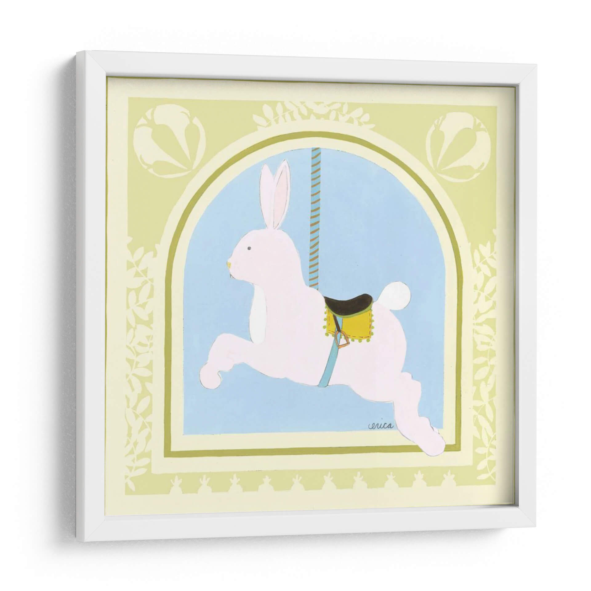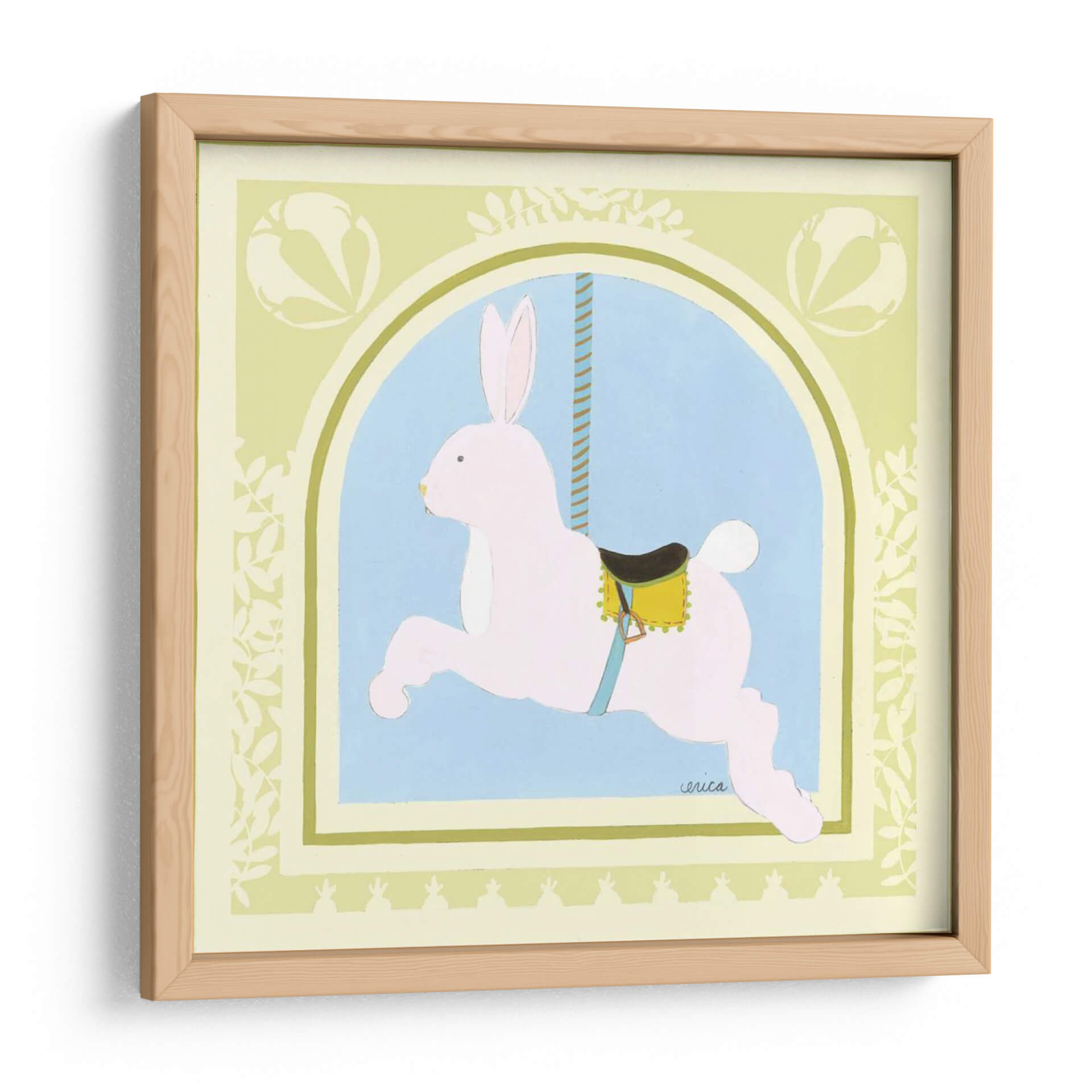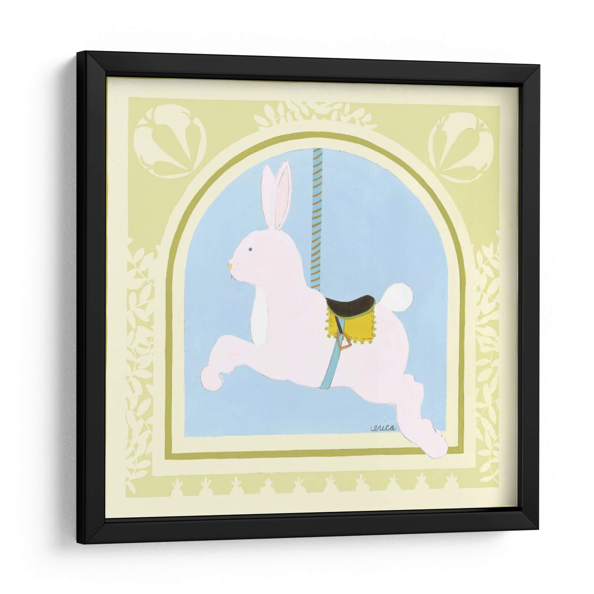 Embárquese en un viaje caprichoso con nuestro encantador cuadro decorativo 'Carrusel De Conejo', una obra maestra del artista June Erica Vess. Esta pieza evoca una sensación de inocencia y alegría infantil, presentando un conejito rosa delicadamente representado en pleno movimiento sobre un carrusel. La paleta de colores pastel, dominada por suaves tonos verdes y azules celestes, crea una atmósfera serena y soñadora, perfecta para cualquier espacio que busque un toque de dulzura. El borde decorativo en tonos tierra y los sutiles motivos florales enmarcan la escena, añadiendo un aire de elegancia rústica. Este cuadro es ideal para añadir un punto focal lúdico y a la vez sofisticado a una habitación infantil, una guardería, o incluso para infundir un ambiente juguetón y acogedor en la sala de estar o el estudio. Su estilo único y su temática entrañable lo convierten en una adición memorable a cualquier colección de arte de pared, invitando a la contemplación y al deleite visual.
